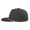 Poly dobby fabric with 5-panel deep dish structured crown. Flat brim visor and plastic snap back strap. Diamond paracord rope across visor. Logo is a raised matte silicone patch.