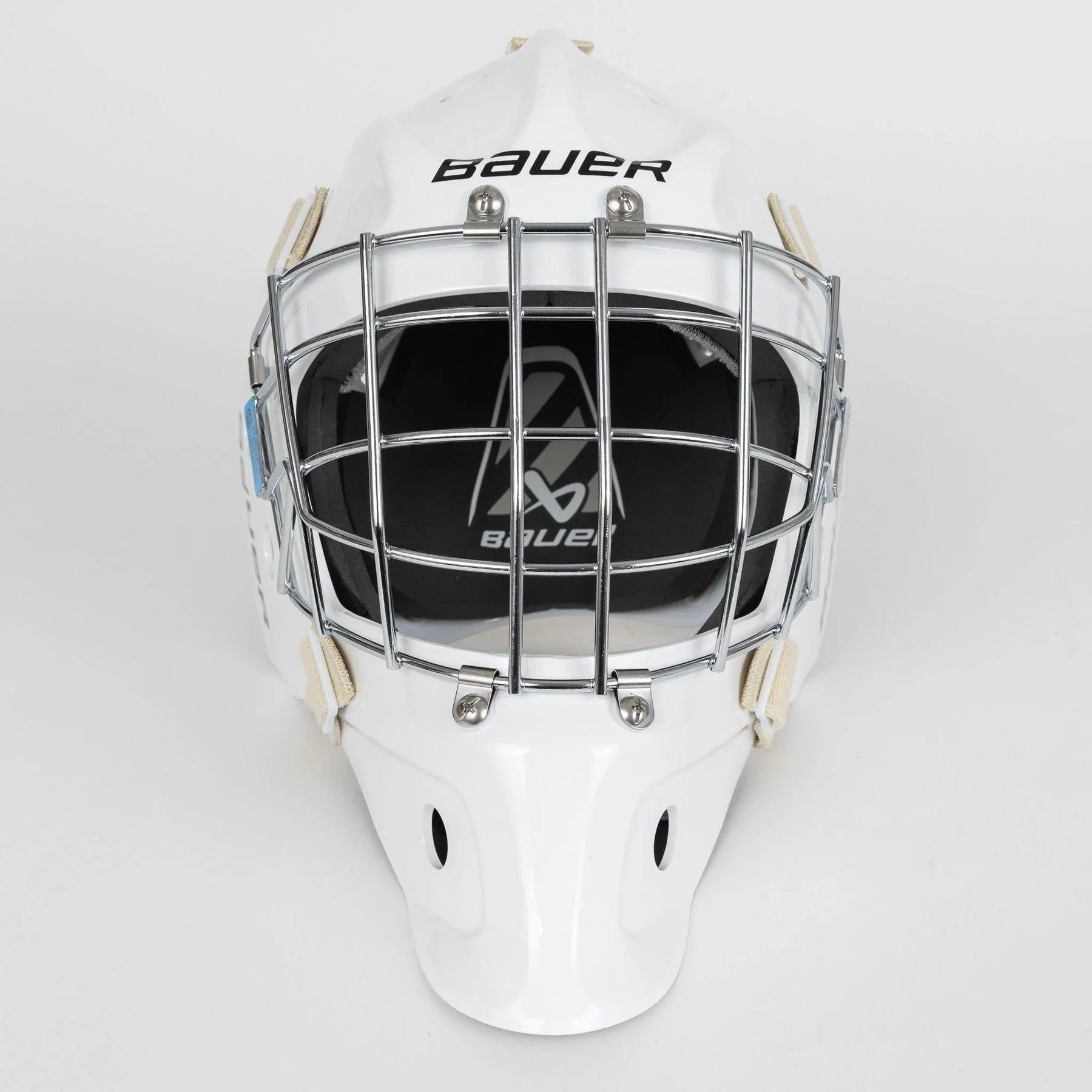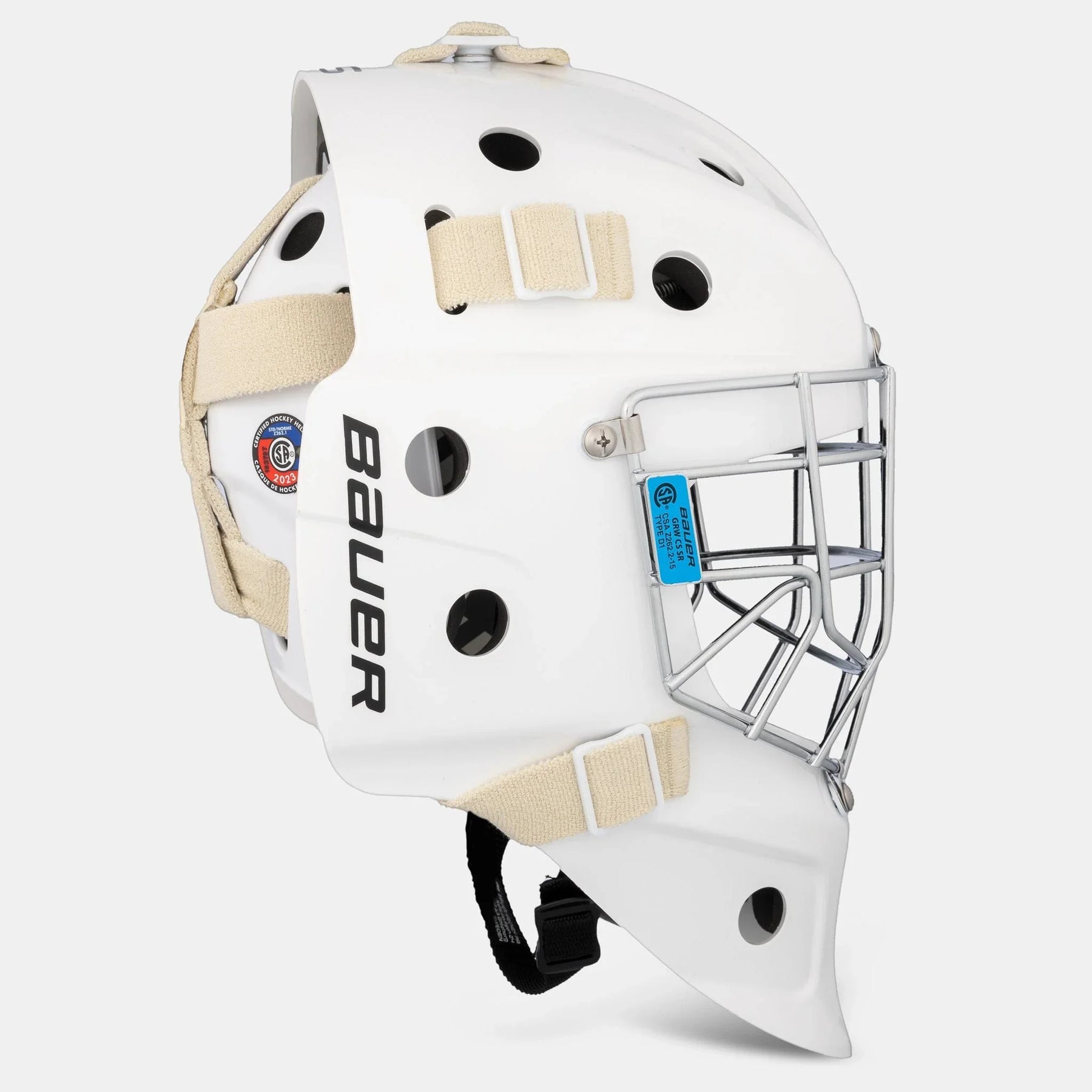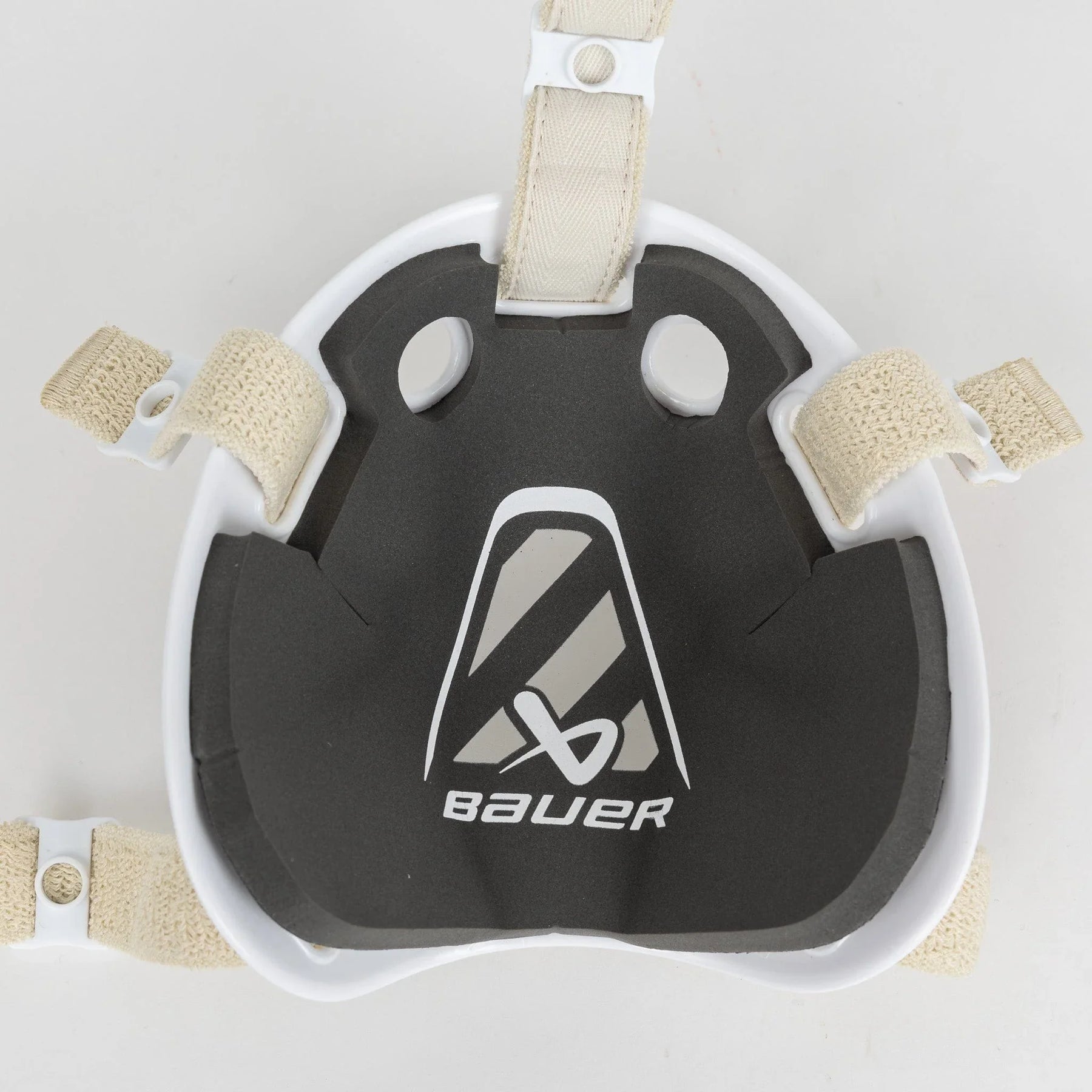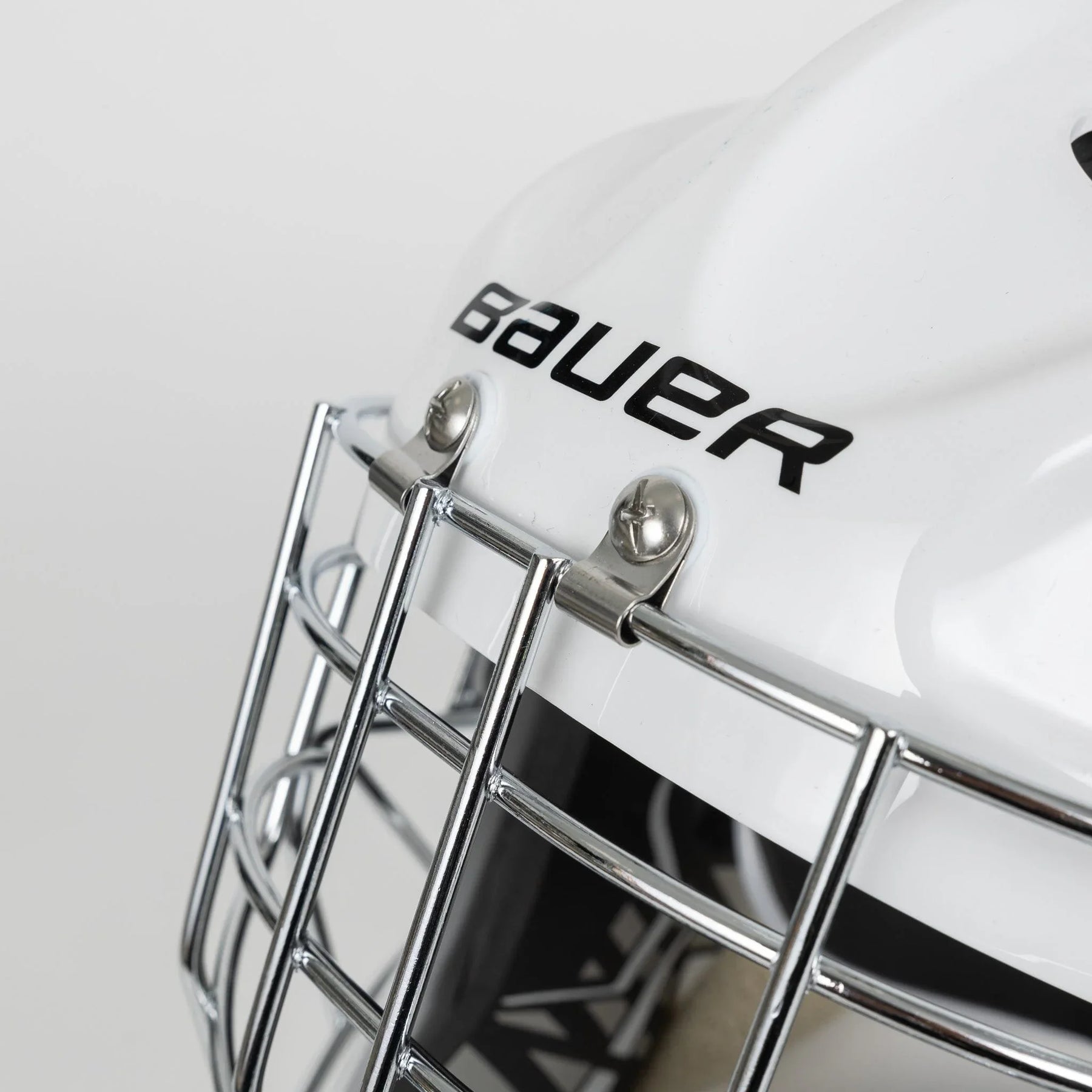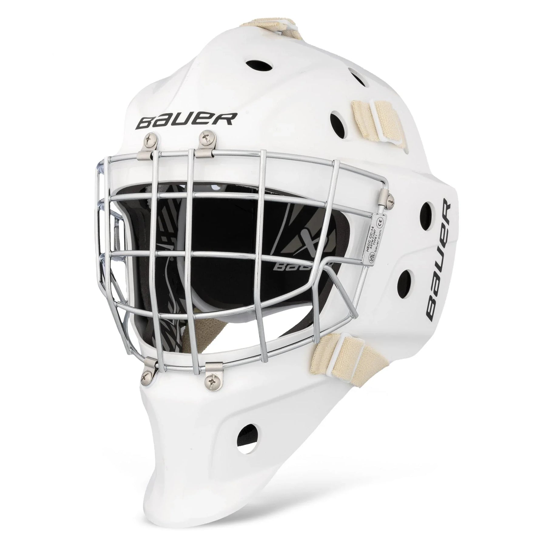 The Bauer 930 SR Goalie Mask comes in one standardized junior size. It is available in a White finish with Black Bauer logos.