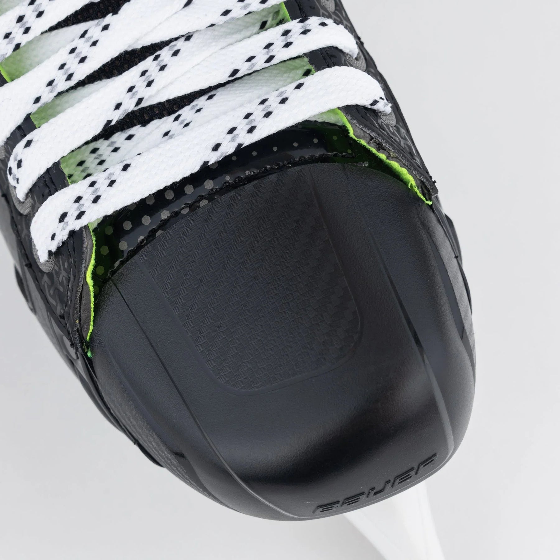 The Bauer Elite Intermediate Goalie Skates feature a clean black and dark grey pattern mixture across the boot, with green accents on the heel, tongue and side areas.