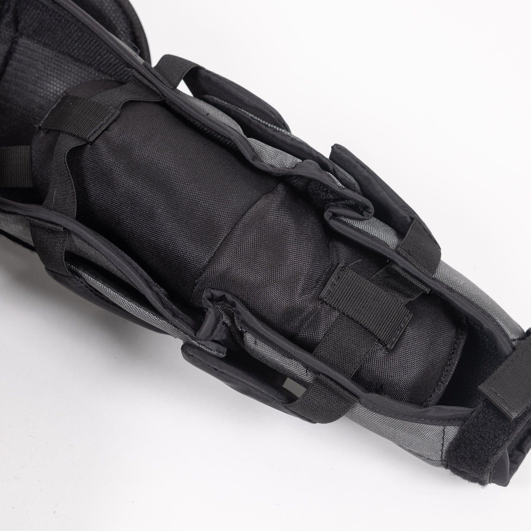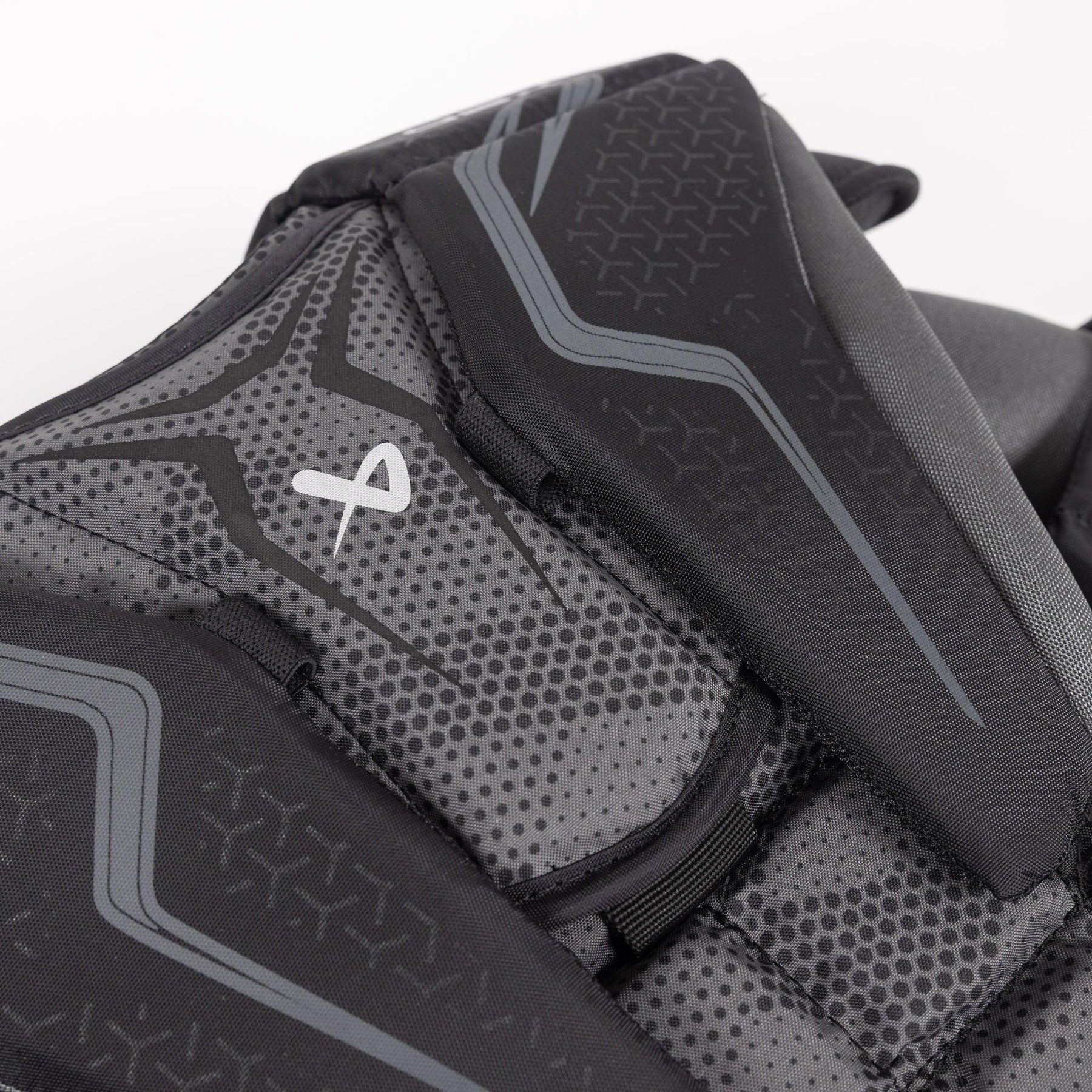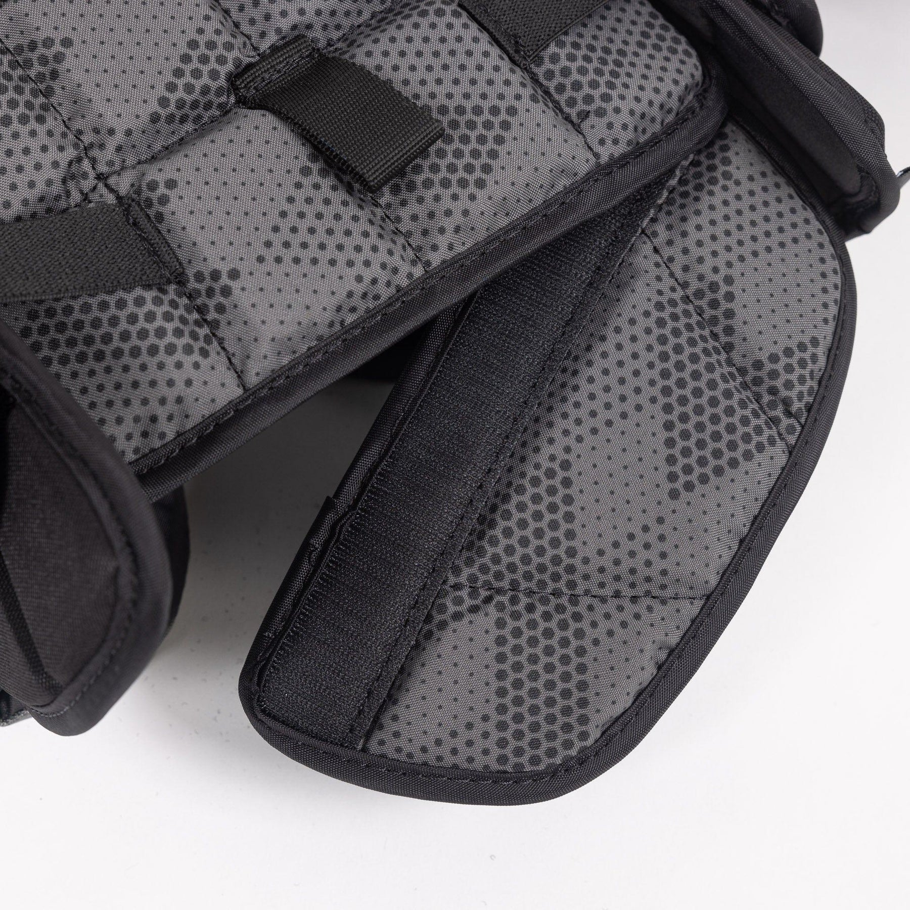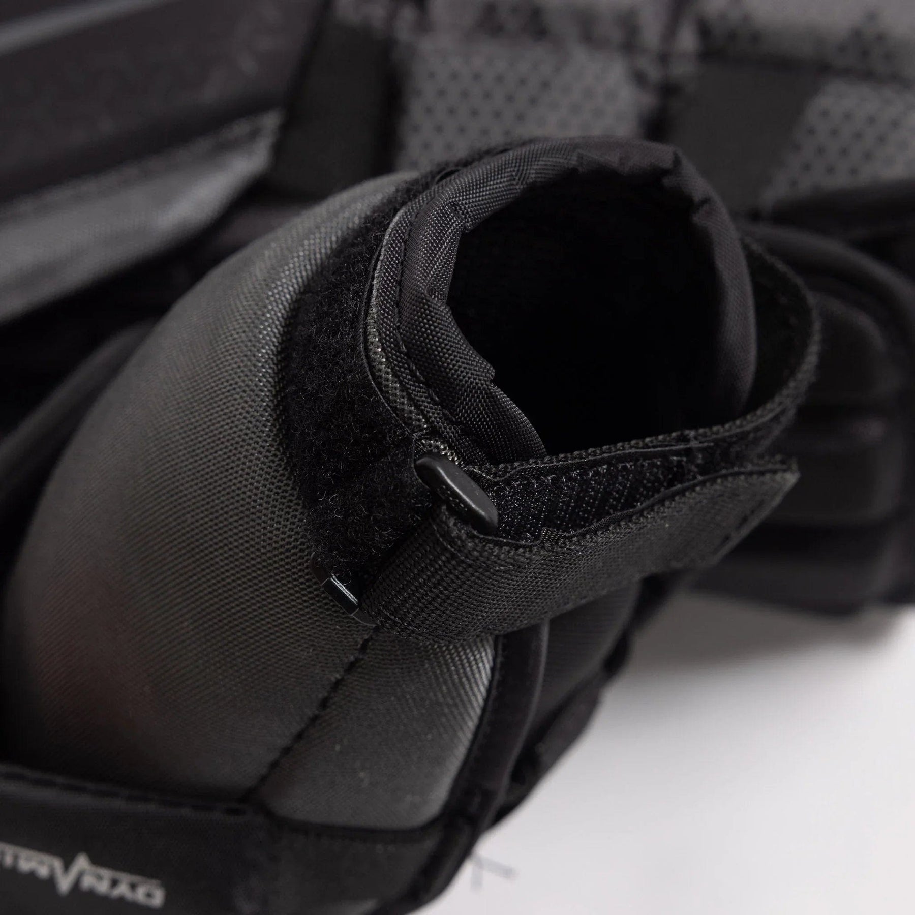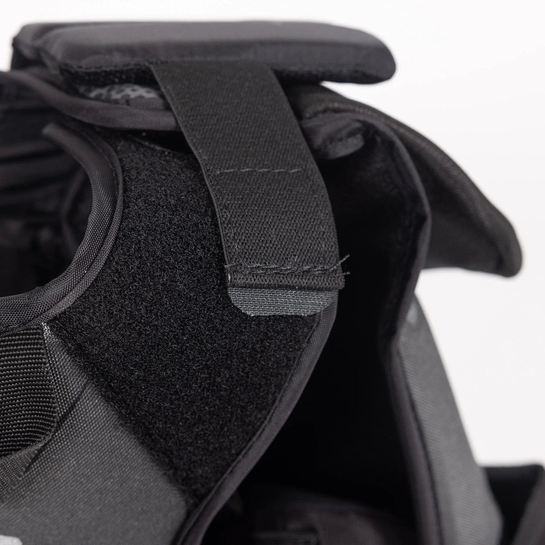 3. Make sure the shoulders of the chest & arm are sitting comfortably atop, and wrapped around your shoulders. This can be seen visually by looking at the collar of the chest & arm. You want the collar to sit slightly above your clavicle, but not too high that it interferes with the bottom of your goalie mask.