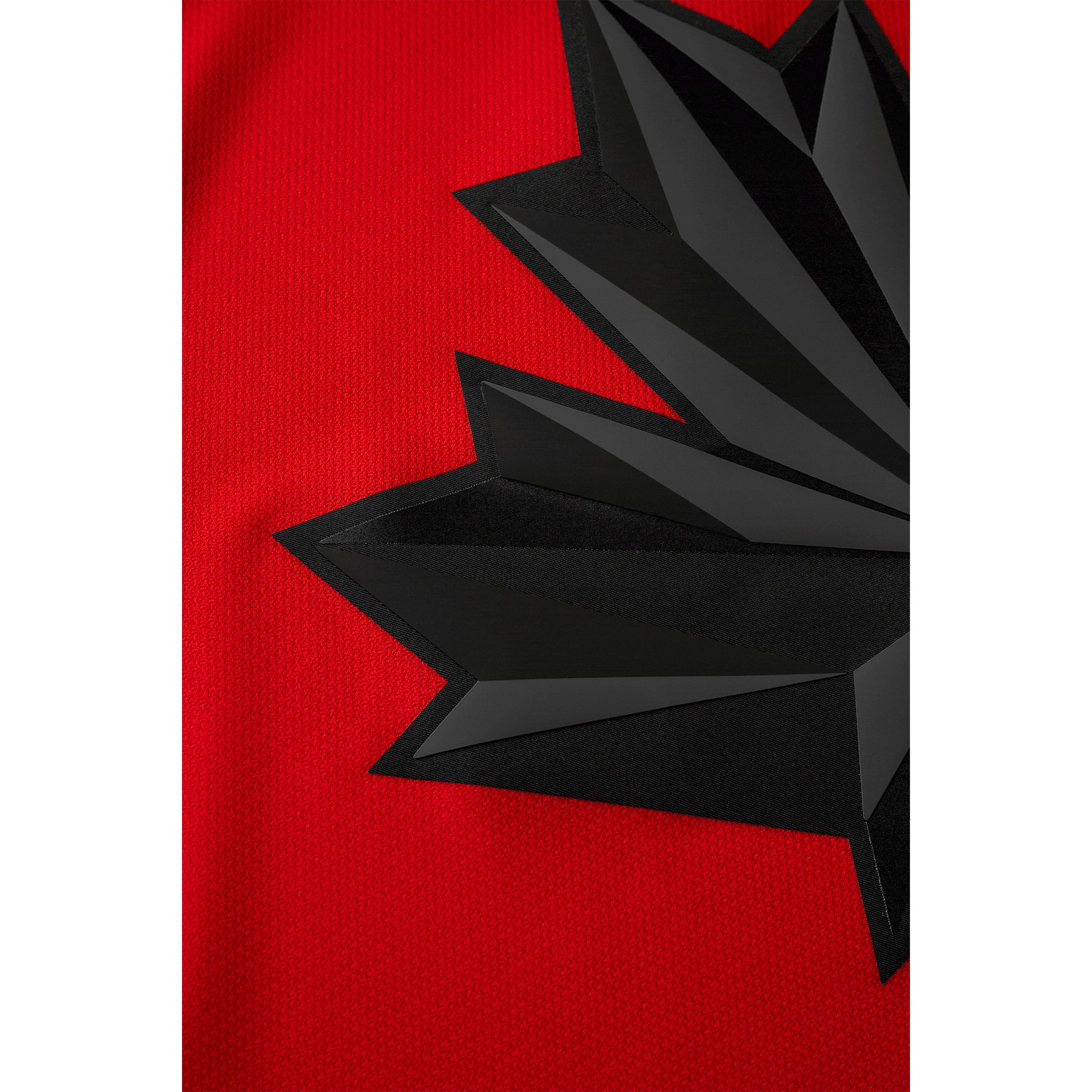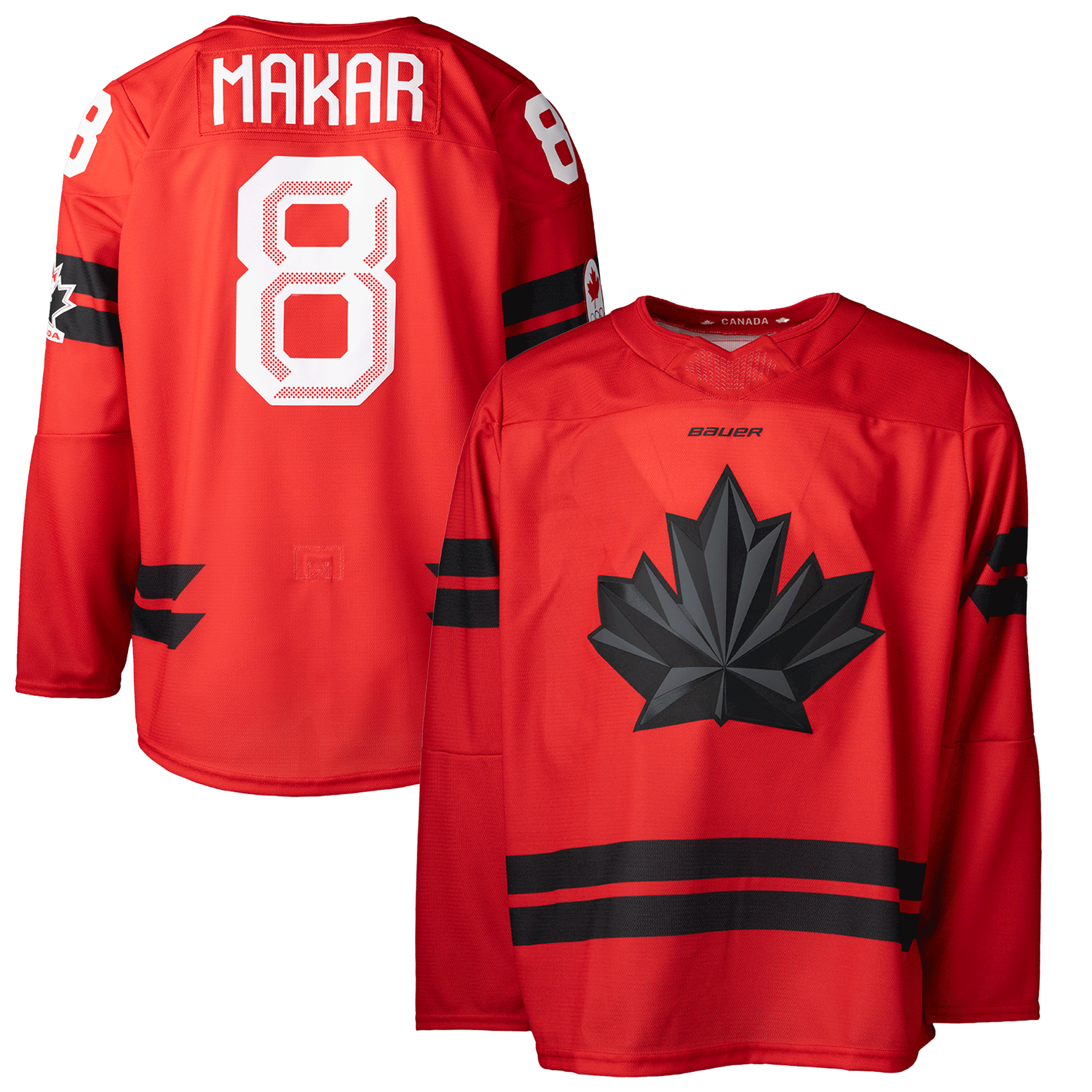 Team Canada red hockey jersey by Bauer with black maple leaf and number 8 Makar, TheHockeyShop.com