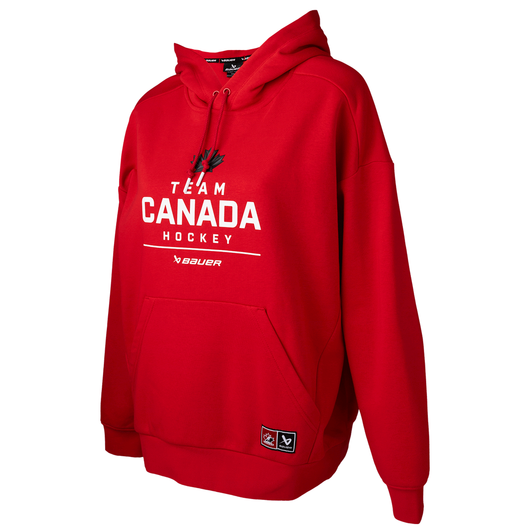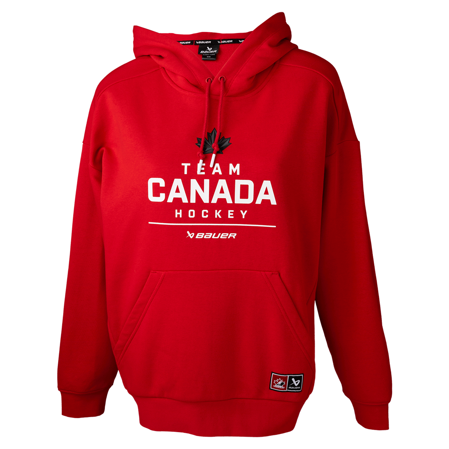 Serving players since 1988.Experience the soft-touch comfort in this Bauer Hockey Canada Olympic Stacked Womens Hoody that makes it a fan-favorite layering piece. This midweight Hockey Canada hoodie is perfect for moderate temperatures with a fleece lining for added warmth, whether you're at the rink or cheering from home. The adjustable drawstring hood and front pouch pocket adds extra comfort and convenience, while the ribbed cuffs and hem provide a snug fit.