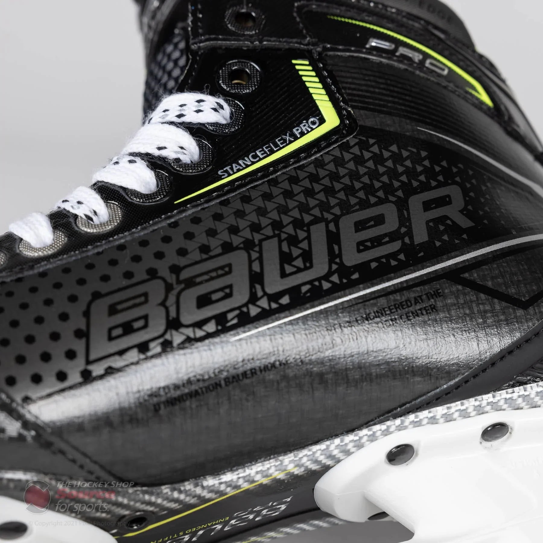 The Pro skate is designed for the elite level goalie who wants a stiff boot to both support their foot and provide the best energy transfer and thus the strongest pushes. Bauer uses a 3D Lasted Carbon Curv quarter which gives the boot its lateral stiffness while StanceFlex Pro technology allows the goalie to flex the boot forward with minimal restriction.