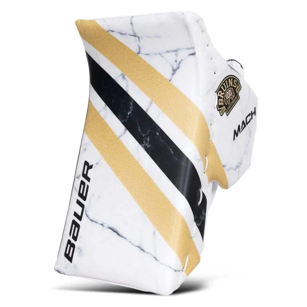 Serving players since 1988.This custom Bauer Supreme Mach pro stock goalie blocker is a pro return from NHL goalie Linus Ullmark. This Ultrasonic blocker is skinned as a Mach and features a thumb pillow, CURV composite blocker board, and Quattro Control palm. There is also Boston Bruins inspired DigiPrint graphics and colors throughout the blocker.