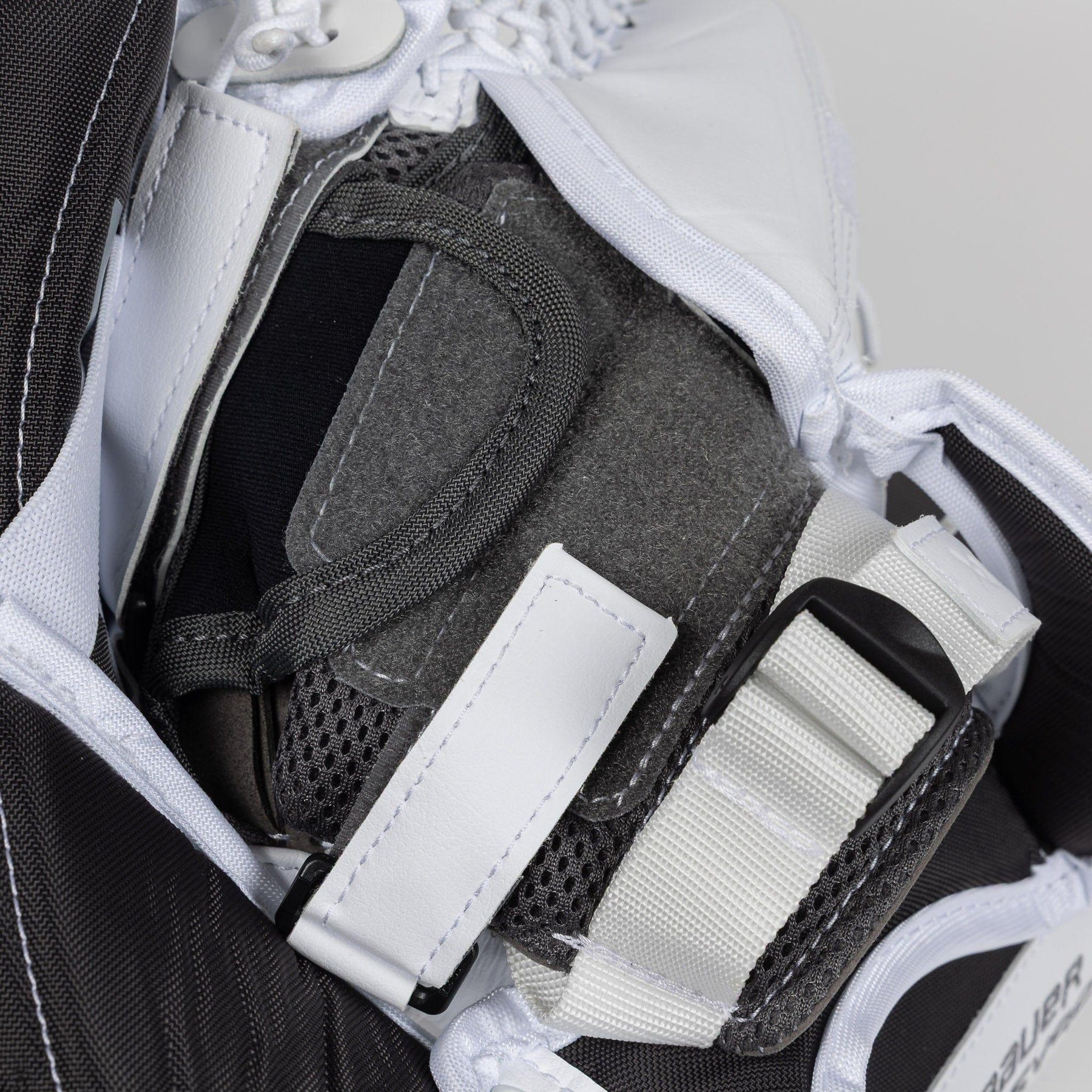 The palm is protected and covered with a polycarbonate palm. This design is constructed to keep the hands secure and in place, while the added padding helps goalies stay protected from impacts that may hit them in an uncomfortable area. Bauer also incorporated a Nash grip palm liner which helps goalies to be comfortable and protected while making saves.