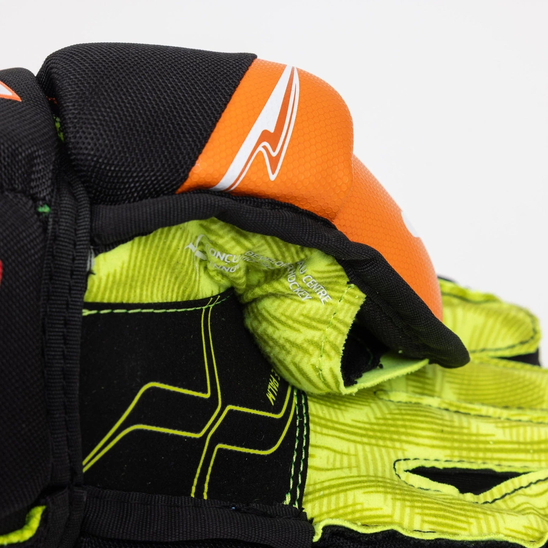 The backhand is protected with a pre-curved design with HD inserts. This adds layers of foams inside the glove providing protection to players and allowing them to feel secure and protected while on the ice. The pre-curved backhand design offers a natural and comfortable fit, allowing players to maintain mobility and flexibility while wearing the gloves.