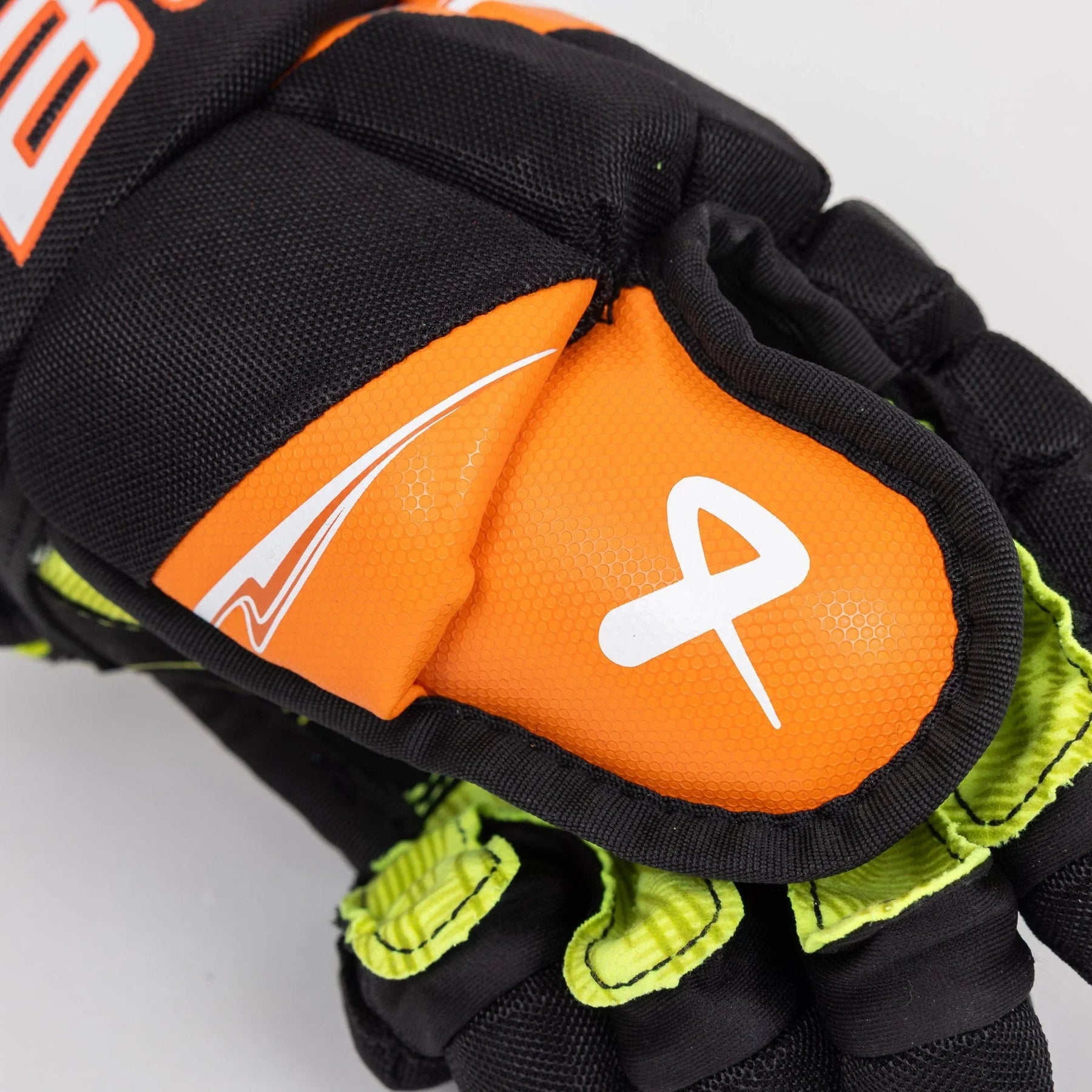 The gloves are equipped with MD foam and PE shield inserts in the fingers, in addition to a three-piece index finger design. The three-piece design helps enhance flexibility in that finger, allowing for more overall freedom when stickhandling.