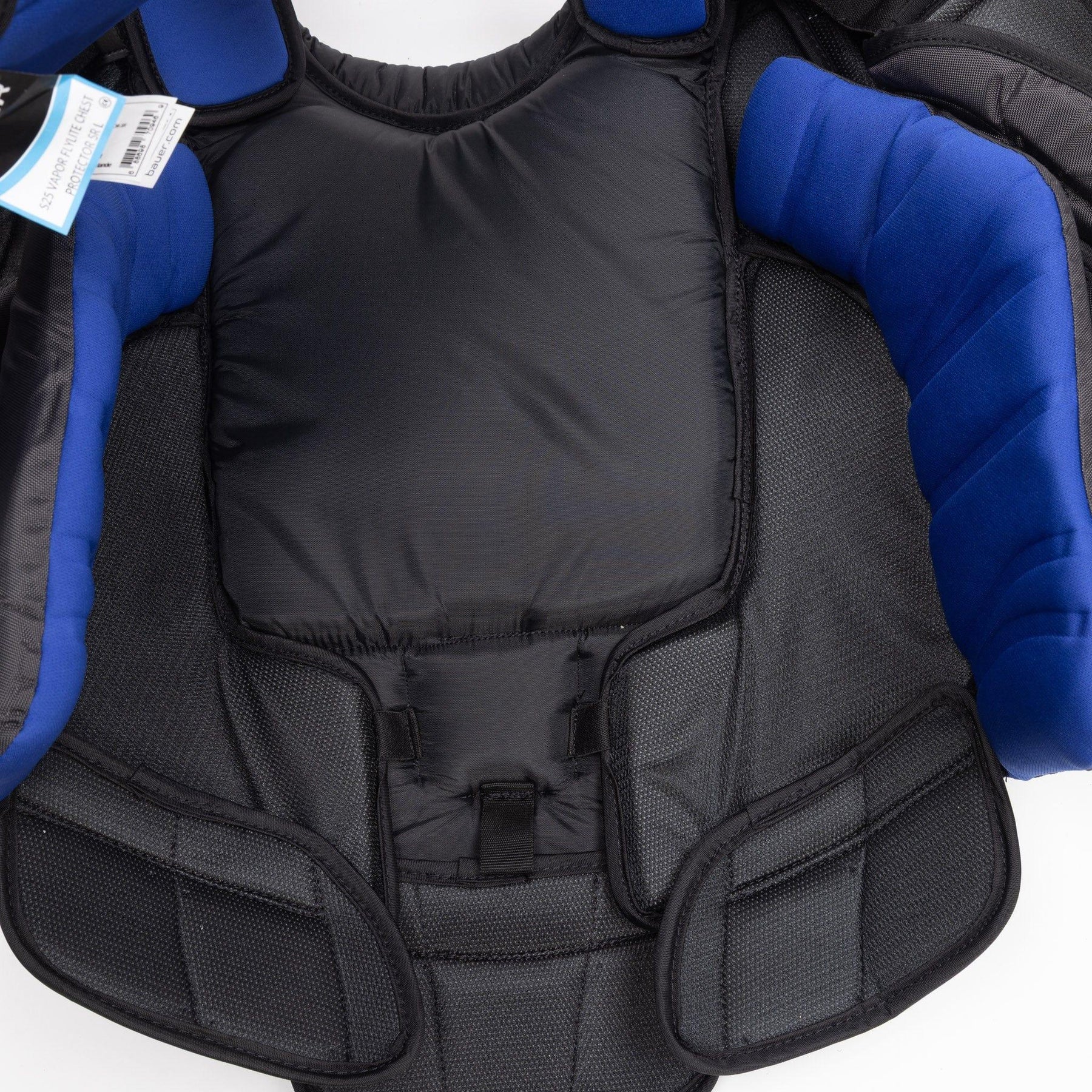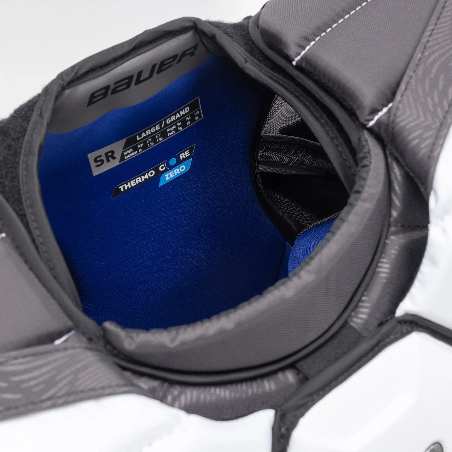 Inside the protector, we see that the spine is protected with an Airflow spinal protection. This design allows for top-notch protection in the key areas as well as aeration throughout the back. The sternum is also covered with an Aerolite shield, which is designed with HD foams to provide elite coverage from impacts, keeping goalies protected.