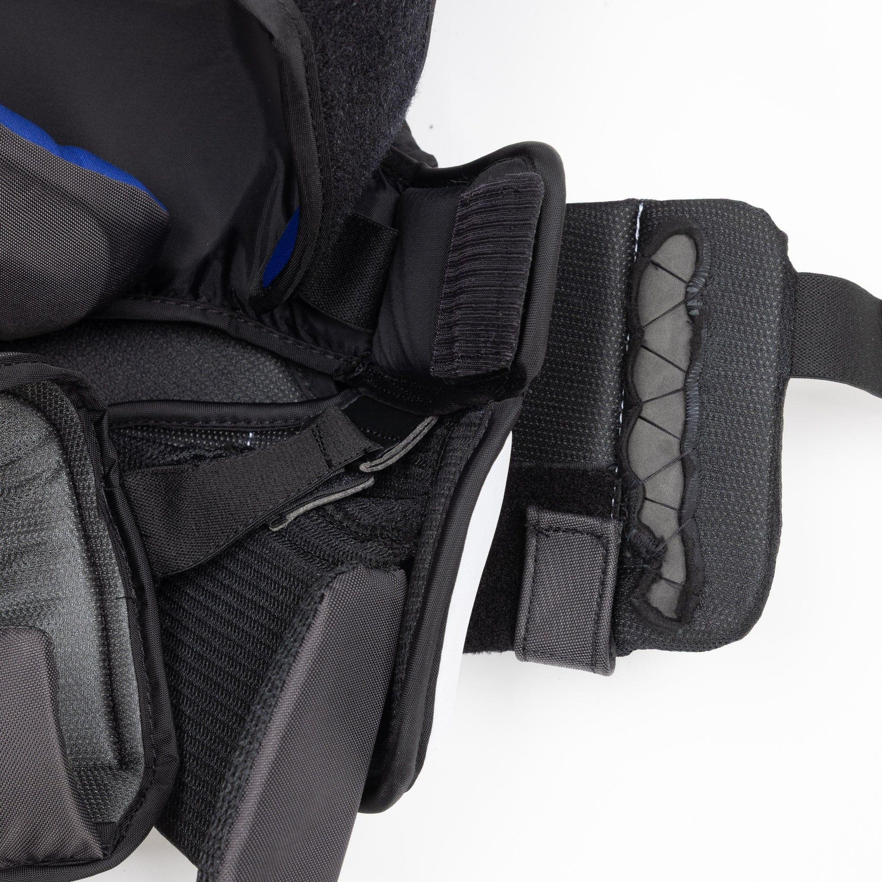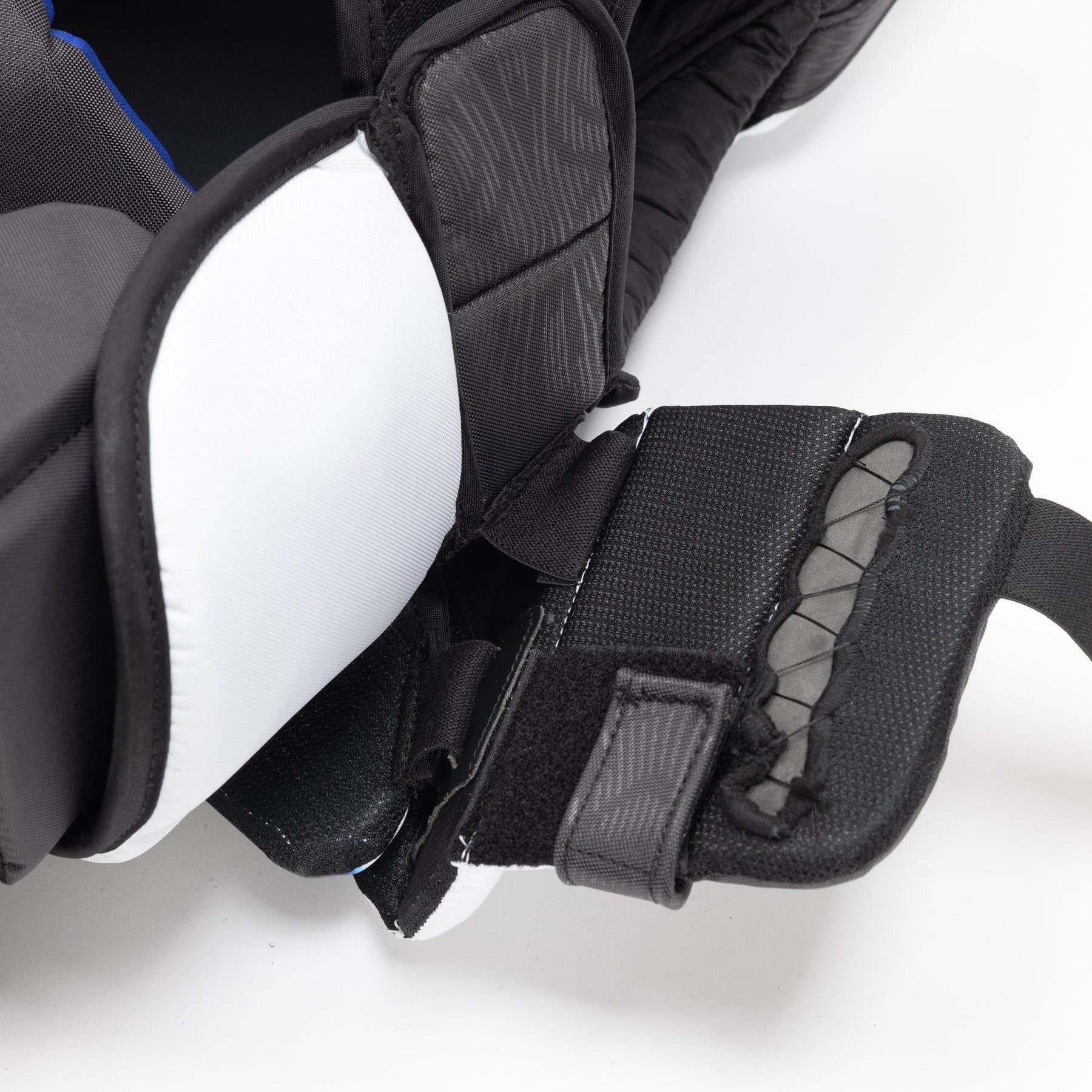 The arms are protected with reinforced floating CURV with Shocklite foam. The integration of CURV allows for a durable material to protect goalies from impact, while Shocklite is added throughout the arms to provide an extra layer of coverage from impacts.