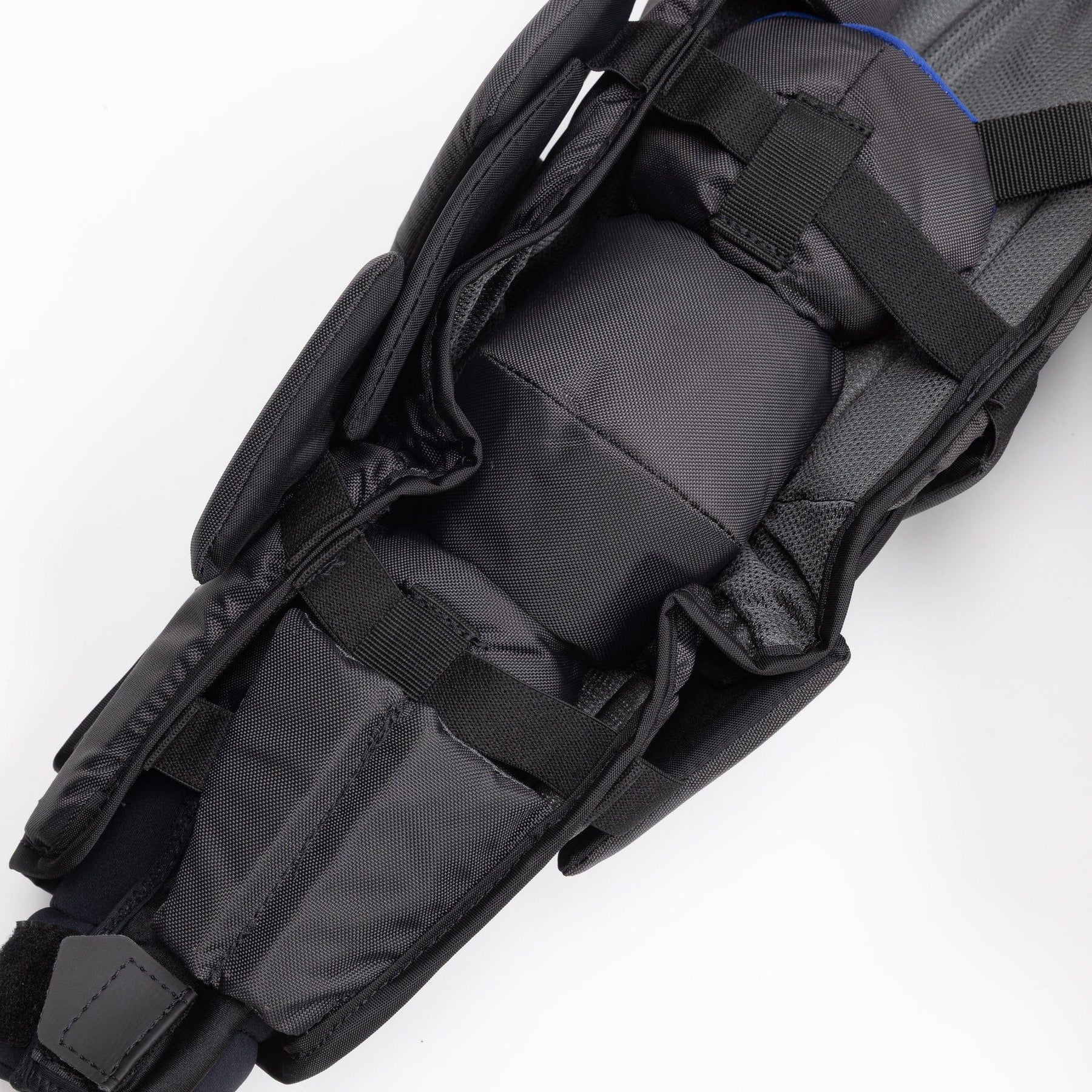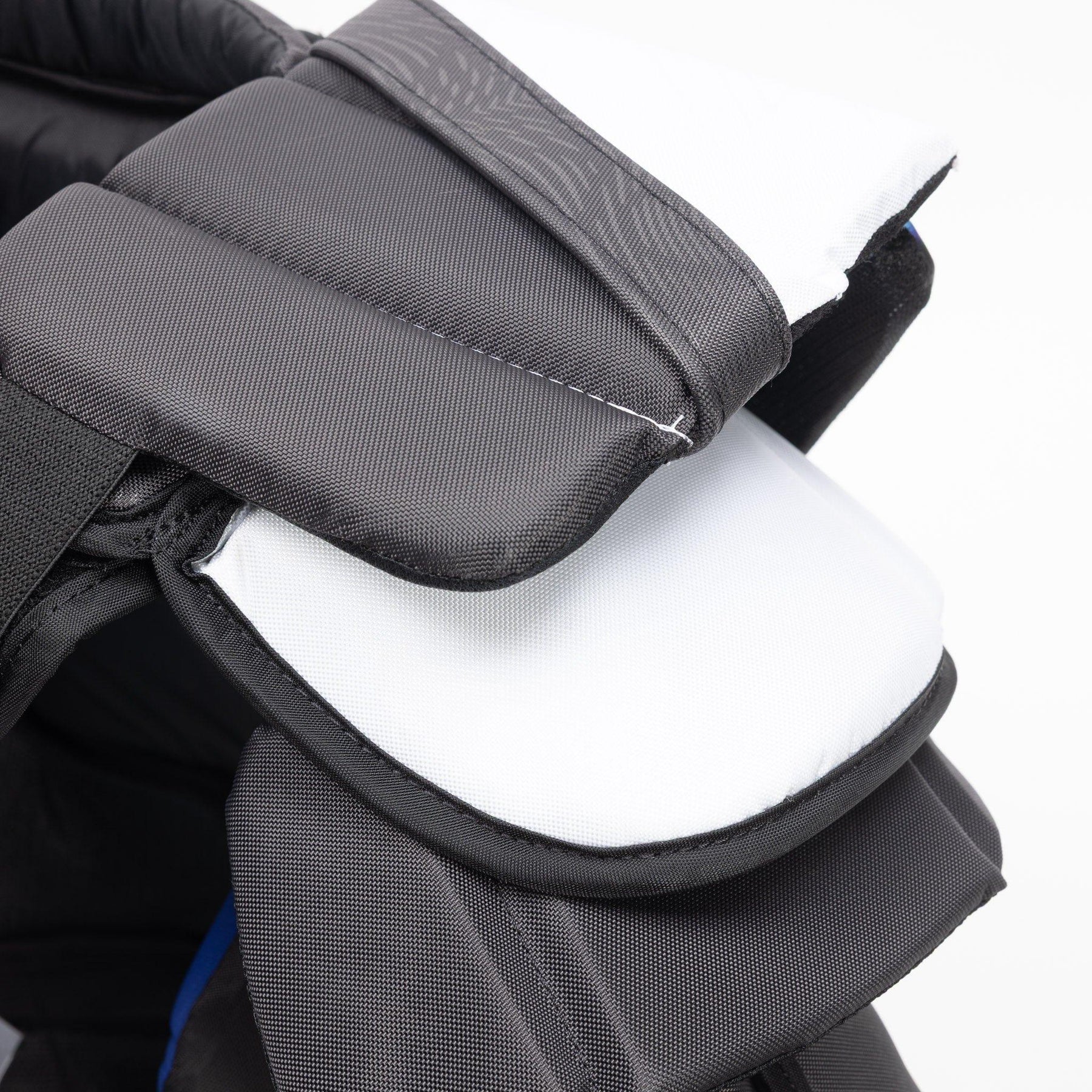 The arms are protected with reinforced floating CURV with Shocklite foam. The integration of CURV allows for a durable material to protect goalies from impact, while Shocklite is added throughout the arms to provide an extra layer of coverage from impacts.