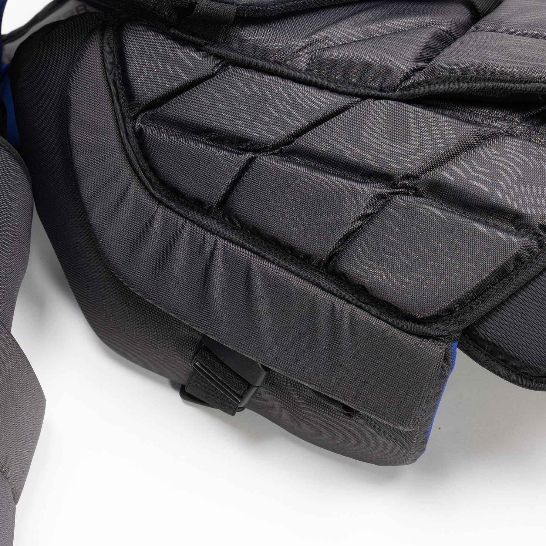 Inside the protector, we see that the spine is protected with an Airflow spinal protection. This design allows for top-notch protection in the key areas as well as aeration throughout the back. The sternum is also covered with an Aerolite shield, which is designed with HD foams to provide elite coverage from impacts, keeping goalies protected.