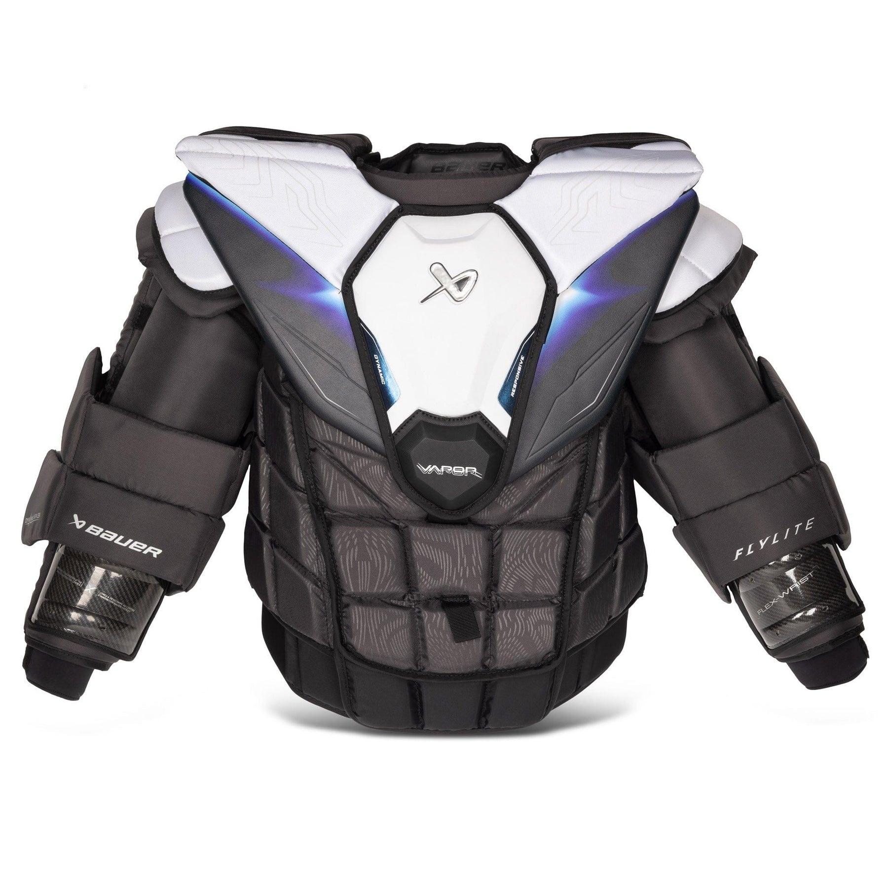 New for 2025 is the Bauer Flylite Chest & Arm Protector. This protector is designed to provide goalies with elite-level protection while featuring top-of-the line specs to give goalies an overall high quality protector. The Flylite protector features an Aerolite sternum shield, Dynamic 3-point flex arm floaters, and a new FlexWrist with 360 protection.