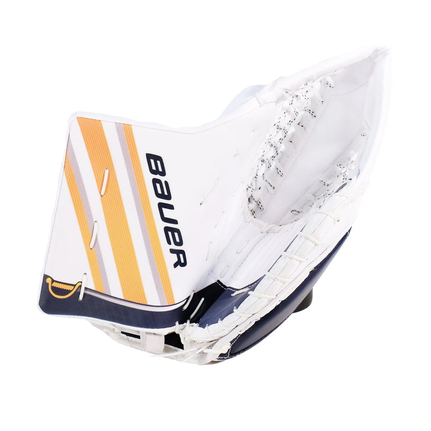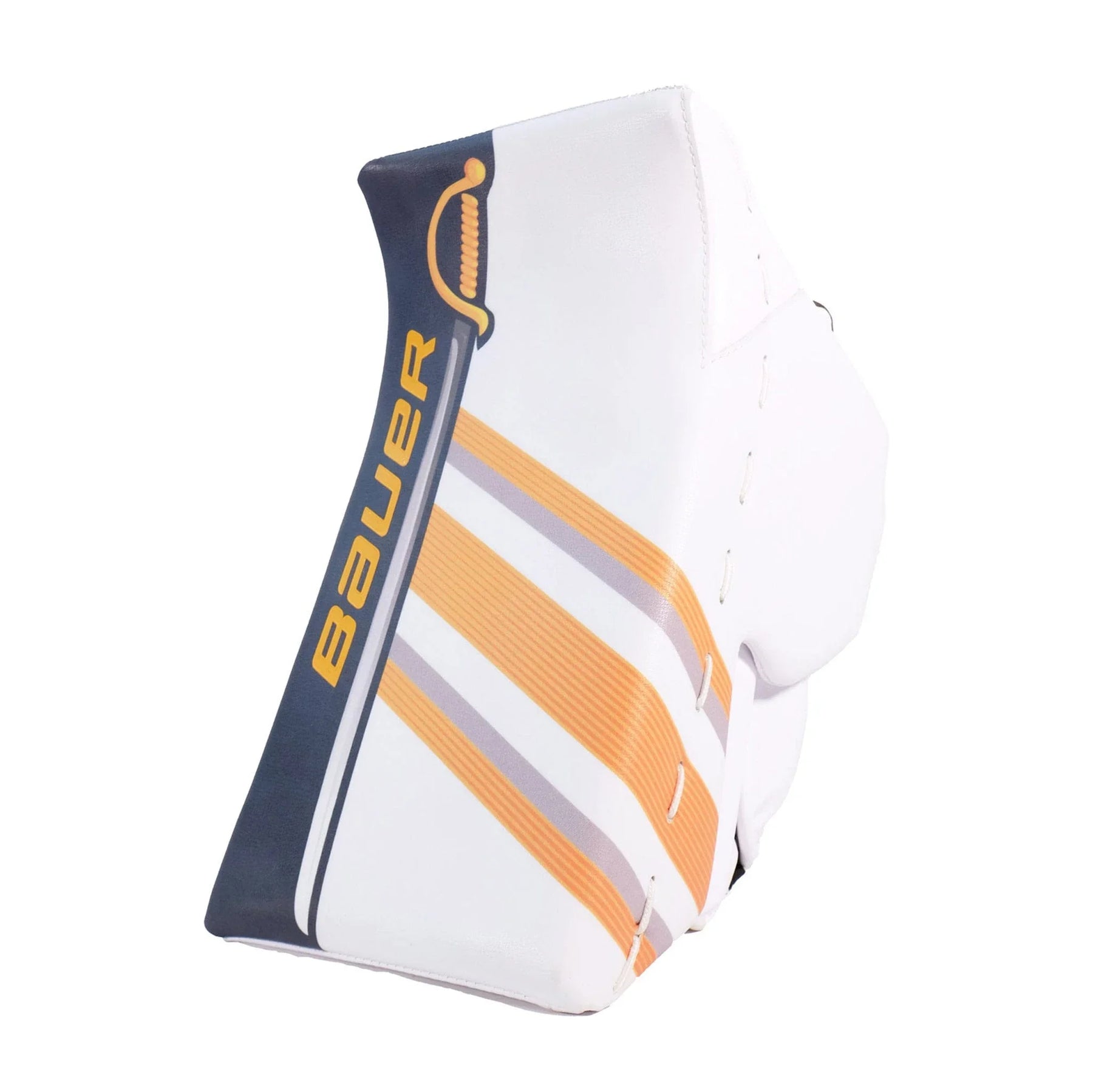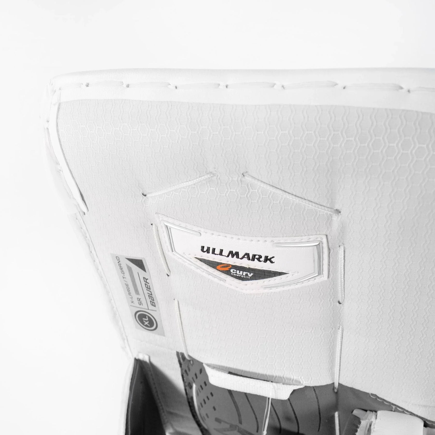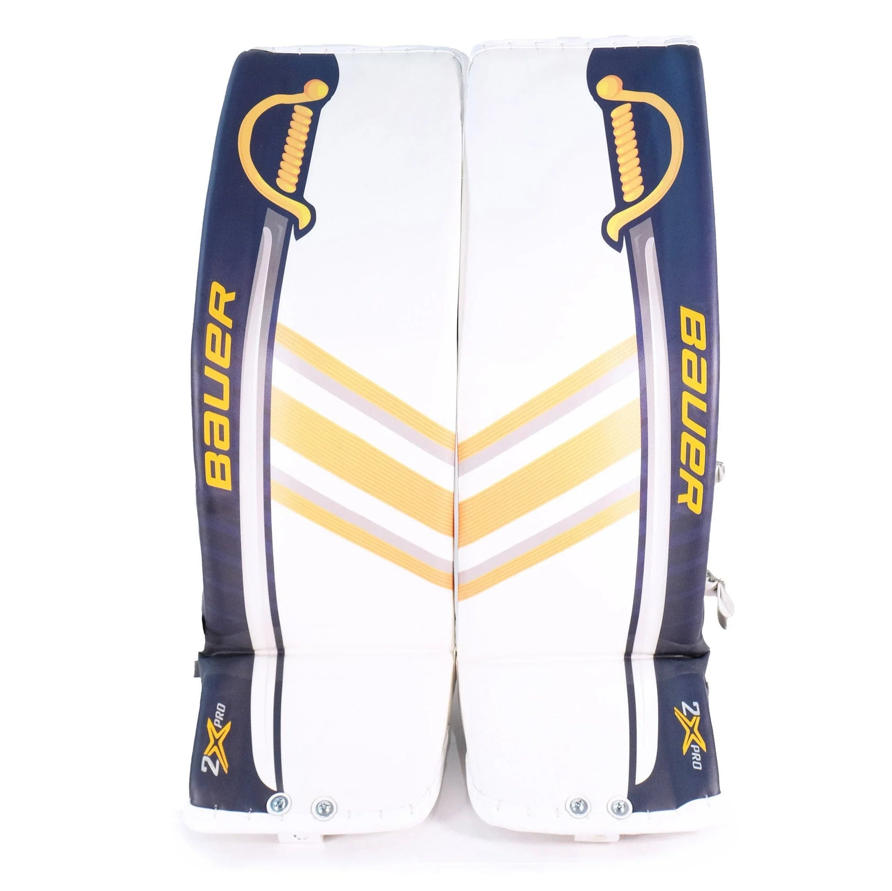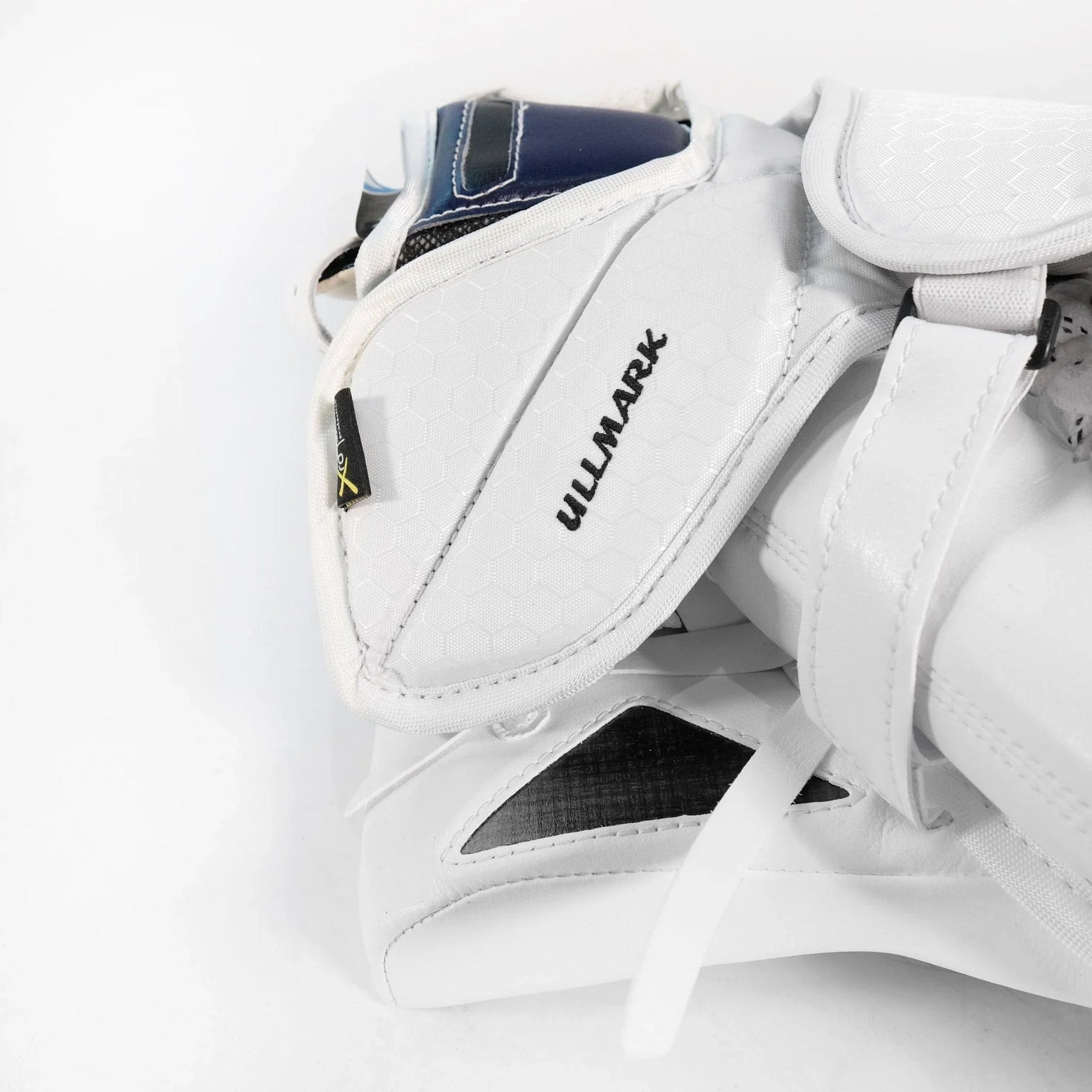 It's hard not to be taken at first glance by the astounding navy and gold sabre graphics along the outer roll of the leg pads. The Ullmark leg pads are perfect for that goalie looking to add some flair to their style and who prefers a more snug fit. The pads not only have swords in their arsenal, but also a sewn-in knee wing, a bolted toe bridge, and a 1X Pro knee block. The leg channel and strappings have been furnished with quite a few custom features to achieve that snug fit, including extra padding in the leg channel, a larger calf pillow, extra leather straps over the standard velcro, and a shorter, replaceable Tune Fit strap. The XL-size pads are labelled with flex profile 3 but may feel slightly stiffer.