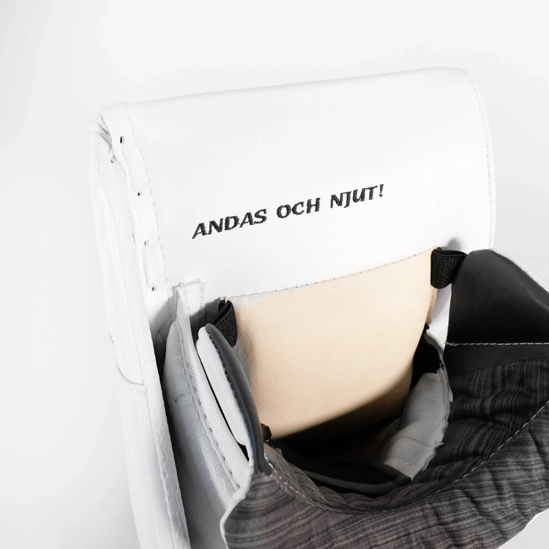 One major focal point on the Ullmark pro stock blocker is the custom embroidered Swedish text "Andas och njut!", meaning “Breathe and Enjoy” in English. Beyond the embroidery, the blocker perfectly fits with the leg pads and catcher with its own sword down the inner side of the face. In terms of custom features, the blocker also has extra backhand foam, a more angled index finger strap, and an additional thumb pillow, all to enhance the snug feel of the gear.