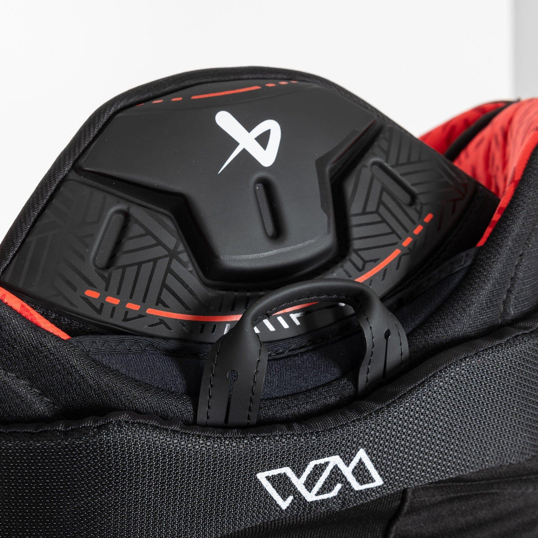 The spine is protected with an independent spine piece with molded HD foam inserts. This padding is designed to sit at the top of the pant, protecting your lower pad, spine, and surrounding areas. The durable foams absorb impacts and keep the player protected and secure when on the ice.