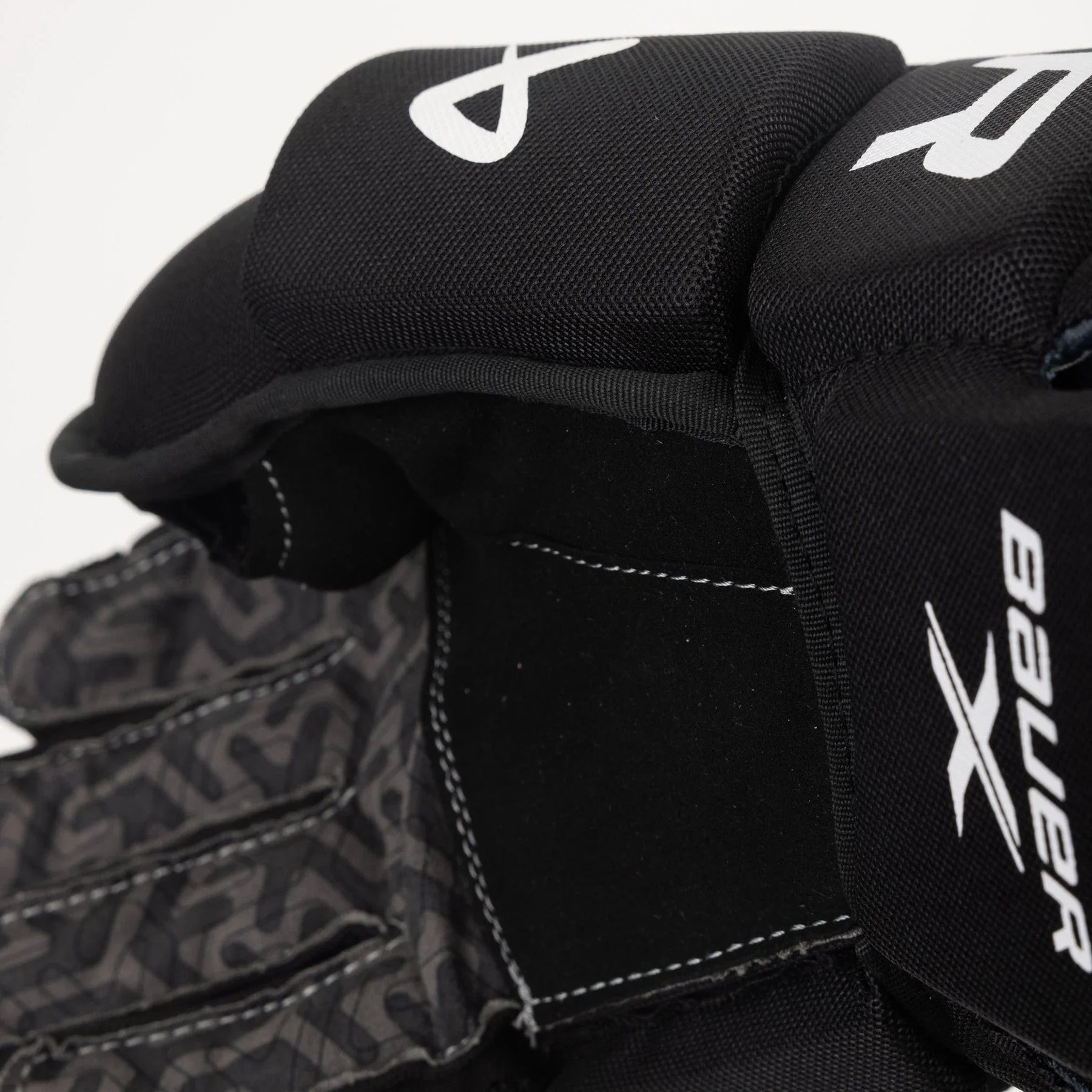 The Bauer X is designed to protect the fingers and includes MD Foam with PE Inserts. This means that the glove is snug in the fingers and backhand, and open in the cuff region. The fingers and backhand are protected with mid density foam, providing durability and support while also offering protection.