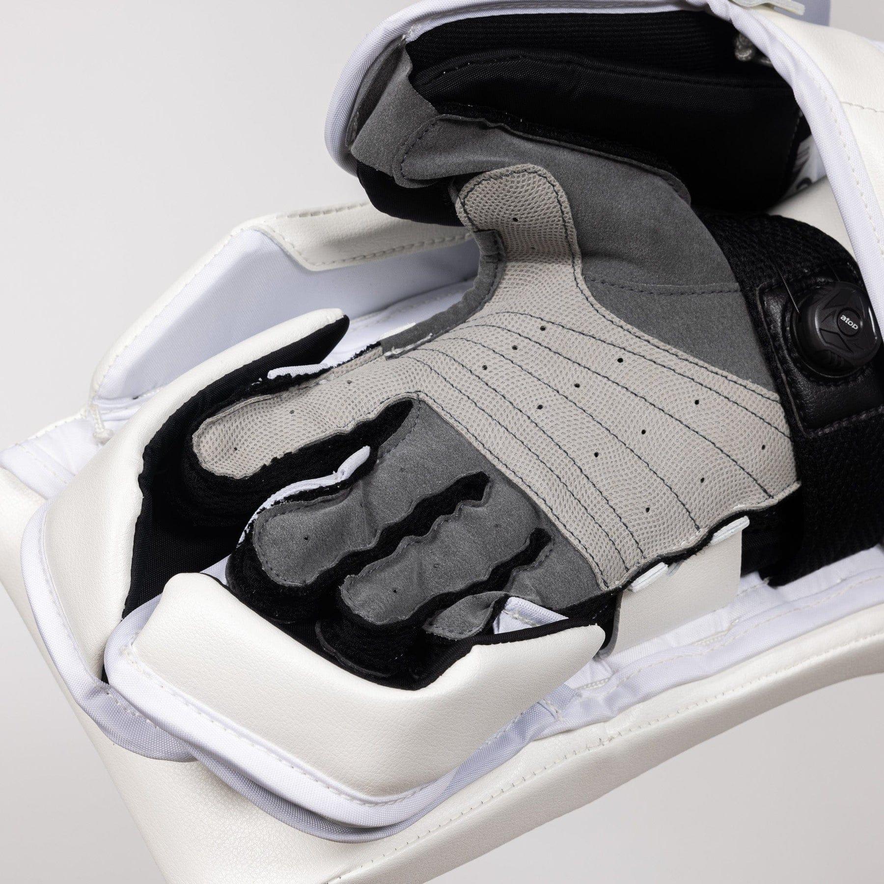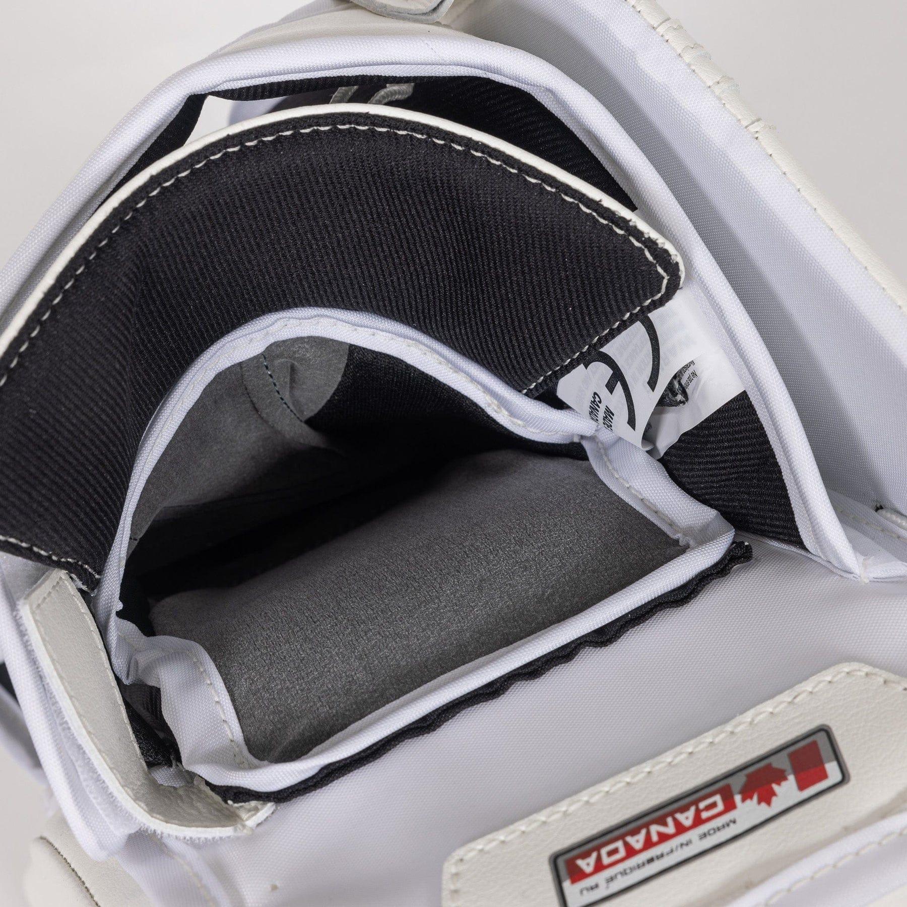 The redesigned, ultra-rigid HD sidewall, internally laced for added reinforcement, offers an extra layer of defense against powerful shots, ensuring that goalies can confidently deflect pucks away from the net at multiple angles without compromising safety. Additionally, the blocker includes a removable thumb pillow secured with Velcro between the thumb and blocker palm, providing customizable comfort and protection.