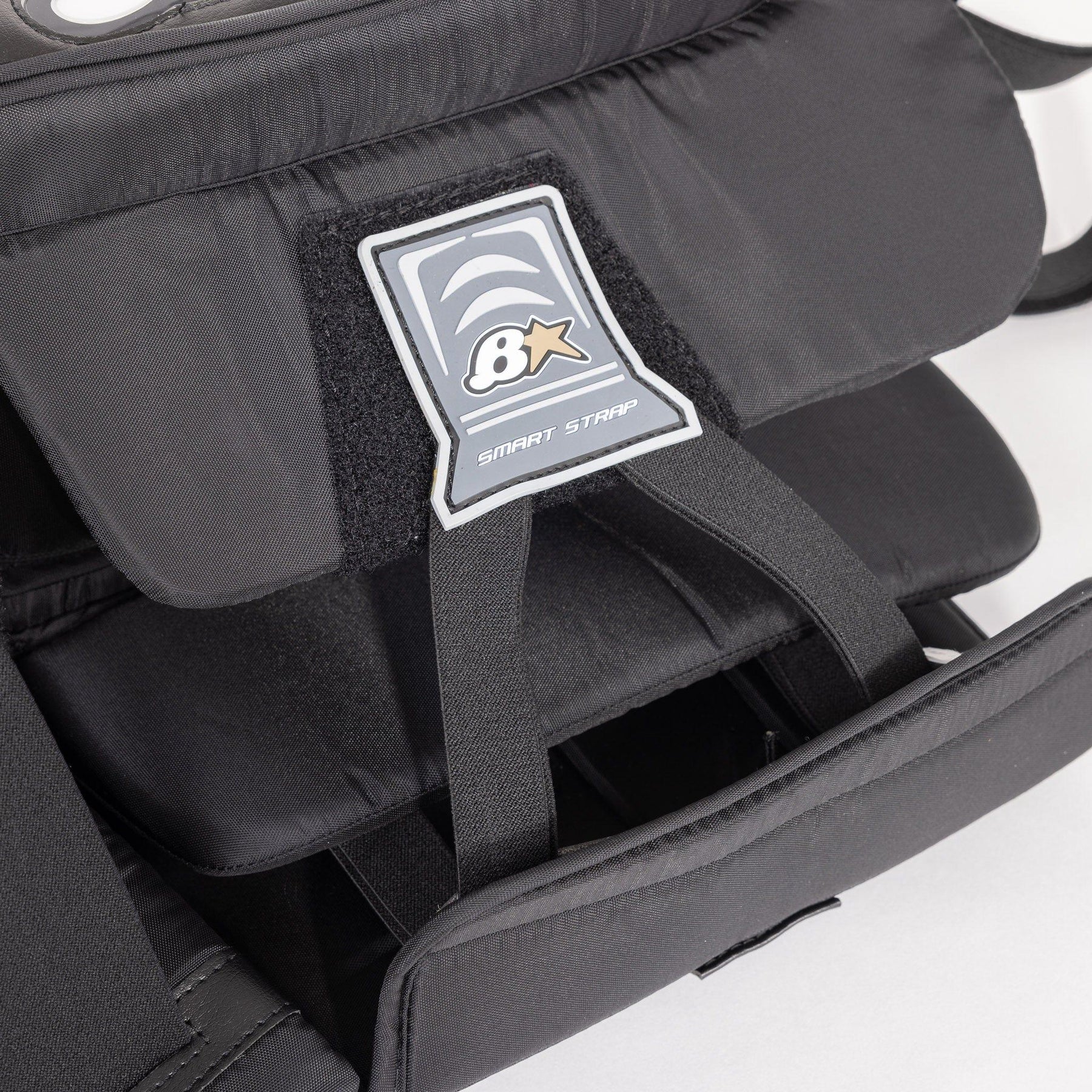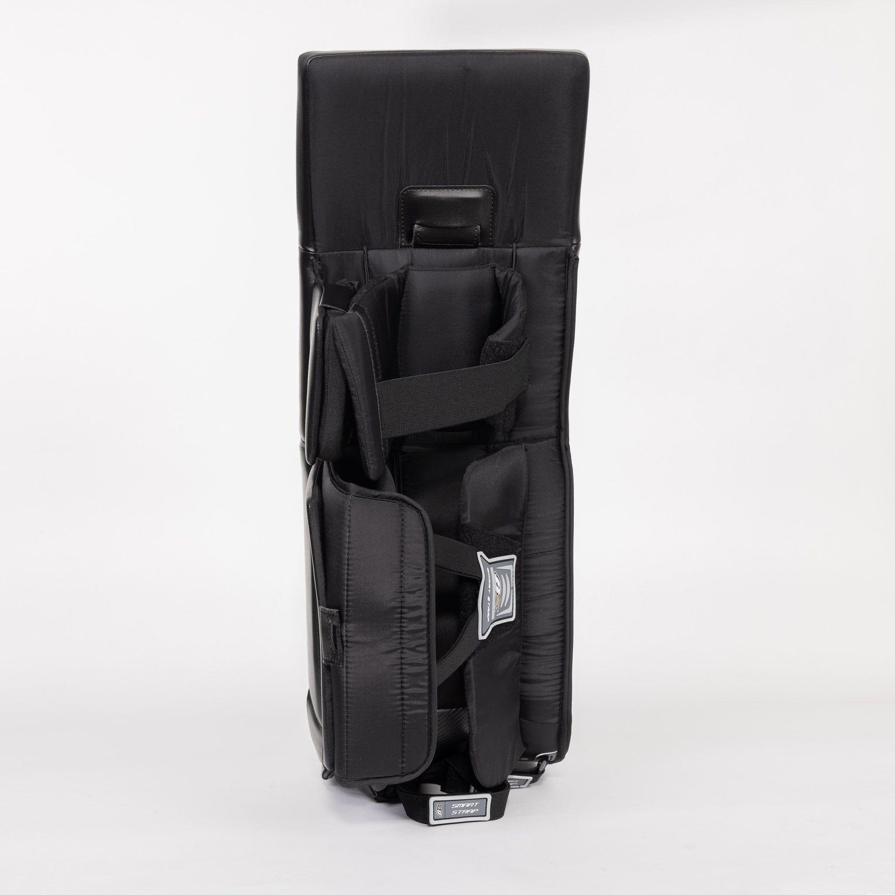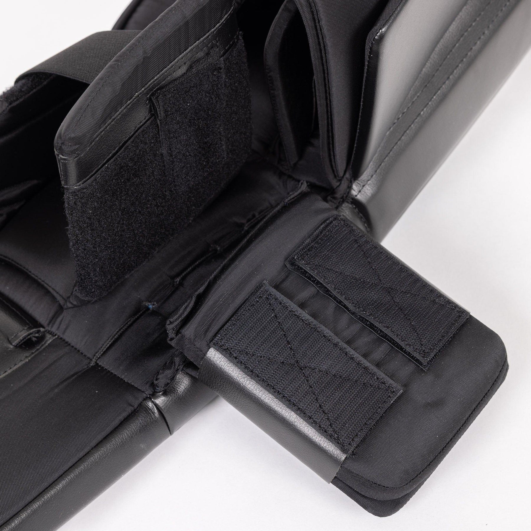 2. Next you want to get in your stance, keep your hands in a ready position, and drop to your butterfly. Without moving your legs to correct your butterfly, bring your heels together. This is where you assess your knee position. For a proper fit, you want the middle of your knee to sit directly on the center of the knee stack. If you’re looking for growing room, you want the middle of your knee to land roughly 1.5” below the center of the knee stack (1” for JR).