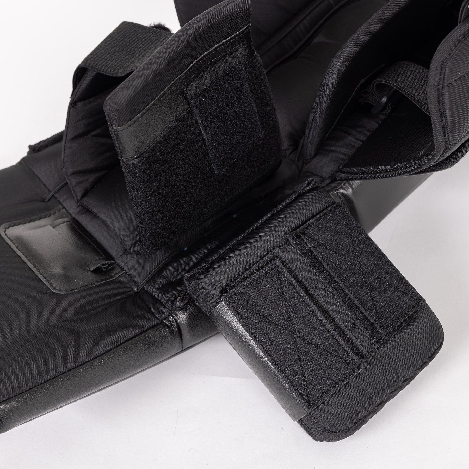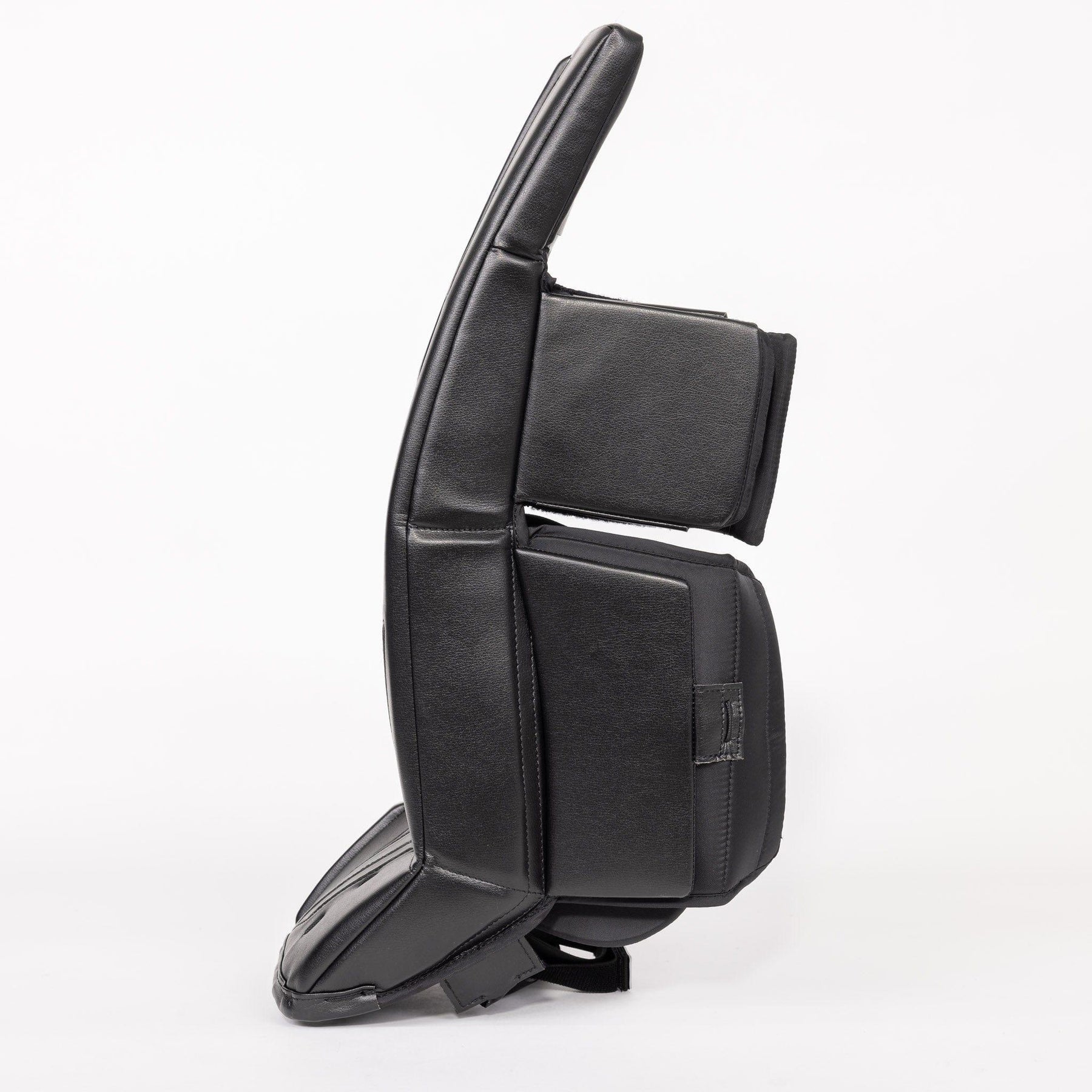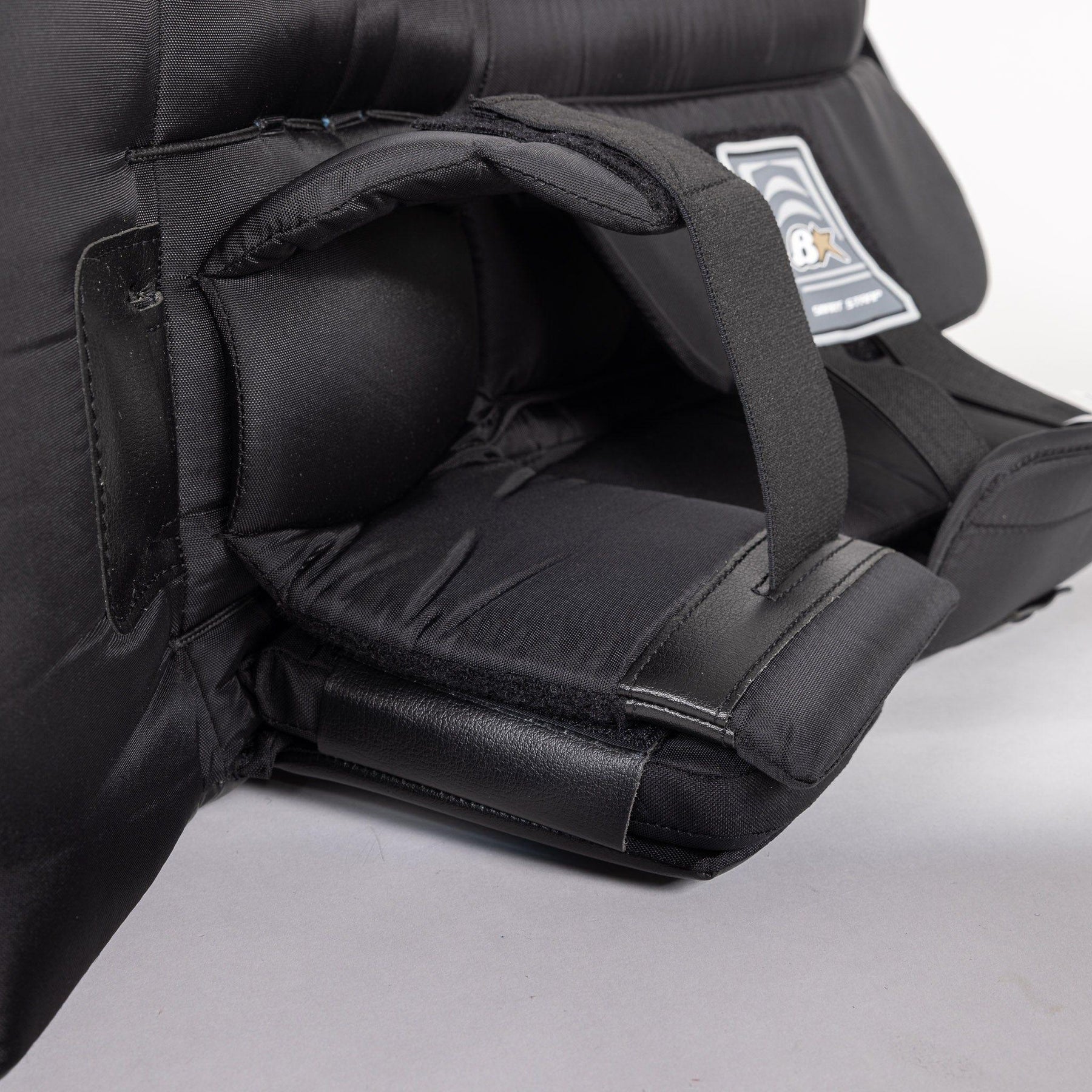 2. Next you want to get in your stance, keep your hands in a ready position, and drop to your butterfly. Without moving your legs to correct your butterfly, bring your heels together. This is where you assess your knee position. For a proper fit, you want the middle of your knee to sit directly on the center of the knee stack. If you’re looking for growing room, you want the middle of your knee to land roughly 1.5” below the center of the knee stack (1” for JR).