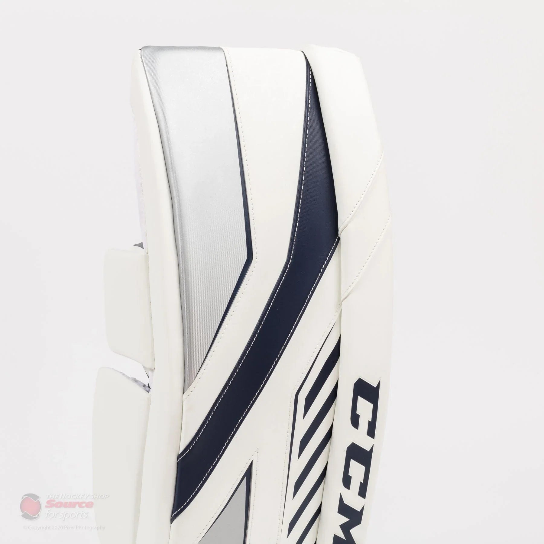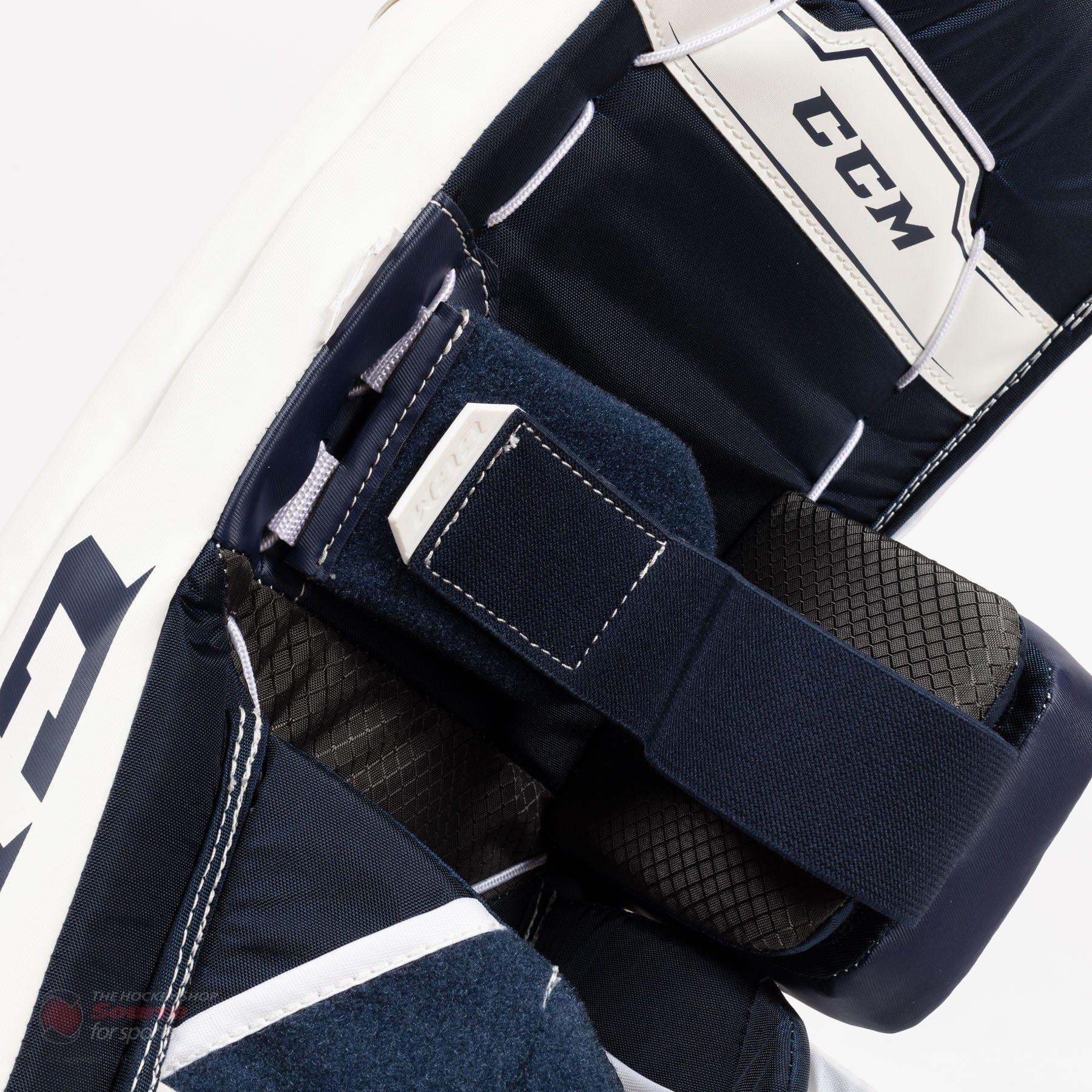 Velcro strapping has become very popular in the goalie world, and CCM is not lagging behind here. The QMSS system provides a familiar loose feel but is limited to 3 total velcro straps. The pad also features velcro bungee cords to limit hip strain as well as