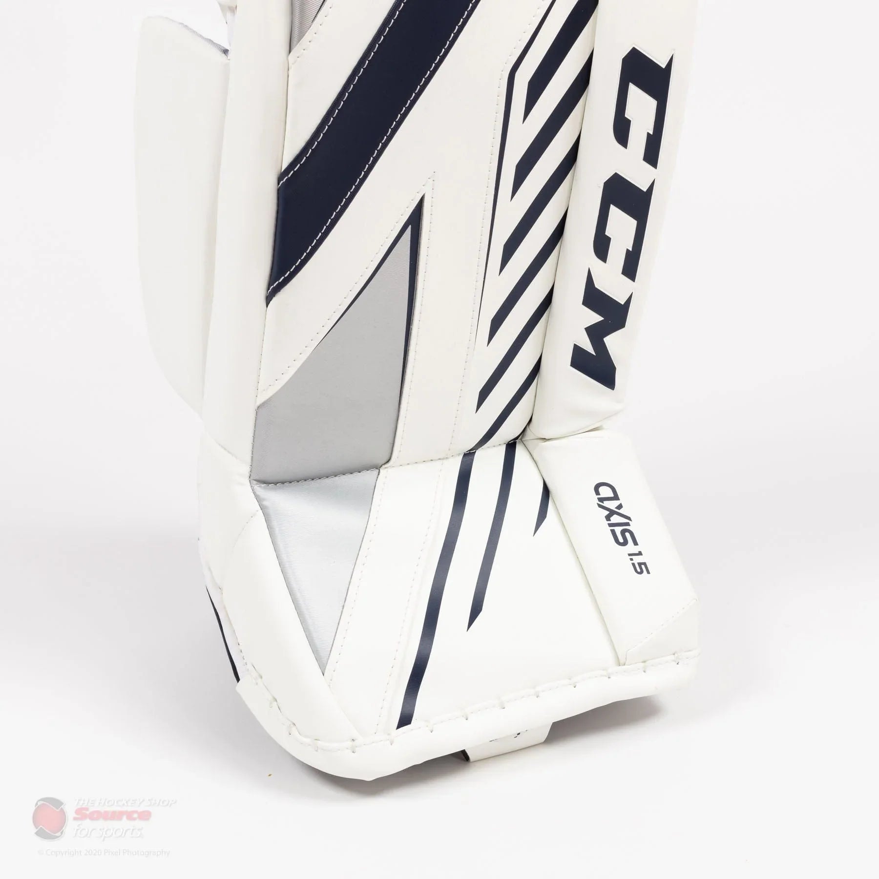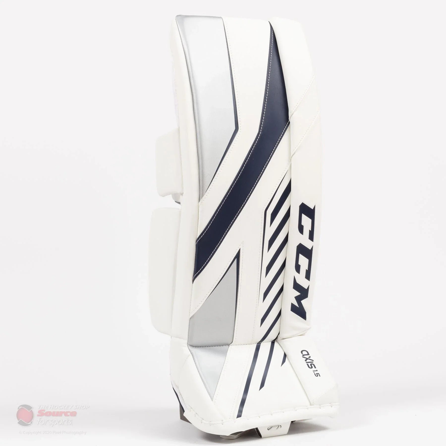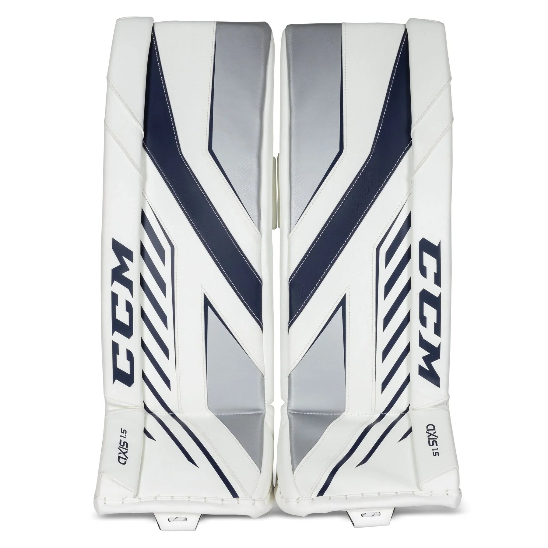 CCM Axis A1.5 Junior Goalie Leg Pads White / White / Navy / Silver / 26+1 - The Hockey Shop