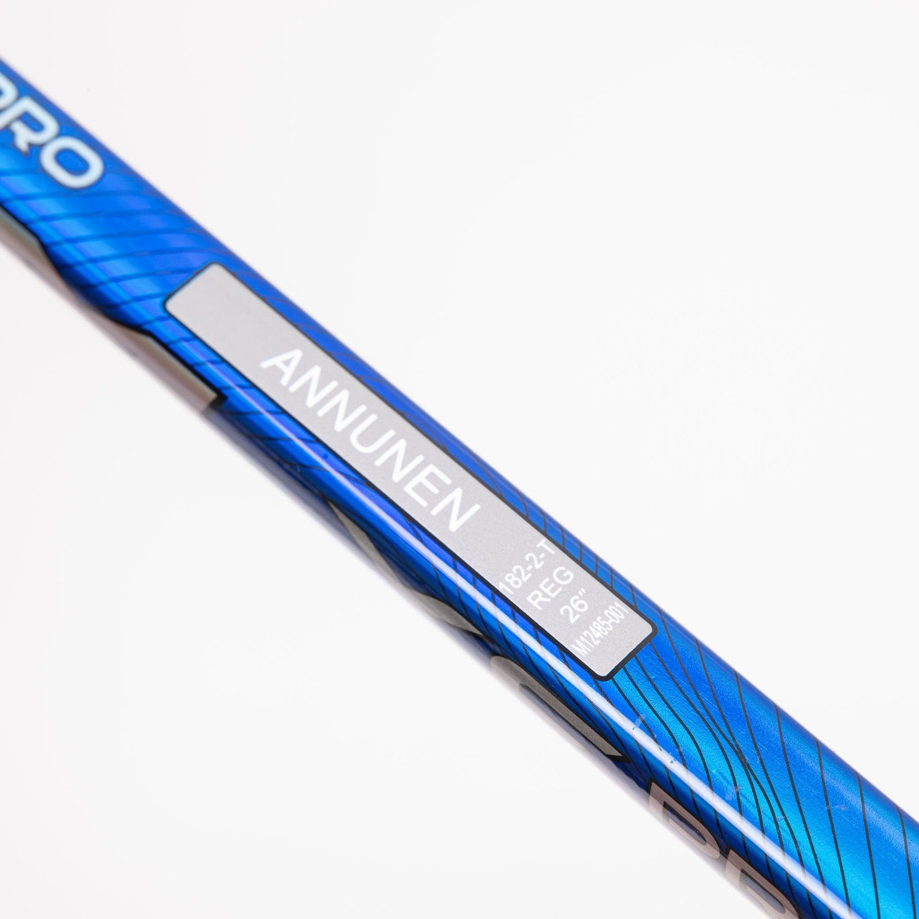 This custom CCM Axis XF Pro Stock goalie stick is a pro return from pro goalie Justus Annunen. The stick uses the Axis XF Pro construction, featuring SigmaTex Construction with Nanolite Shield Carbon layering, a Variable V shaft with a high-flex design, and a P4 Curve. The stick specs include a P4 blade, 26" paddle, and a traditional shoulder design.