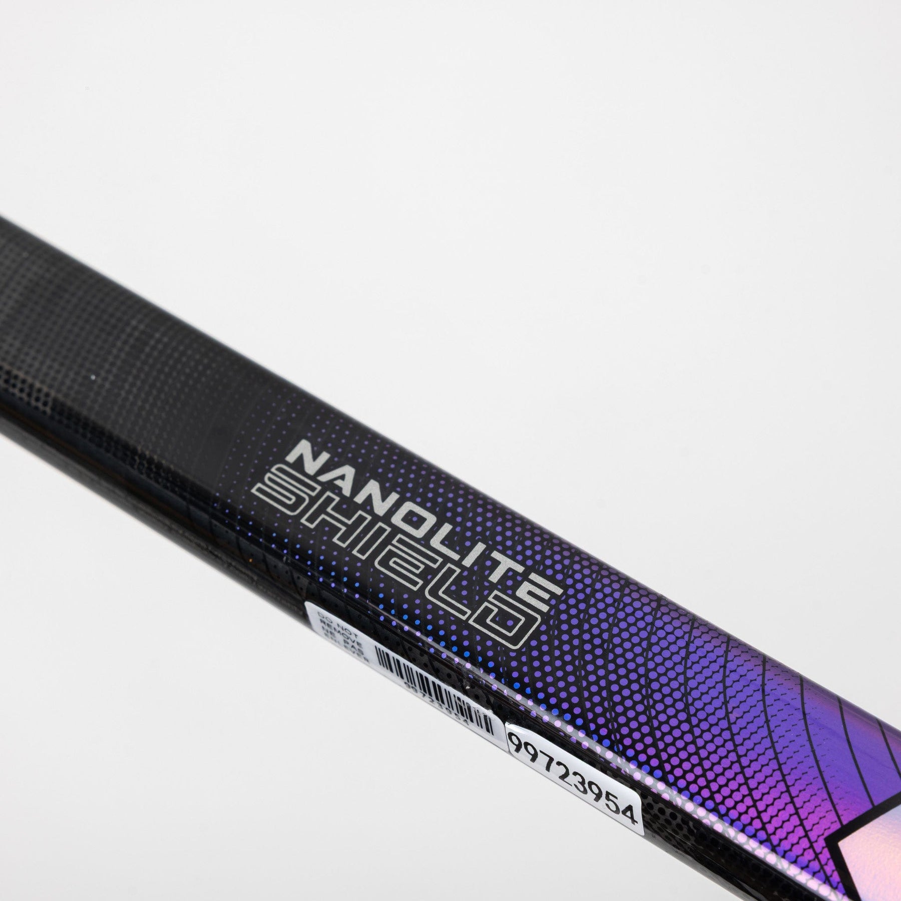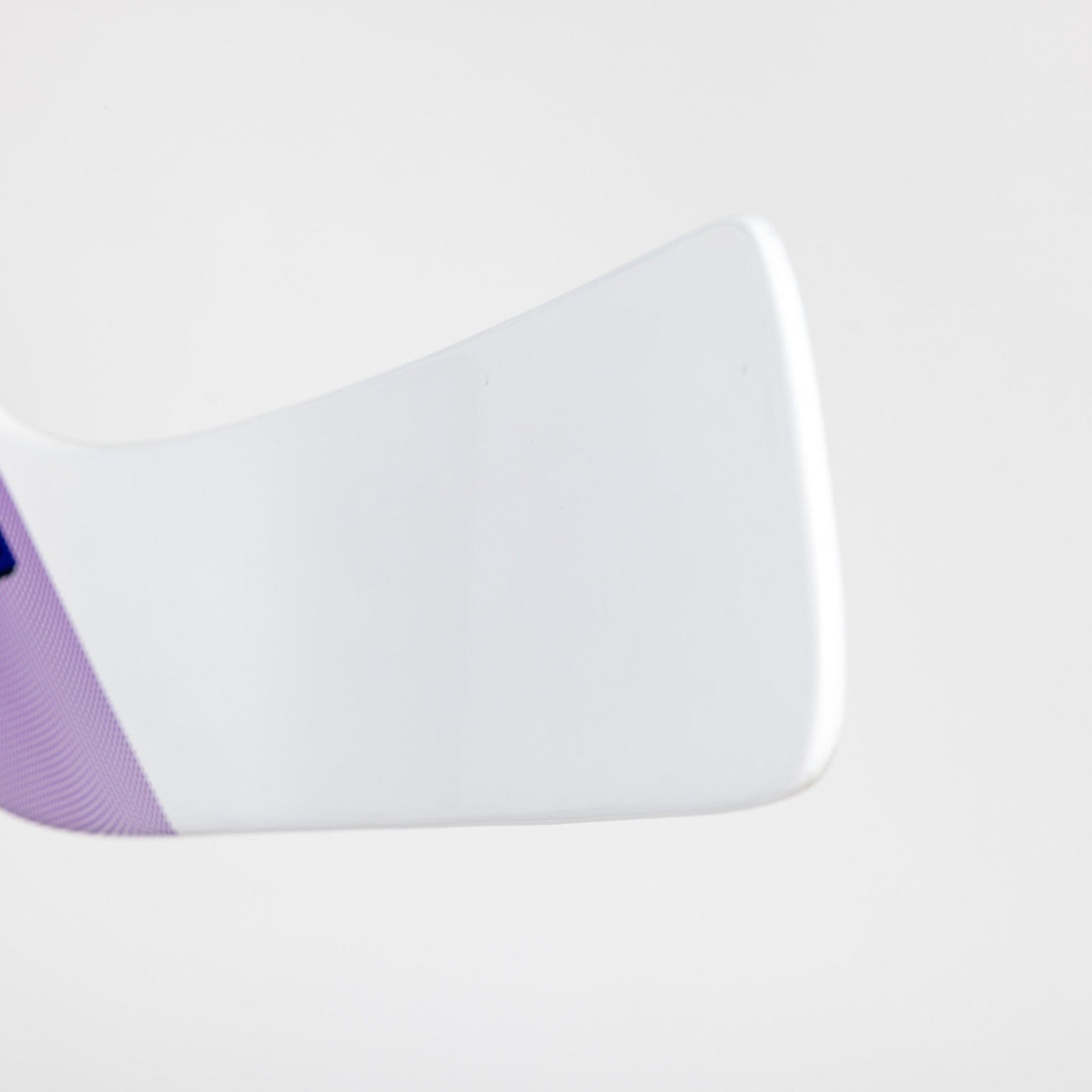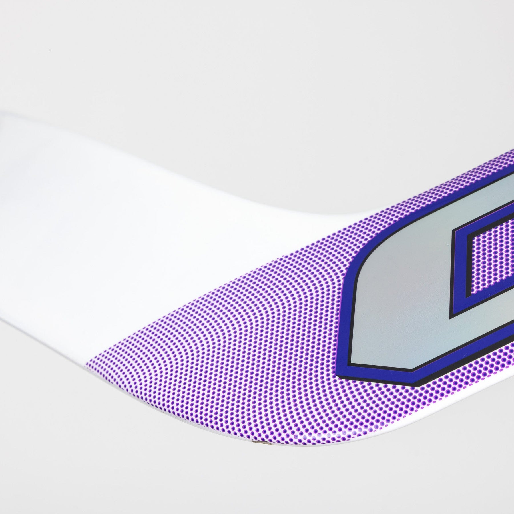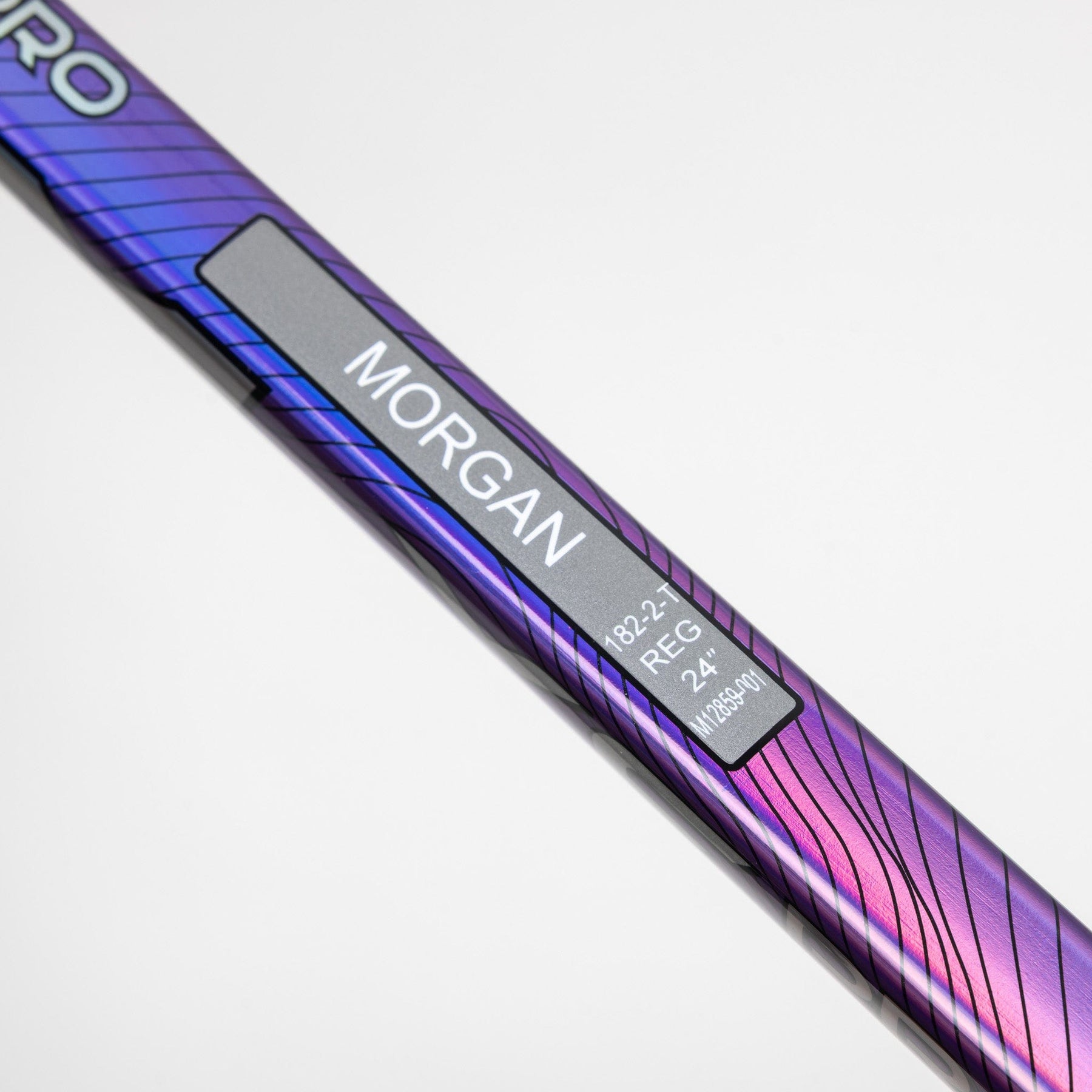 This custom CCM Axis XF Pro Stock goalie stick is a pro return from pro goalie Lucy Morgan. The stick uses the Axis XF Pro construction, featuring SigmaTex Construction with Nanolite Shield Carbon layering, a Variable V shaft with a high-flex design, and a P4 Curve. The stick specs include a P4 blade, 24" paddle, and a traditional shoulder design.