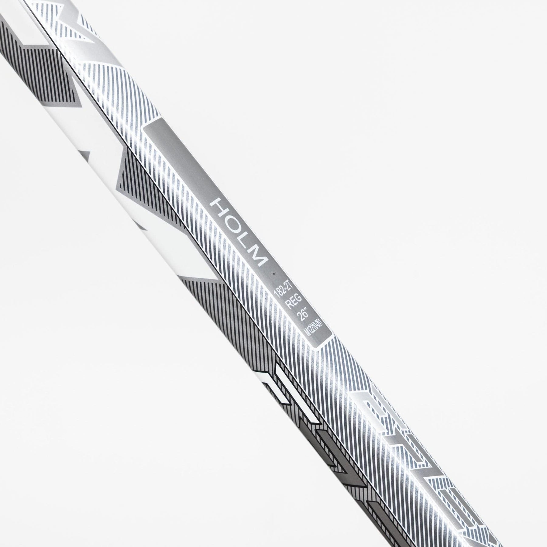 This custom CCM Extreme Flex 5 Pro Stock goalie stick is a pro return from pro goalie Arvid Holm. The stick uses the E-Flex 5 base, featuring CCM's Peel-Ply Technology and a combination of Innegra and SigmaTex Construction. The stick specs include a P4 blade, 26" paddle, and a traditional shoulder design.