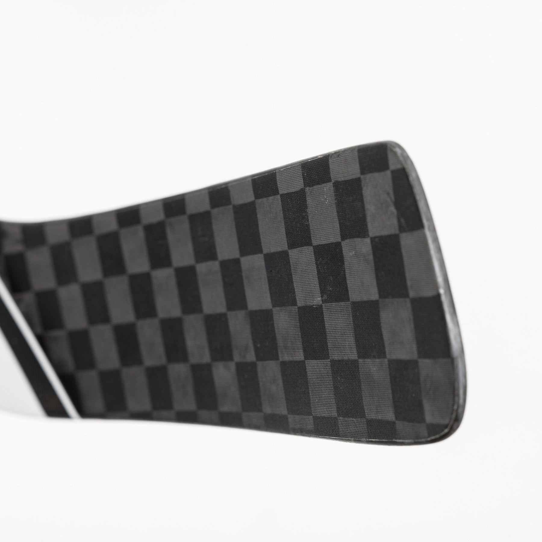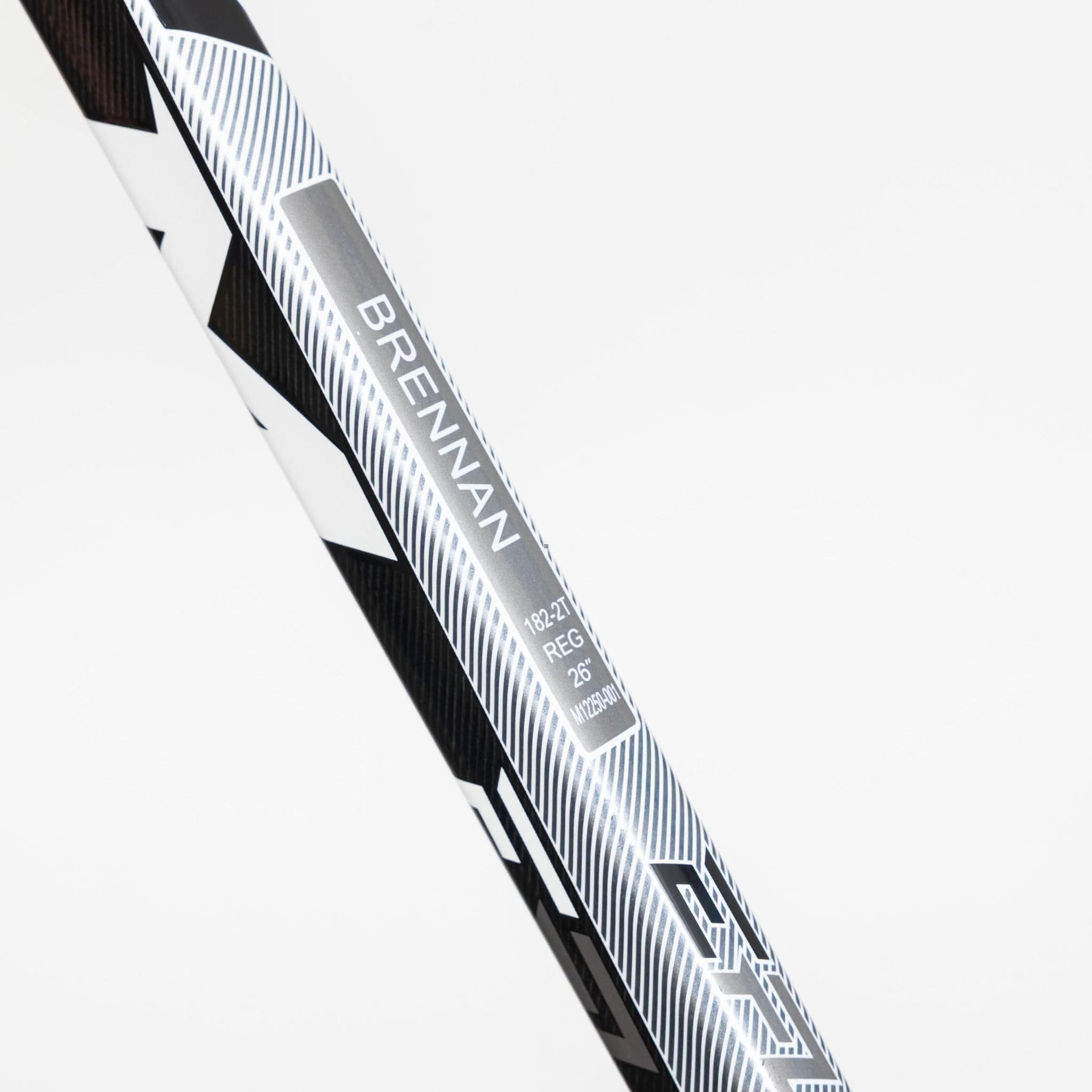 This custom CCM Extreme Flex 5 Pro Stock goalie stick is a pro return from pro goalie Ty Brennan. The stick uses the E-Flex 5 base, featuring CCM's Peel-Ply Technology and a combination of Innegra and SigmaTex Construction. The stick specs include a P4 blade, 26" paddle, and a traditional shoulder design.