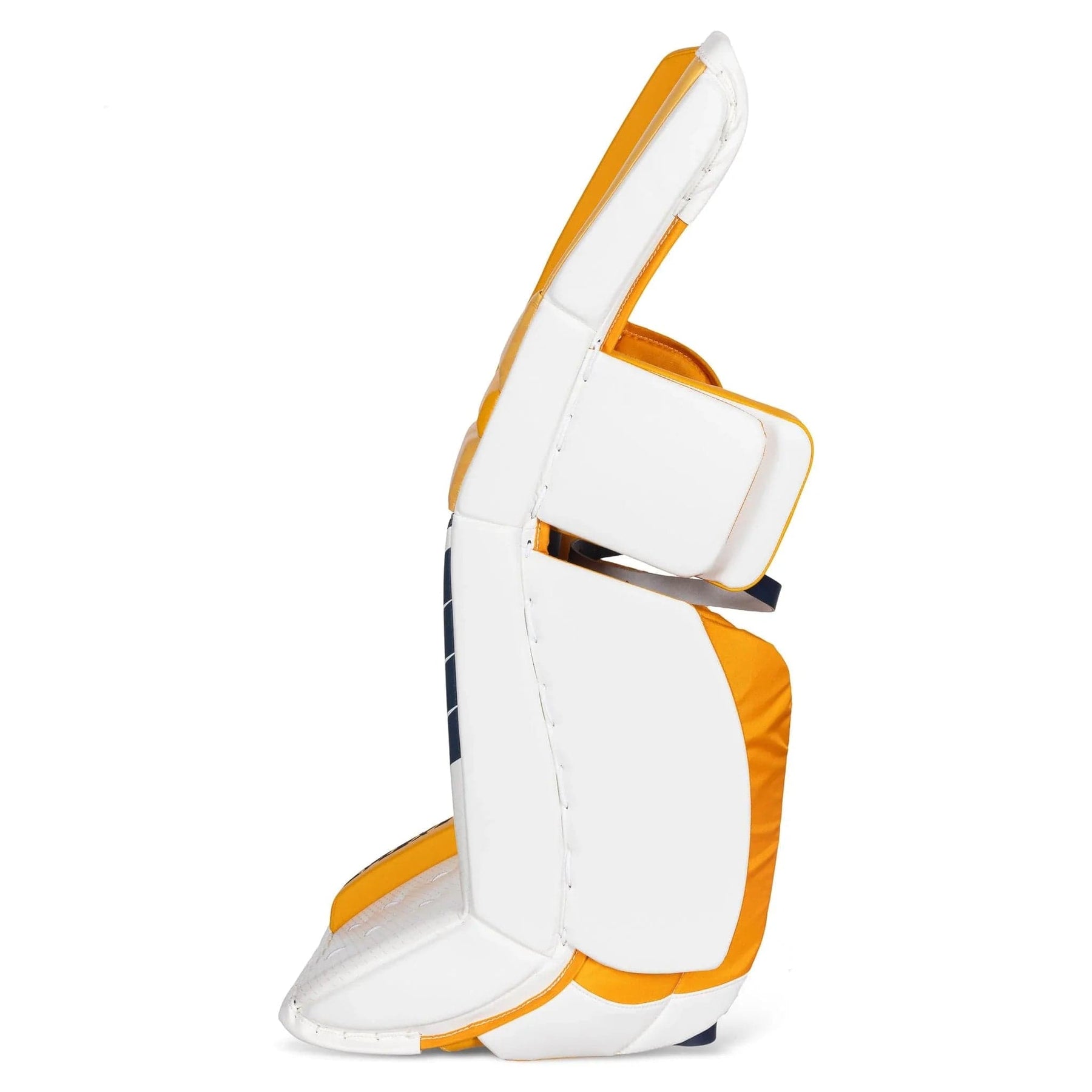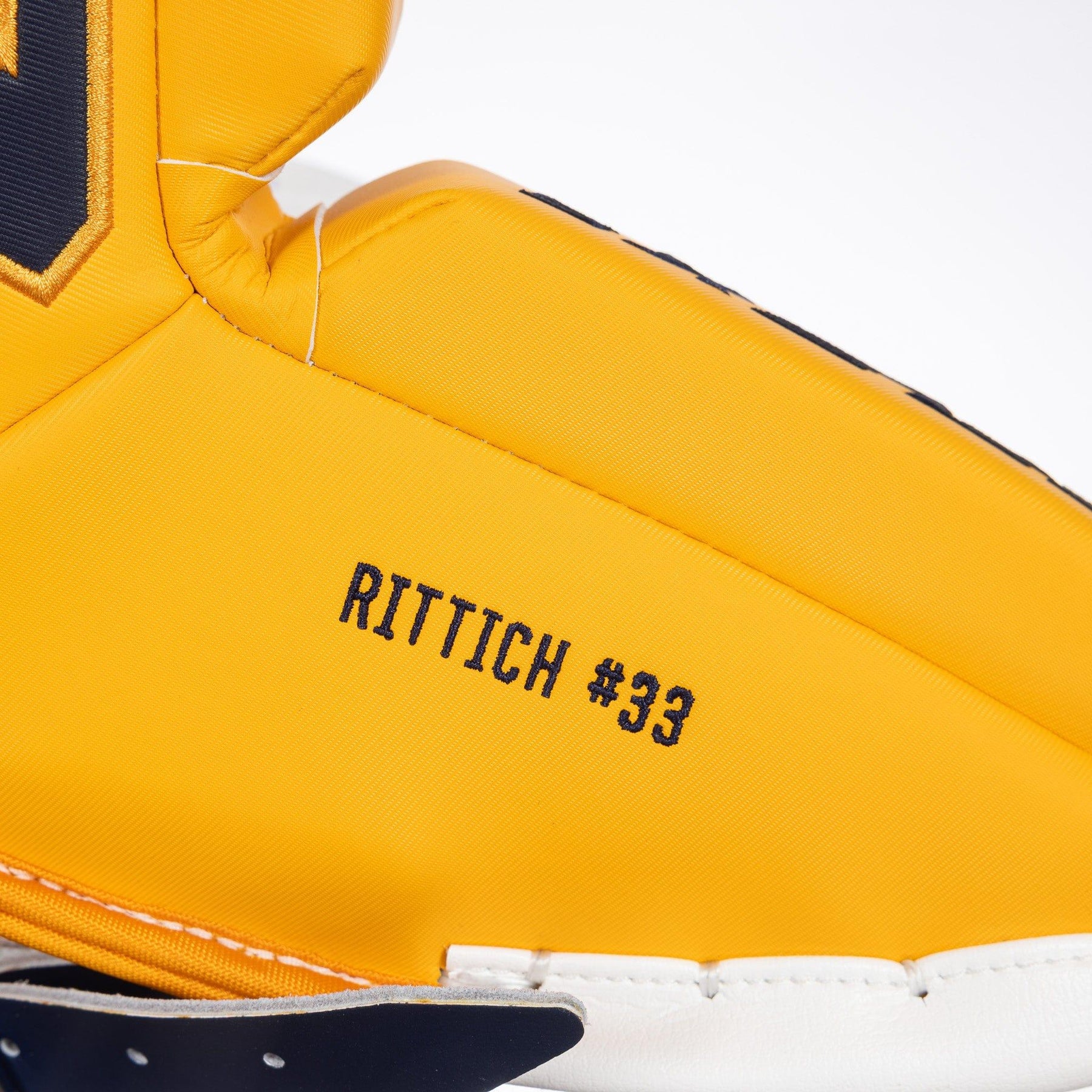The custom Nashville Predators–inspired graphic was created using CCM’s All Out UV-Printing technology, one of the first examples used in the NHL. Performance features include CCM’s Speed Skin slide surface for fast, consistent lateral movements. Other features include a sewn in knee wing, a leather boot strap, and a leather upper calf strap.