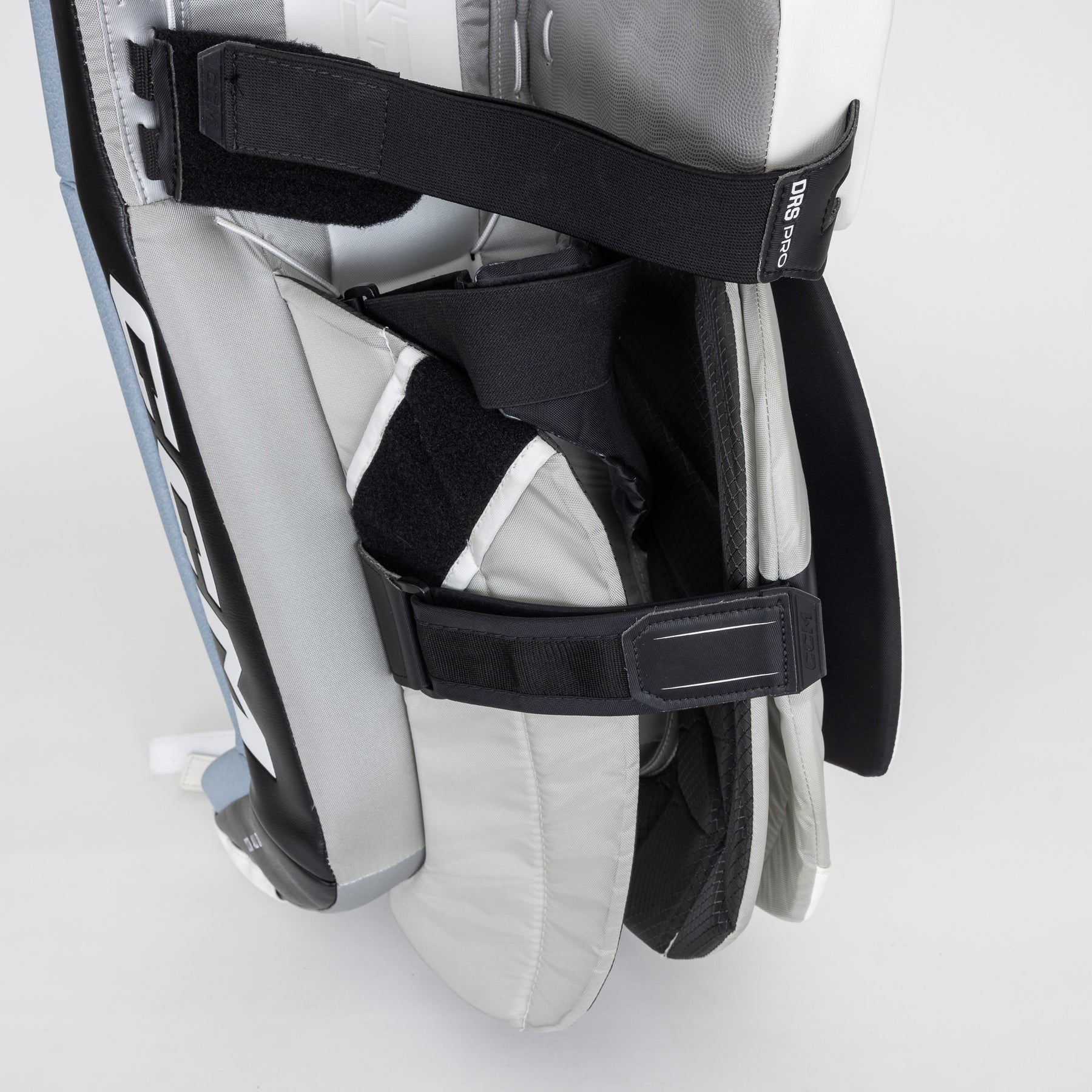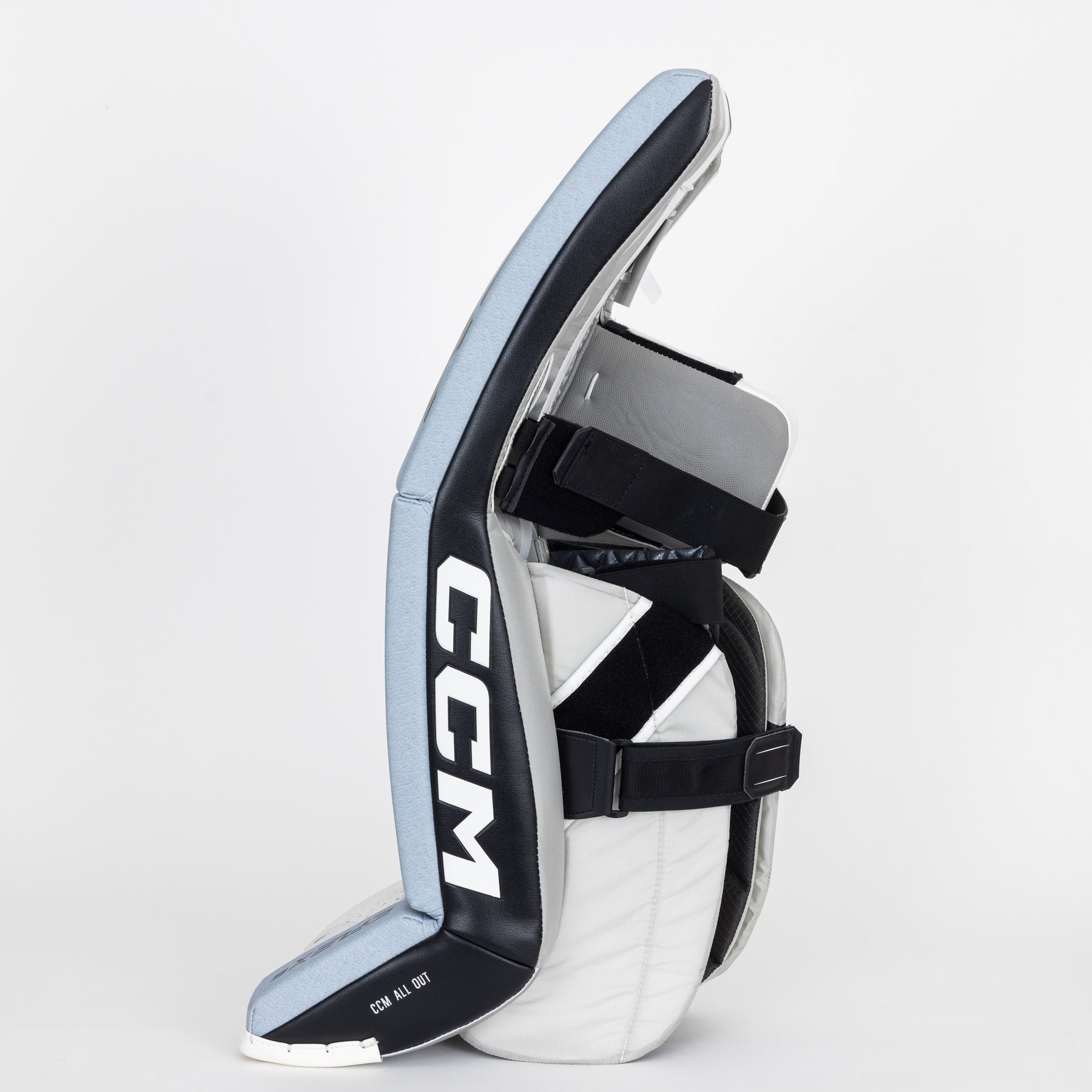 The pads use a 90-degree boot angle with a shallow channel for good balance and stability. The 90-degree boot angle allows the goalie to integrate their pads more effectively with the goal posts when in a butterfly position. By aligning the skate blade vertically, the goalie can achieve a better seal against the ice and the post, minimizing gaps and improving coverage. The pads also use a bungee toe system, which is an alternative to the traditional leather or nylon toe straps found on older-style leg pads. CCM’s bungee system is quick and secure and allows for more flexibility, easing the stress on goalies’ joints.