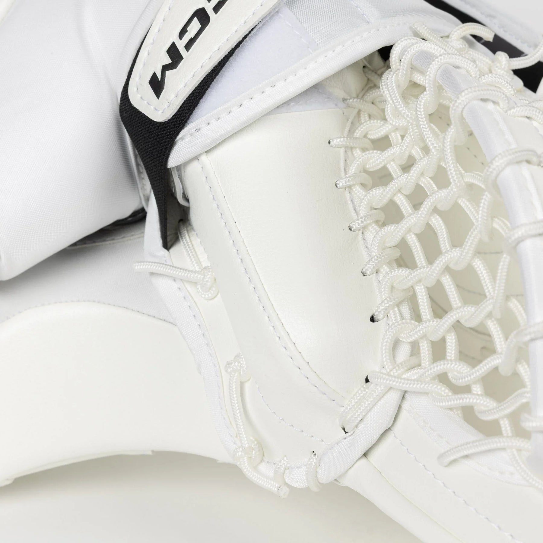 The catcher is covered with CCM’s Speedskin material, which can also be found on the leg pads. This is a light synthetic leather that’s lighter than traditional JenPro with a more consistent look and feel. Speedskin on the catcher does not have the same amount of slide as it does on the leg pads, so you can be assured you will still have elite-level control of the puck.