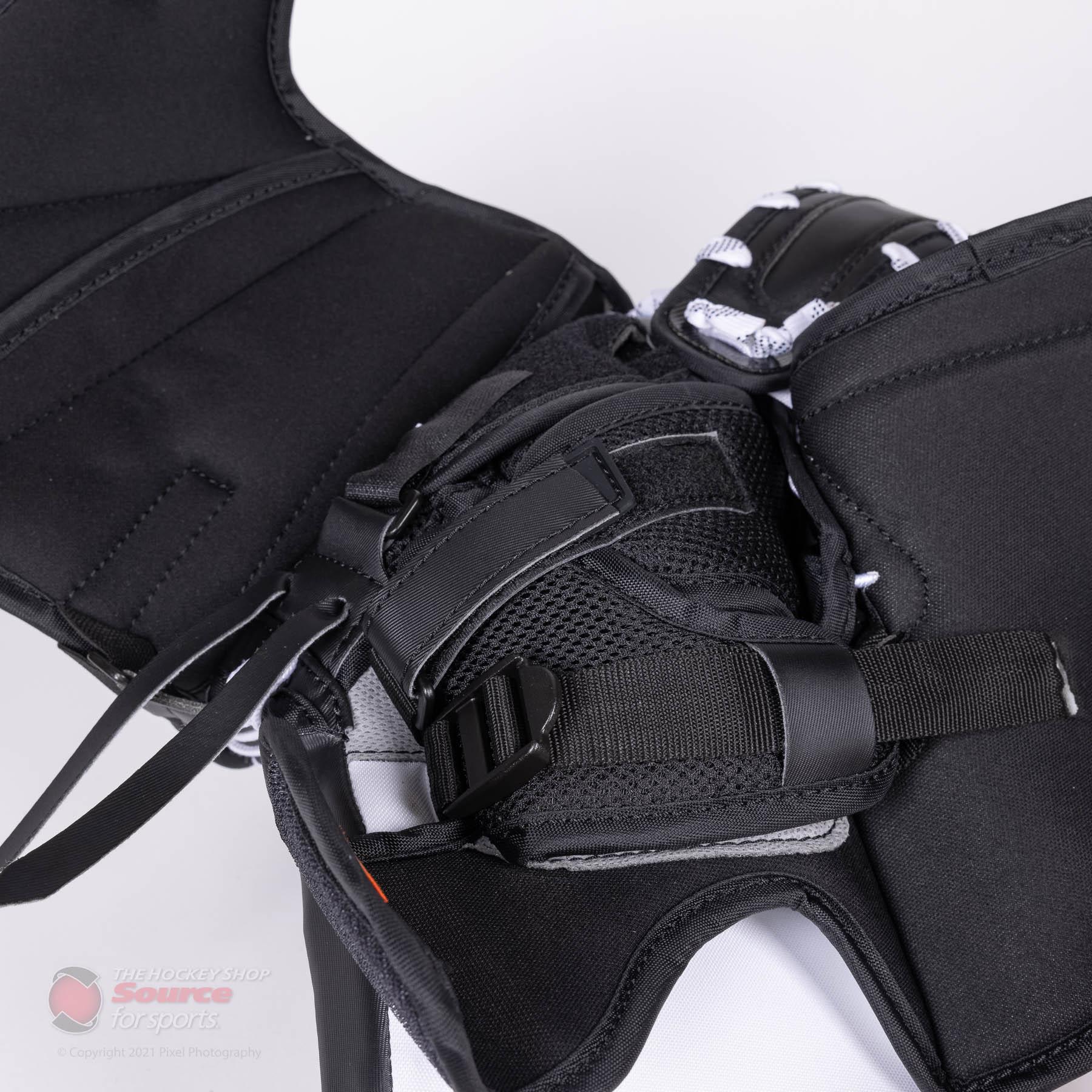 Next you want to ensure the adjustable wrist strap goes directly across the wrist bone, and has minimal to no interference with your chest protector. The goaltender should be able to swivel their wrist to accommodate a range of save selections without any restrictions from the chest protector.
