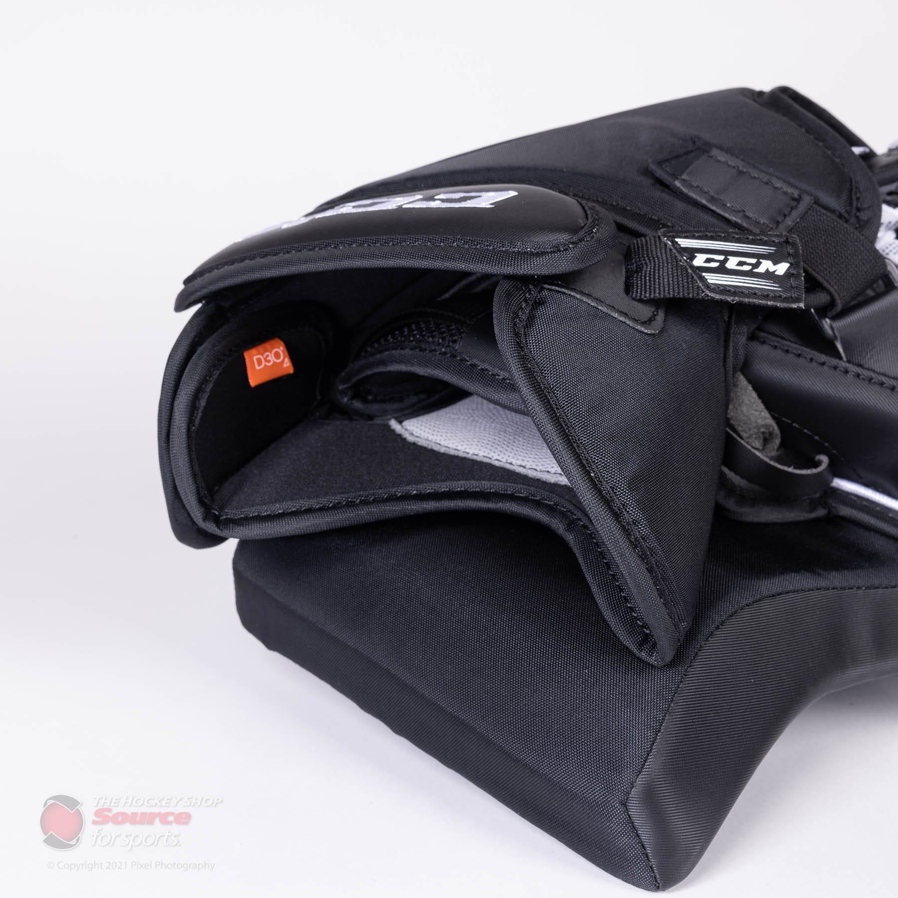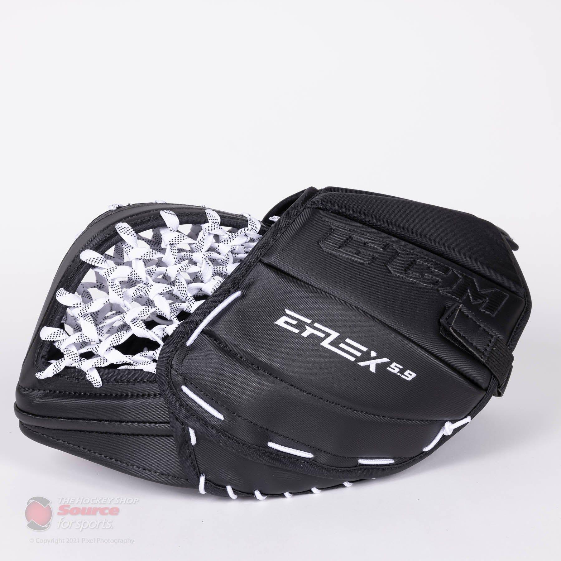 Serving players since 1988.The Source for Sports Exclusive version of the CCM Extreme Flex E5.9 SR Goalie Catcher deliver all the same features as the catalog E5.9 with upgraded specs. These upgraded specs include; a 1” deeper Single-Tee skate lace pocket, CCM's SureGrip palm with impact-absorbing D30 Smart Foam palm protection, and exclusive colorways that are unique to the Source for Sports family. These spec upgrades respectively provide improved grip and closure, and increased impact absorption through the use of D30 Smart Foam. Pair these upgrades with the FlexMotion backhand and cuff, SpeedSkin material, and a 600 Degree break angle, the E5.9 Source Exclusive offering gives you more "bang-for-your-buck" over the catalog model.