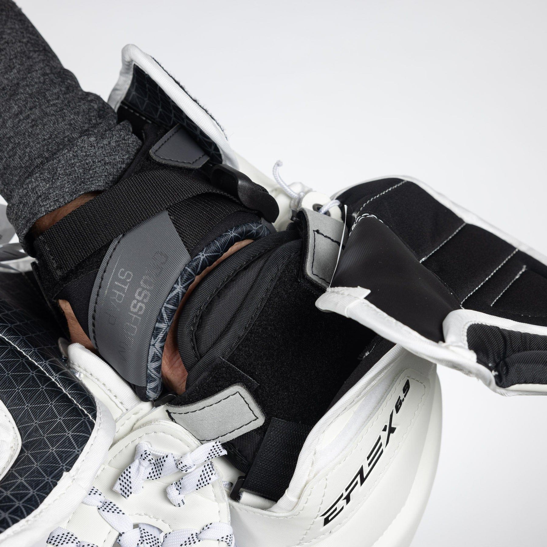 Next you want to ensure the adjustable wrist strap goes directly across the wrist bone, and has minimal to no interference with your chest protector. The goaltender should be able to swivel their wrist to accommodate a range of save selections without any restrictions from the chest protector.
