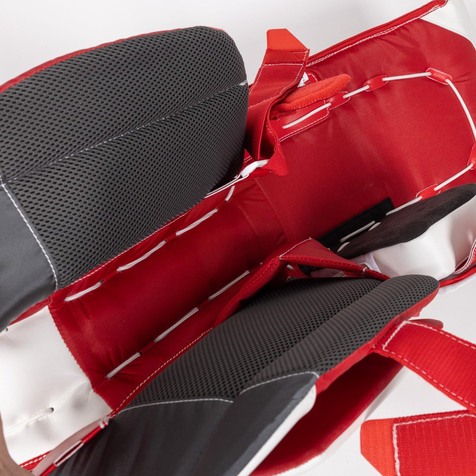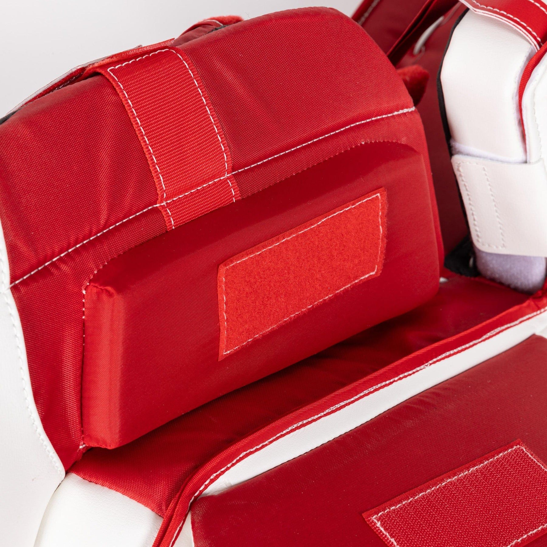 2. Next you want to get in your stance, keep your hands in a ready position, and drop to your butterfly. Without moving your legs to correct your butterfly, bring your heels together. This is where you assess your knee position. For a proper fit, you want the middle of your knee to sit directly on the center of the knee stack. If you’re looking for growing room, you want the middle of your knee to land roughly 1.5” below the center of the knee stack (1” for JR).
