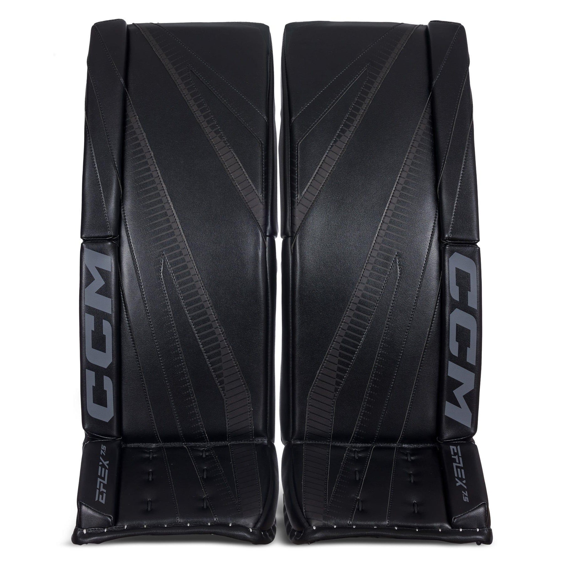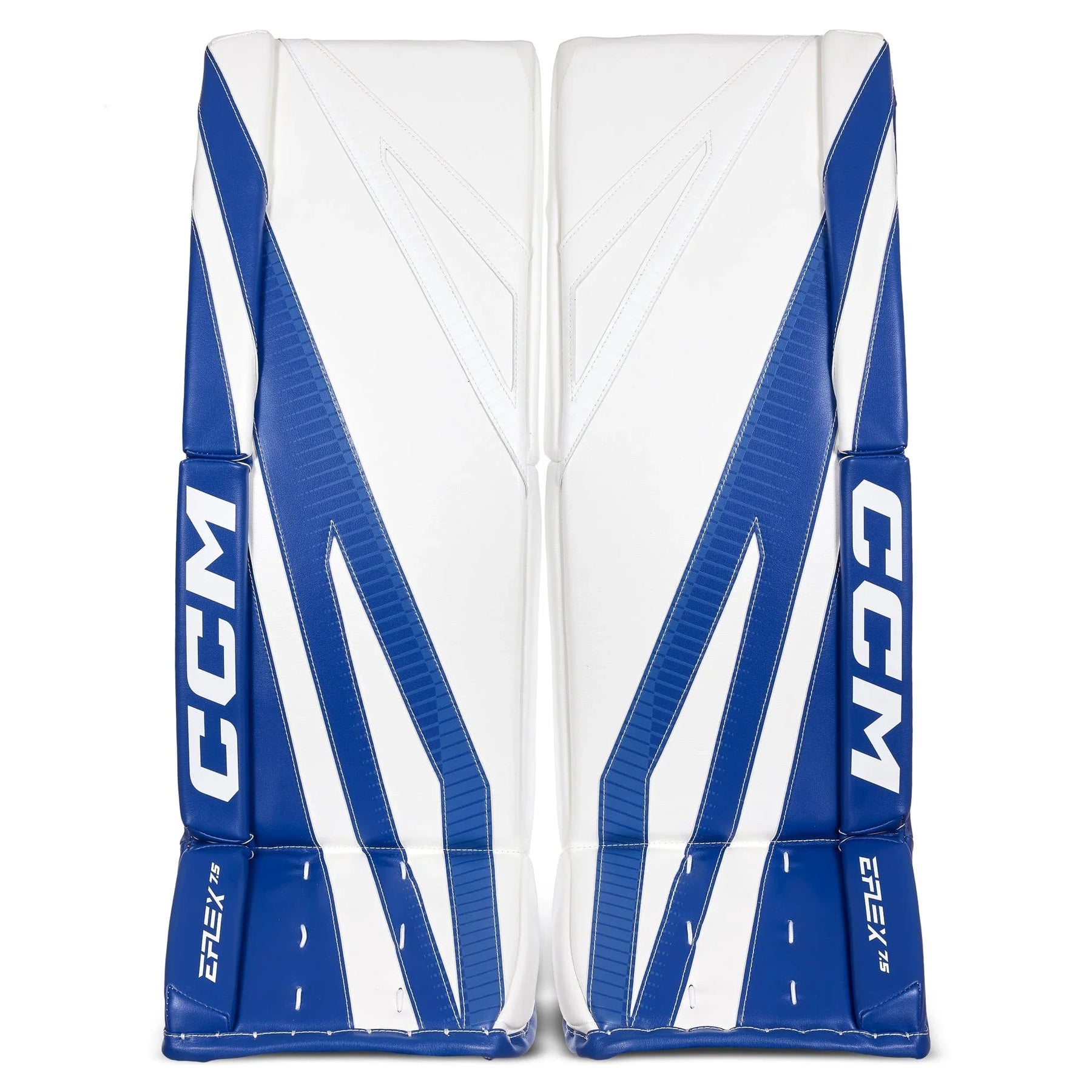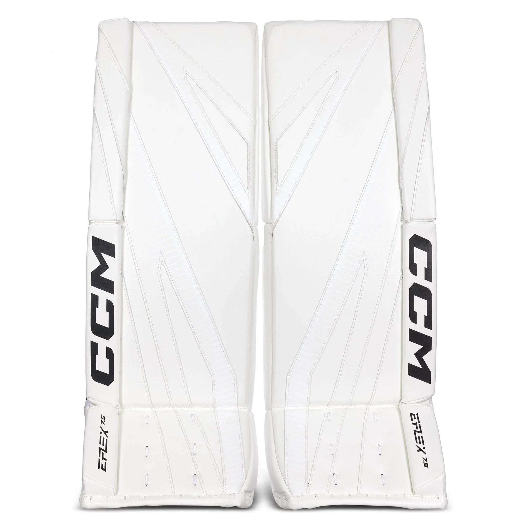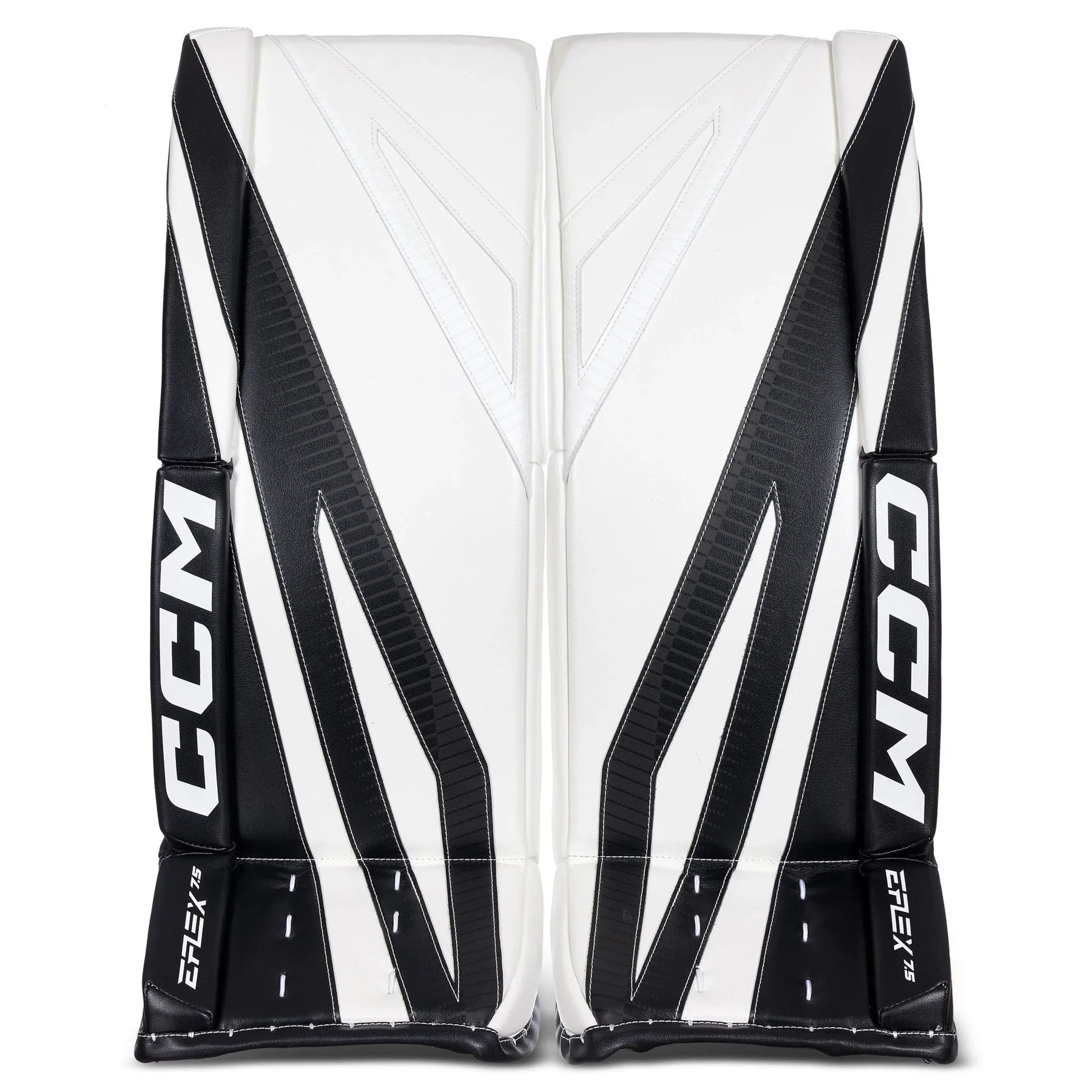 The EFlex 7.5 leg pads feature a 90° boot angle with a shallow channel and an offset hybrid skate lace system, which is designed to have an enhanced range of motion and connectivity for power pushes. The pads use a 90-degree boot angle with a shallow channel for good balance and stability. The 90-degree boot angle allows the goalie to integrate their pads more effectively with the goal posts when in a butterfly position. By aligning the skate blade vertically, the goalie can achieve a better seal against the ice and post, minimizing gaps and improving coverage.