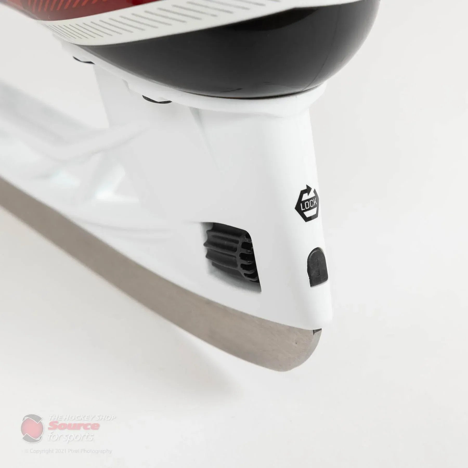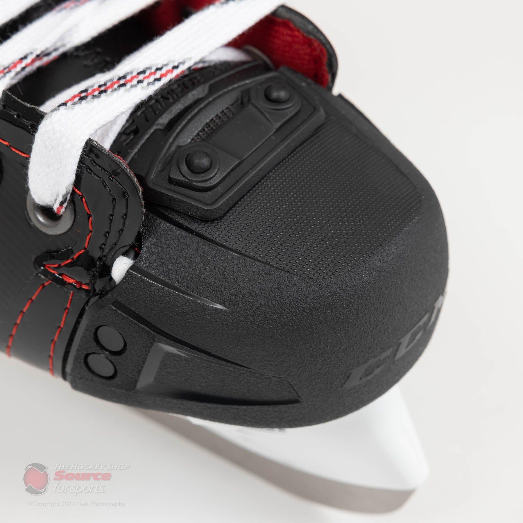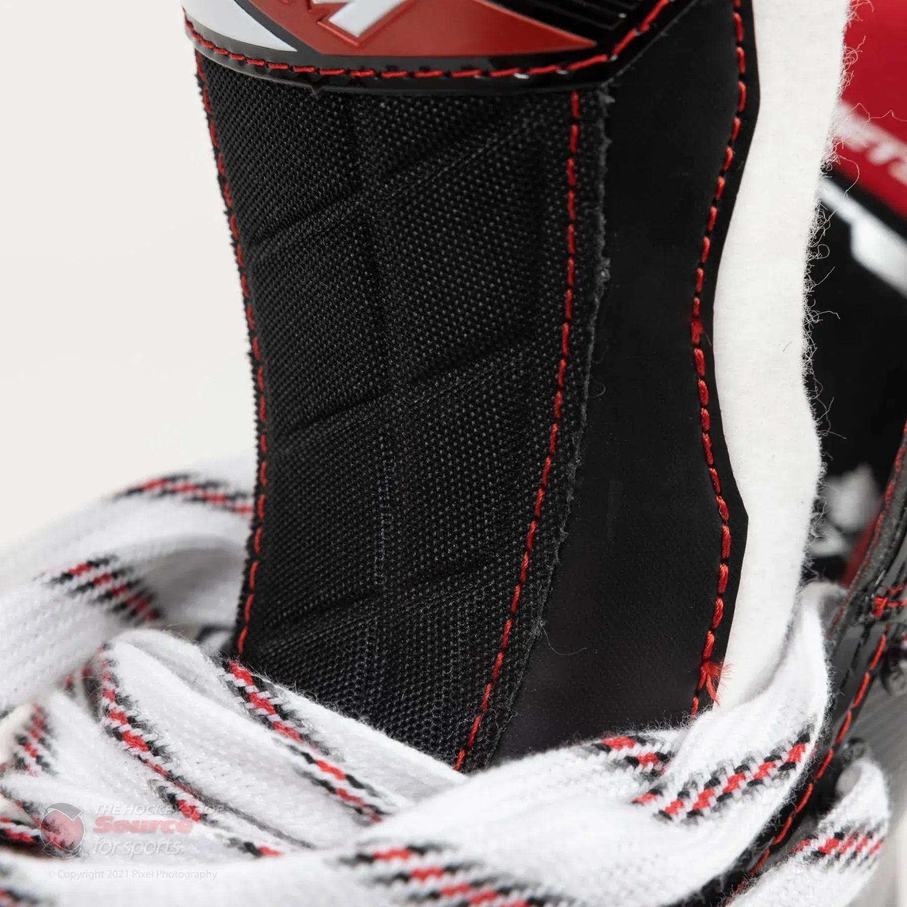 The graphic on the Jetspeed Shock Skate is quite similar to the Vibe. It adds the CCM logo on the side of the boot and the FT4 Pro liner graphic as well. The flash but clean back red and white pattern will have the skate sure to be noticed.