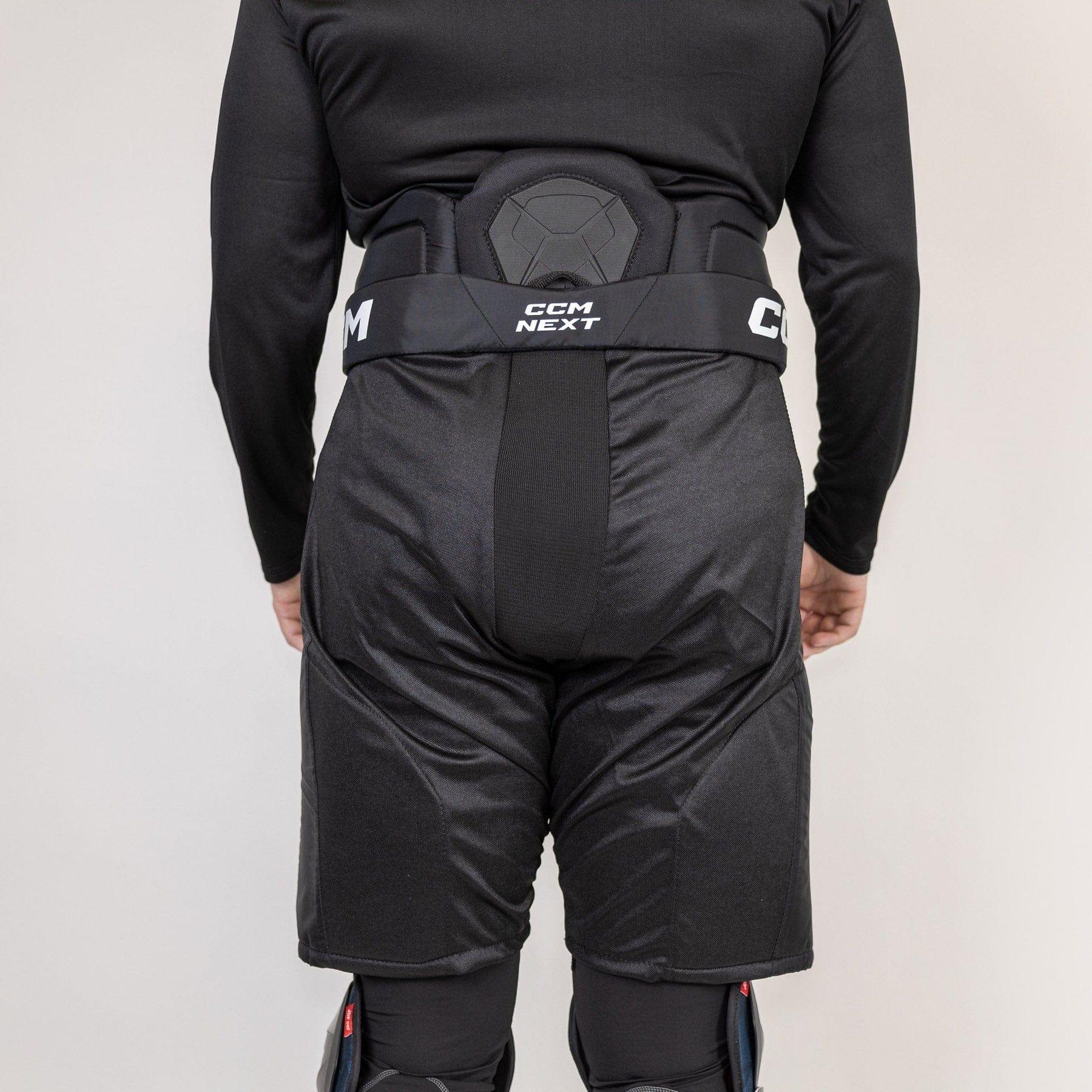 The padding on the hip & kidney area is made of PE foams, which is designed and inserted inside the pants to provide an additional level of comfort and support when on the ice. The CCM Next line also includes molded PE caps, which provides a good level of protection in the kidney area to keep players covered and supported while on the ice.