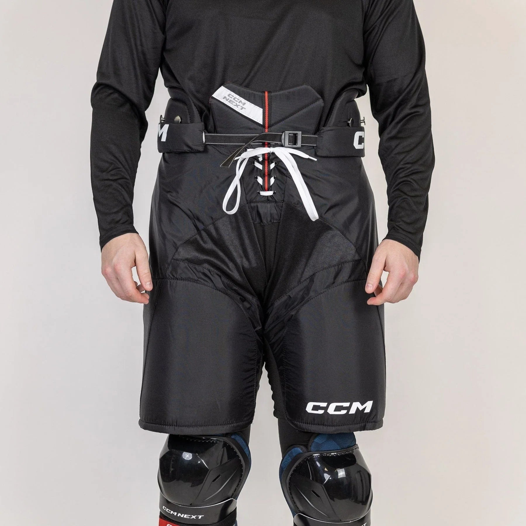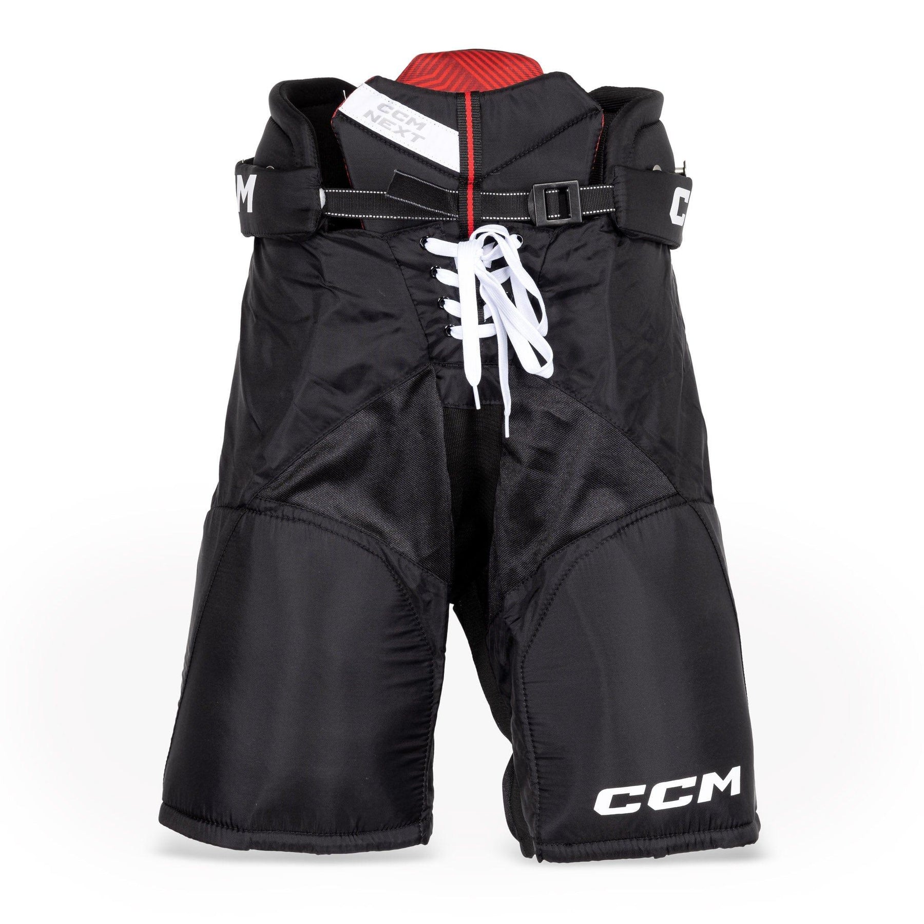 The CCM Next Junior Hockey Pants come in Black, Red, and Navy. Sizes available include Small, Medium, and Large.