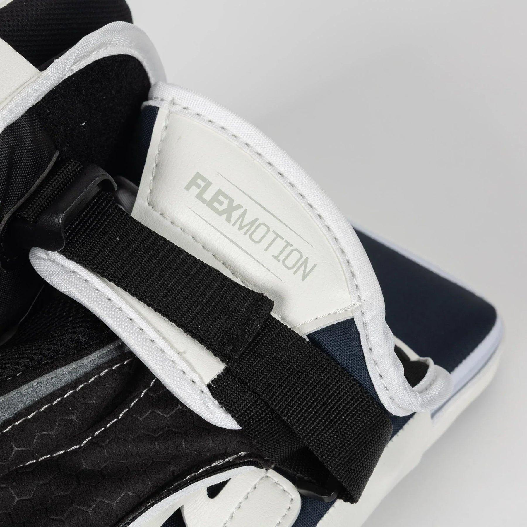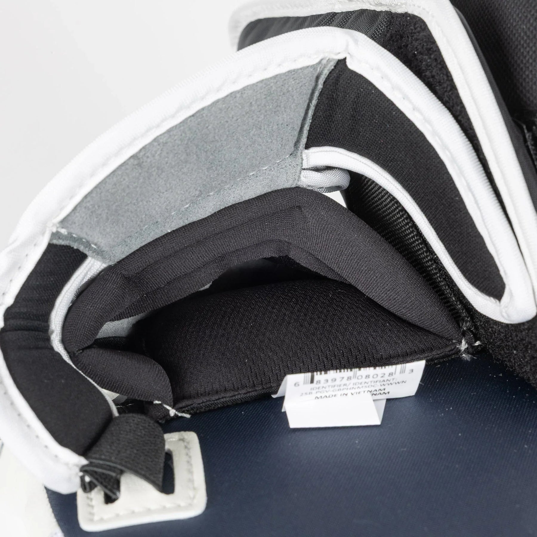 CCM continues to use their flexmotion cuff on the Phenom blocker. The flexmotion cuff has strategic segmentation and adjustability for greater range of motion. A new feature to the cuff is the integration of Neoprene. The Neoprene material is designed to provide a comfort finish at the wrist opening.