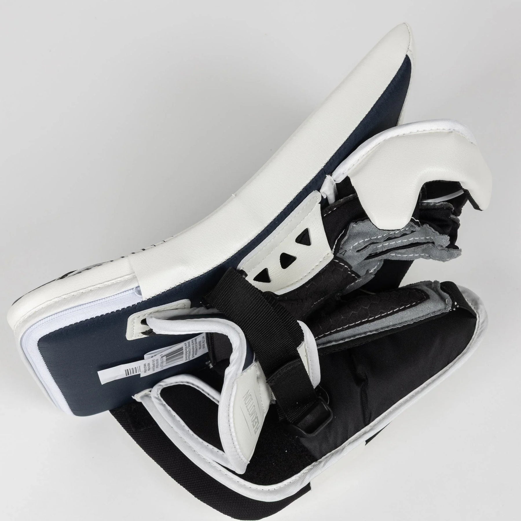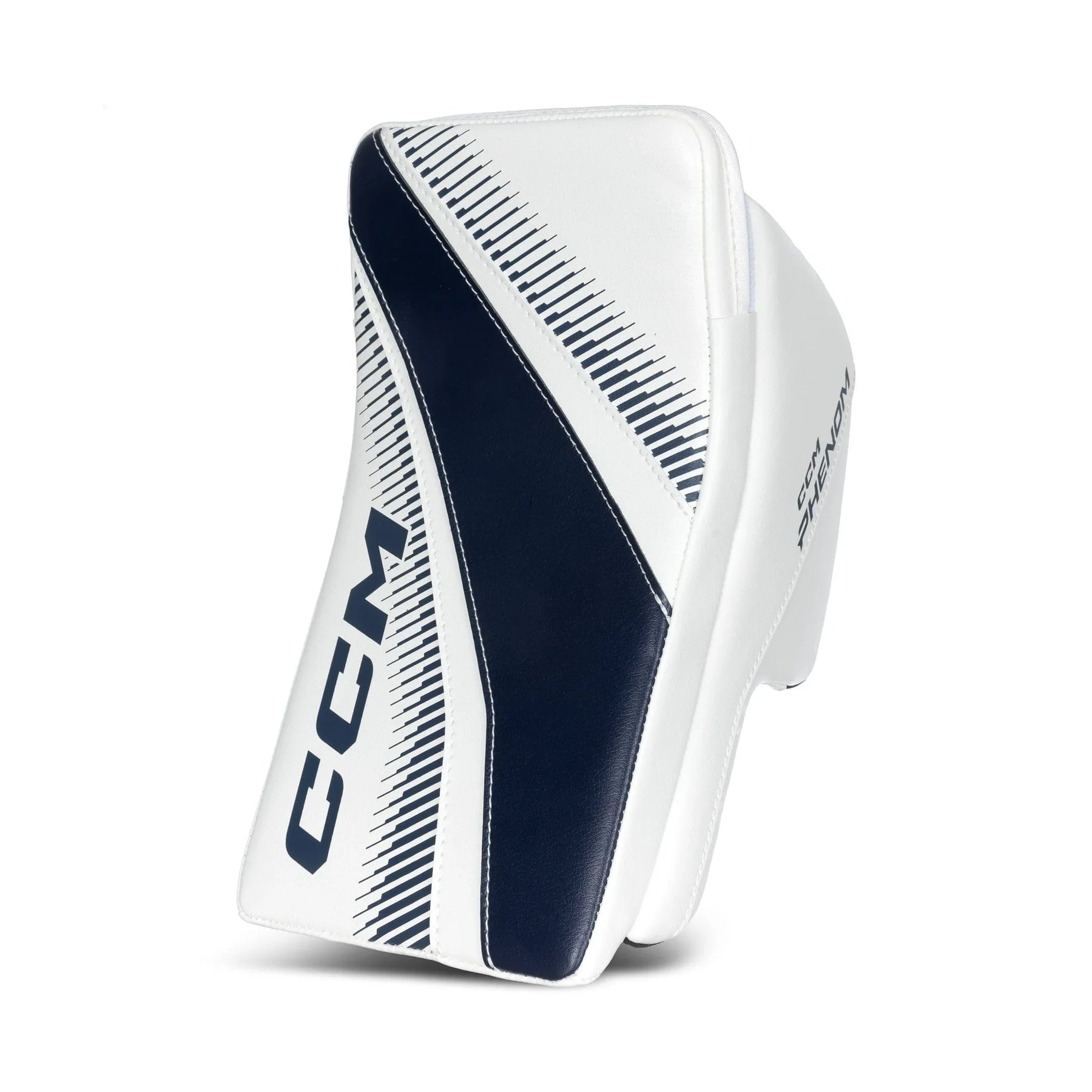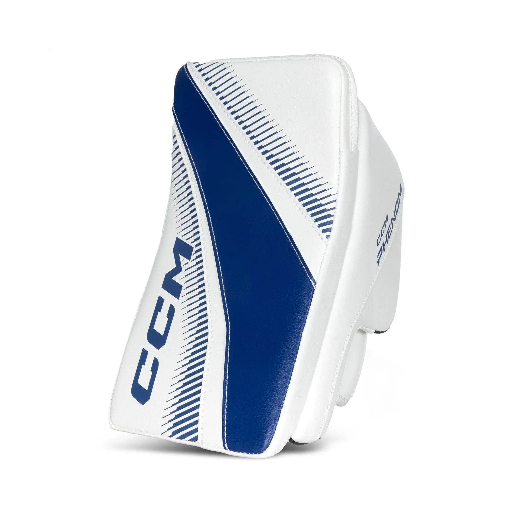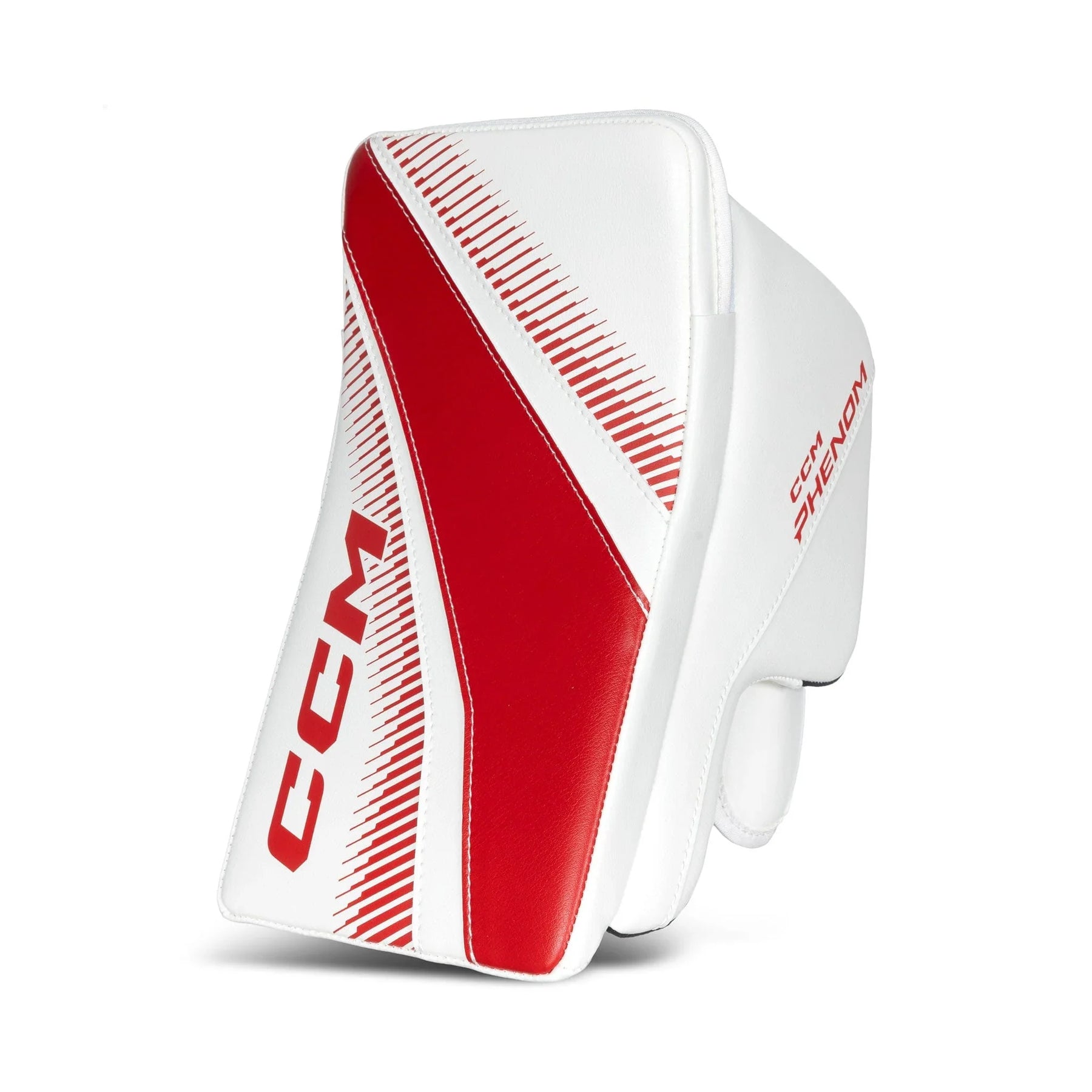 The CCM Phenom Junior Goalie Blocker is available in Detroit, Navy/White, Toronto, White/Black, Black, and White in a regular and full-right option.