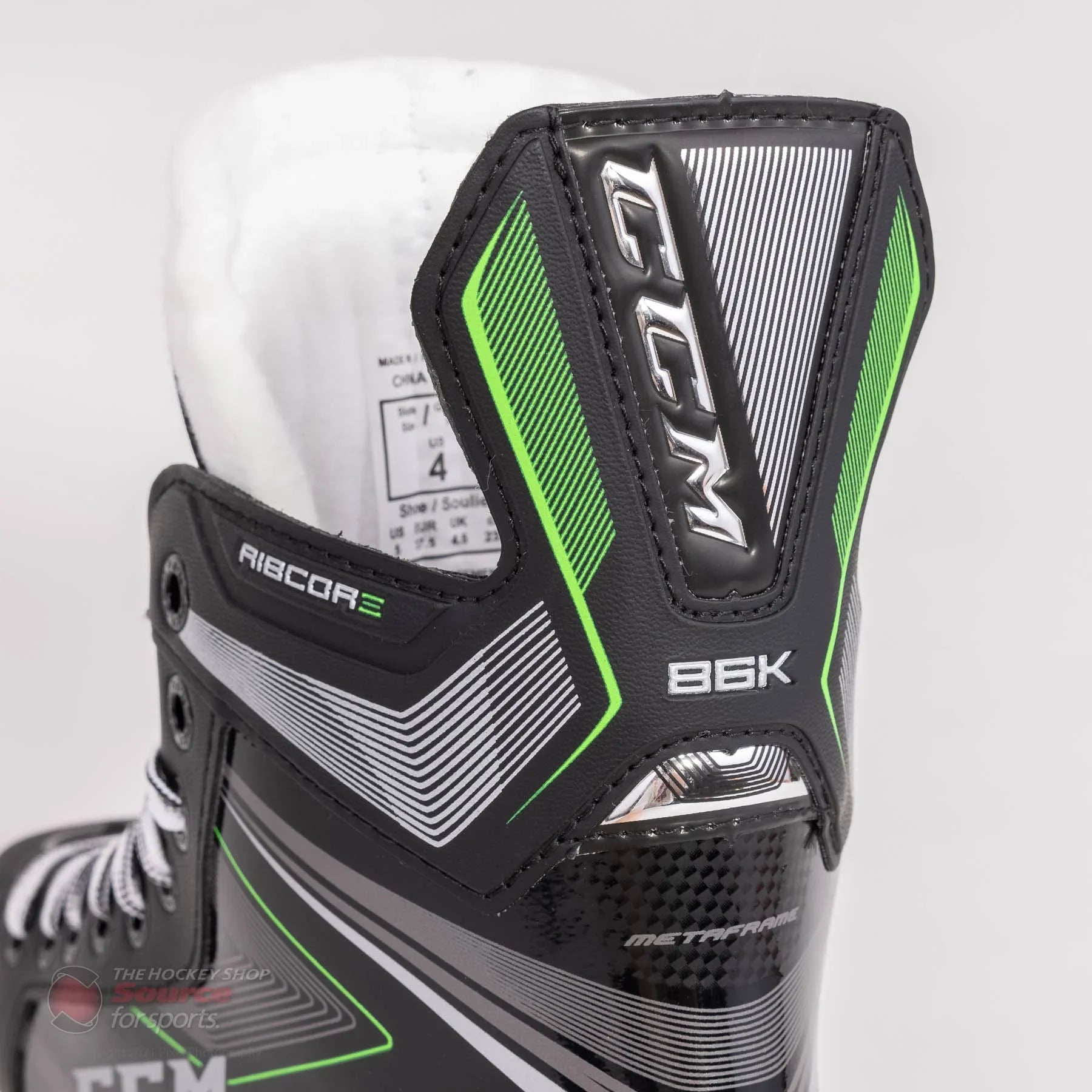 The new graphic for the CCM Ribcore 86K features a glossy silver lined pattern overtop a black finish. CCM finishes the boot off nicely with their classic Ribcore green accents along the tendon guard, base of the heel, and ankle regions of the boot.