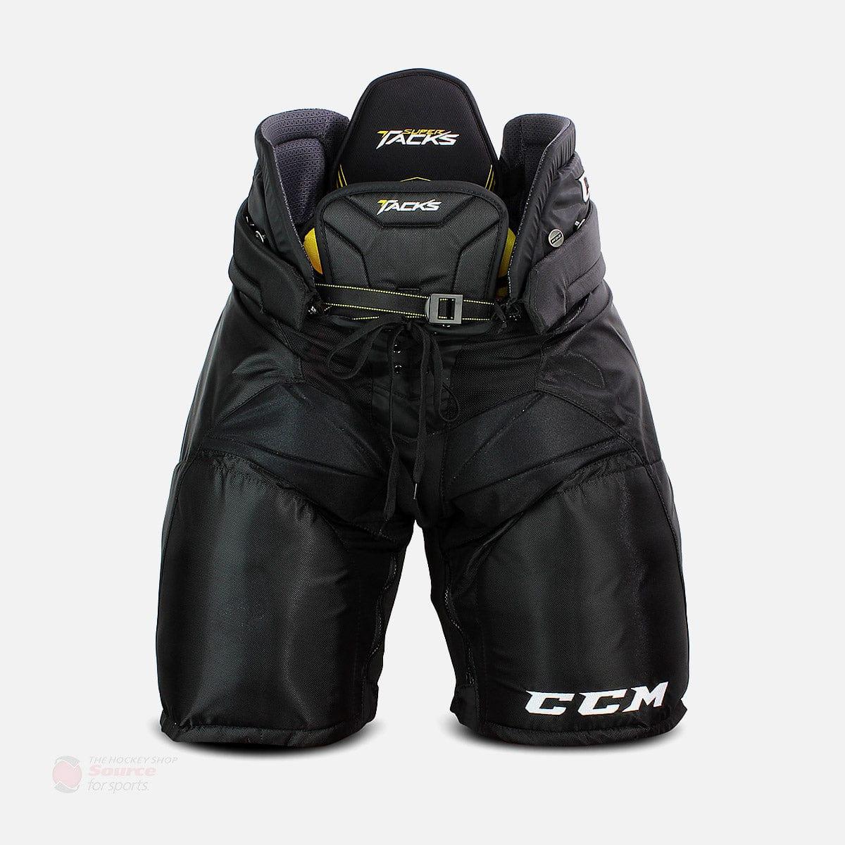 The CCM Super Tacks pants are designed to be a highly protective and customizable pant. They offer a length adjustment feature and utilize the innovative D30 smart foam that has been engineered to react with fluctuating intensities. This smart foam will keep a soft consistency to absorb low impacts then immediately harden at high intensities to protect you from the bigger hits. The fit of the Super Tacks pants was modeled after one of CCM's best-selling lines. A 400-denier nylon exterior with reinforced side panels reduces the overall weight while optimizing durability by adding additional material only in the main wear and tear locations. A foam padded external belt hides a length adjusting zipper which enables the pants to increase in length by 1" for taller players out there. In addition to the external belt, a padded internal belt system provides a better, more secure fit on the hips. The Super Tacks feature JDP hip caps which use a renowned shape to disperse impacts away from the hip joint. These caps are also liner with D3O smart material to provide a pro level of protection. D3O smart material is also featured in the adjustable HD floating spine protector to again aid in impact dispersion. Moving down into the thighs of the pant, the Super Tacks feature molded HD and PE foams to provide a barrier of protection for your legs. The pants are topped off with leg zippers along the inseams and a lace tie at the front to fully secure the pants.