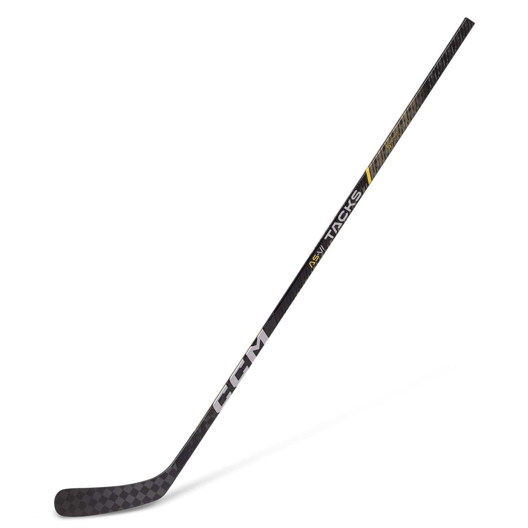 The stick keeps the familiar Tacks look in black with gold accents. The centre of the shaft also includes CCM’s modern Tacks text logo, as well as the new AS-V logo.