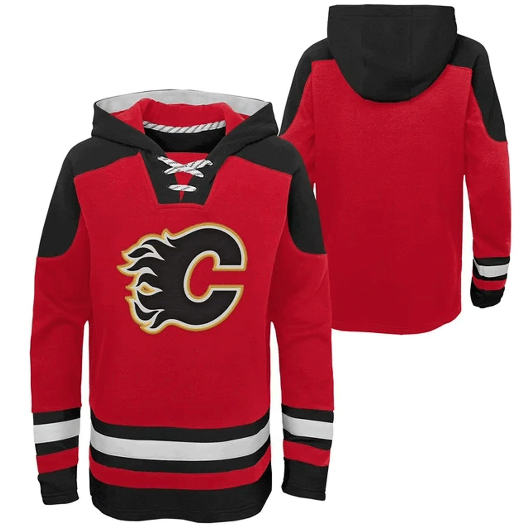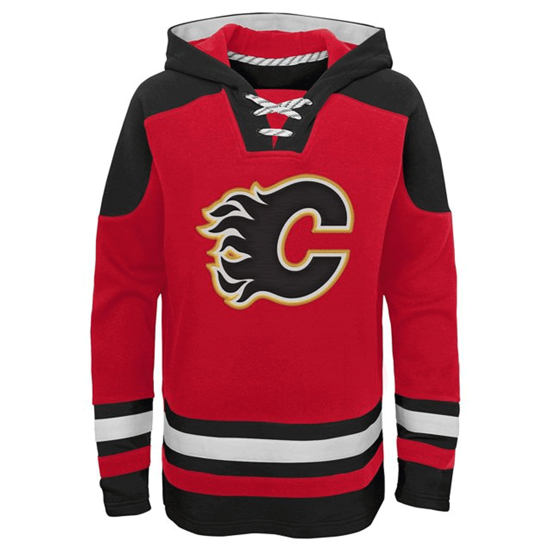 Dress your young Calgary Flames fan in classic style with this Outer Stuff NHL Ageless Must Have Hoodie. This midweight hoodie is perfect for moderate temperatures, featuring a lace-up V-neckline and contrast hood lining for a stylish touch. Embroidered appliques and sewn-on stripes on the sleeves create a unique look that celebrates the Calgary Flames.