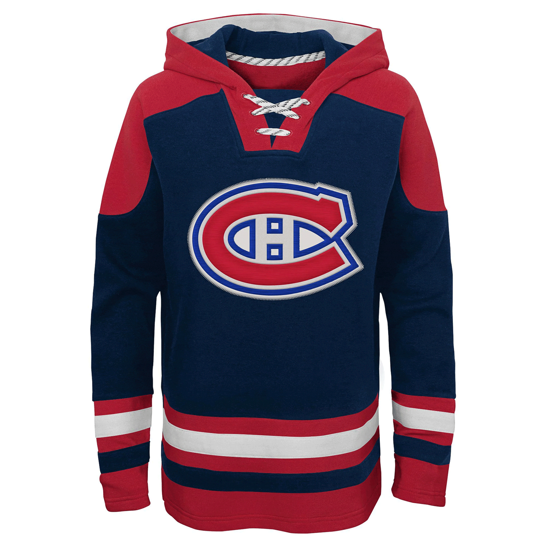 Dress your young Montreal Canadiens fan in classic style with this Outer Stuff NHL Ageless Must Have Hoodie. This midweight is perfect for moderate temperatures, featuring a lace-up V-neckline and contrast hood lining for a stylish touch. Embroidered appliques and sewn-on stripes on the sleeves create a unique look that celebrates the Montreal Canadiens.