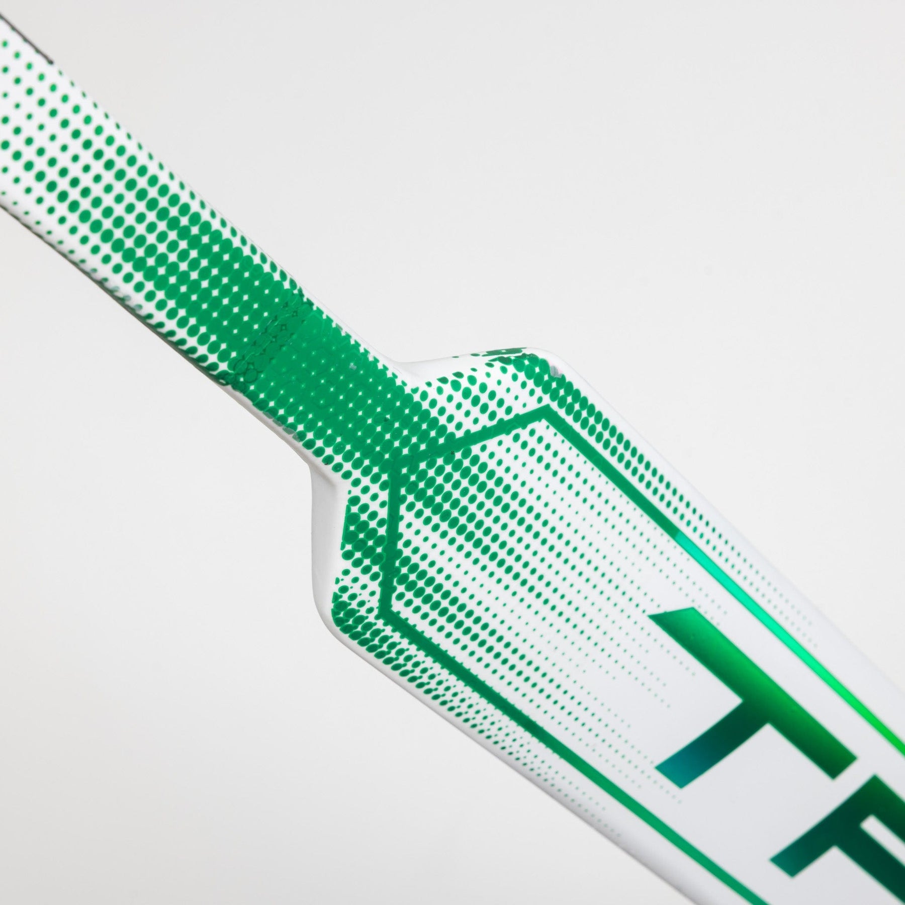 This custom True 9x4 Pro Stock goalie stick is a pro return from NHL goalie Casey Desmith of the Dallas Stars. This stick has a White and Green graphic inspired by the Stars, matte texture on shoulders, and custom blade pattern with a rounded toe.
