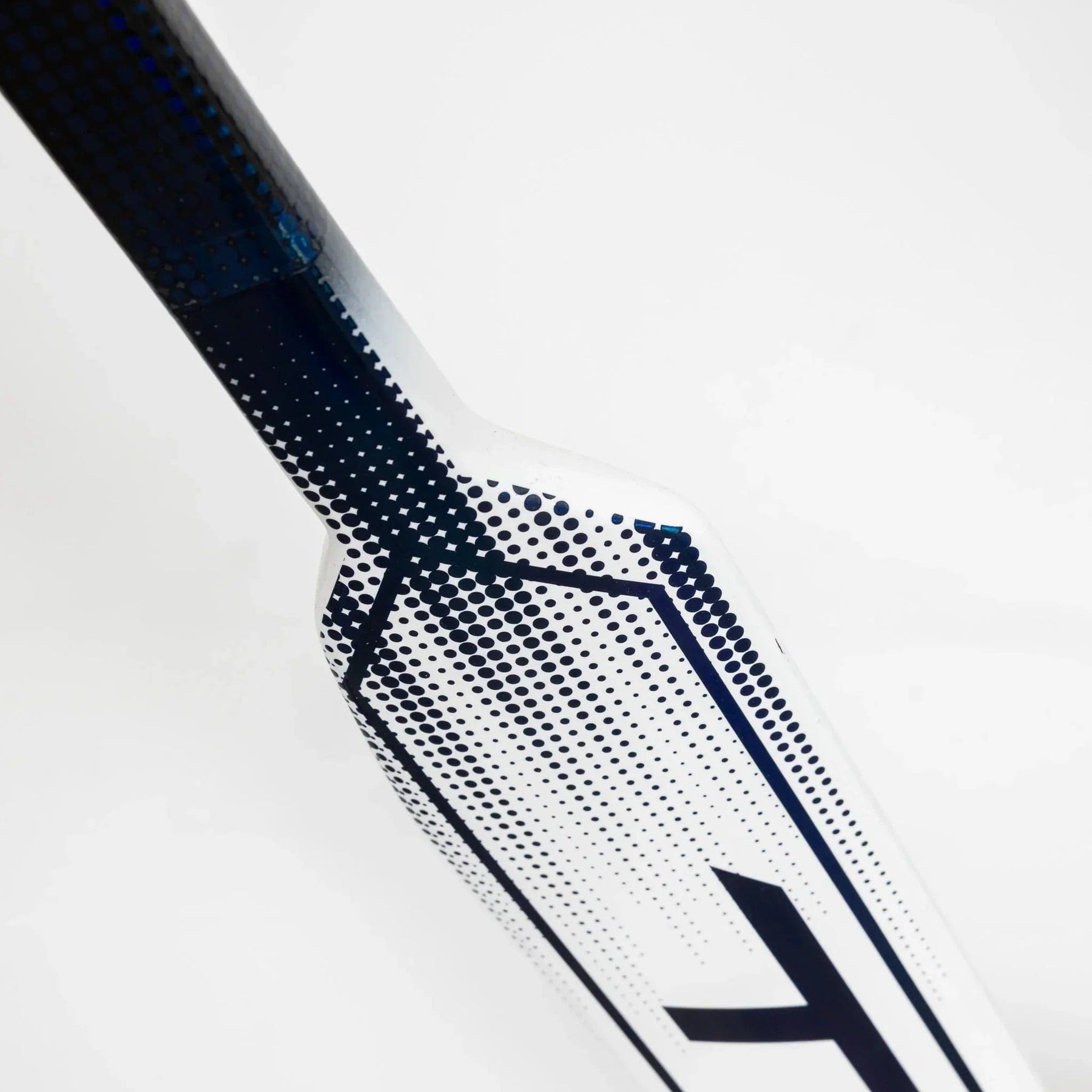 Best price guaranteed.This custom True 9x4 Pro Stock goalie stick is a pro return sample from NHL goalie Elvis Merklikins of the Columbus Blue Jackets. This stick has a White, Blue and Grey graphic inspired by the Blue Jackets, a custom shoulder design, and custom blade pattern with a square toe.