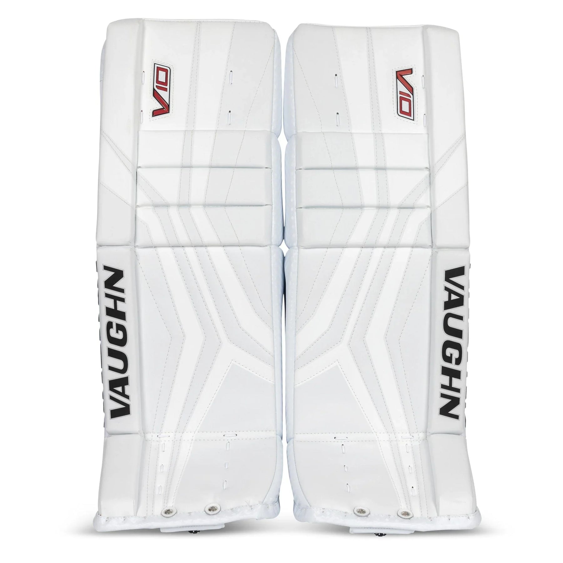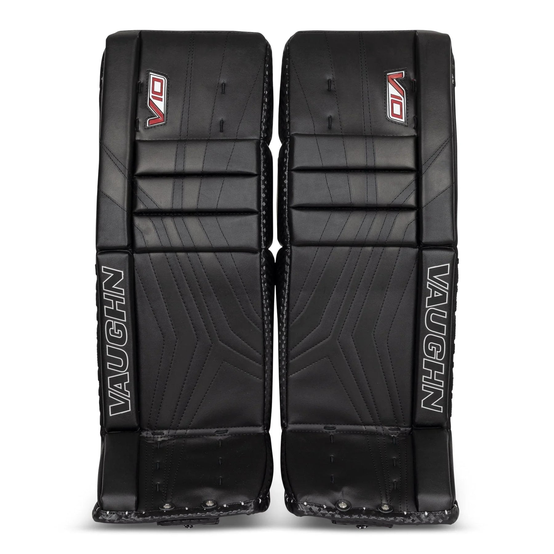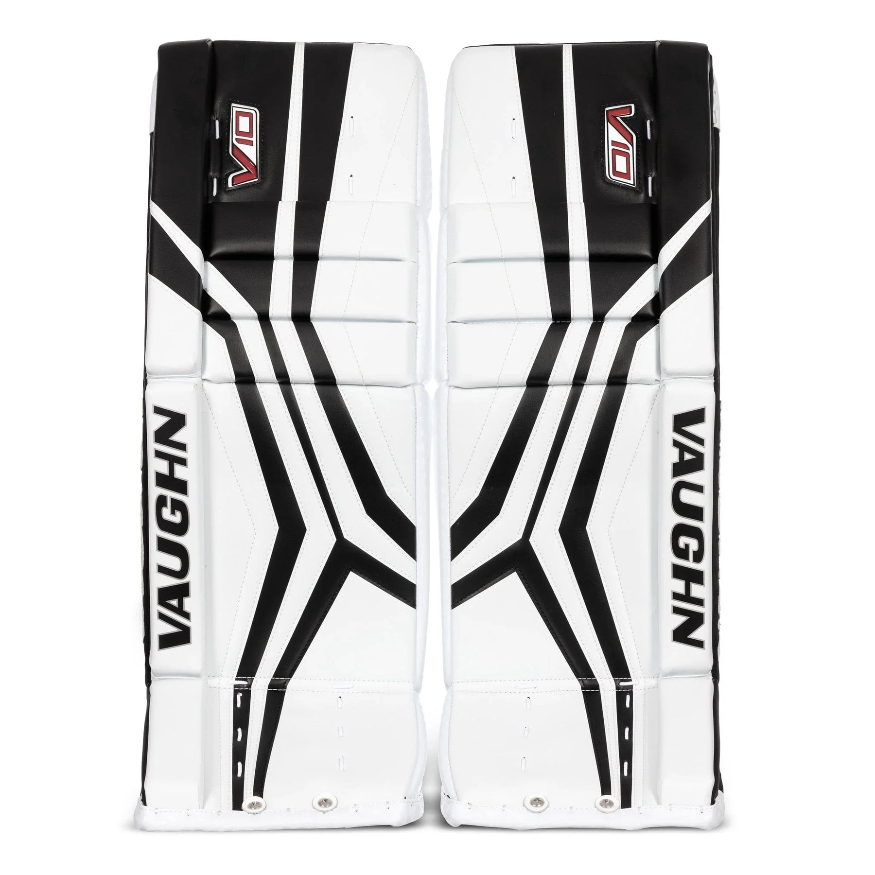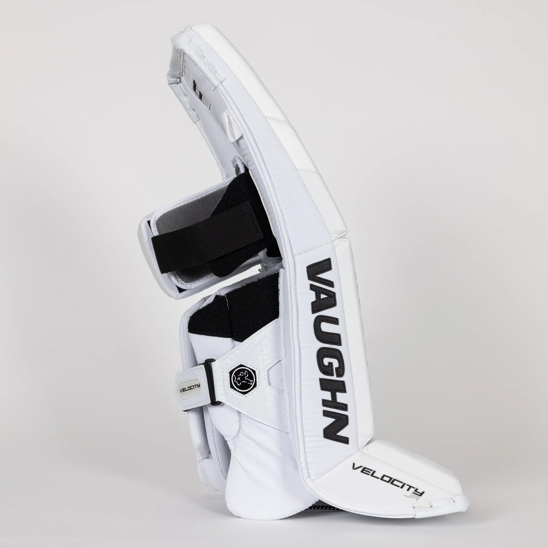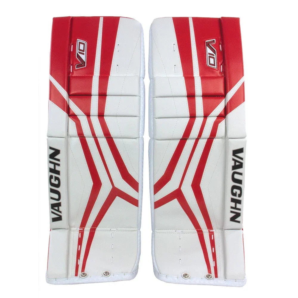 Best price guaranteed.The Vaughn Velocity V10 Junior Goalie Leg Pads boast a firm front surface that enhance active rebounds. It features quick-slide material on the inner pad edge and a bottom trim with the same material. The inner leg cradle is wide and has an extended shape for added comfort. The pad provides extended back leg coverage and showcases a lower profile outside roll with a single break style. With a 2-inch thigh rise and square-shaped inside edge, the pad offers improved coverage. Its outer panel profile is thinner for reduced bulk and it is pre-curved for precision.